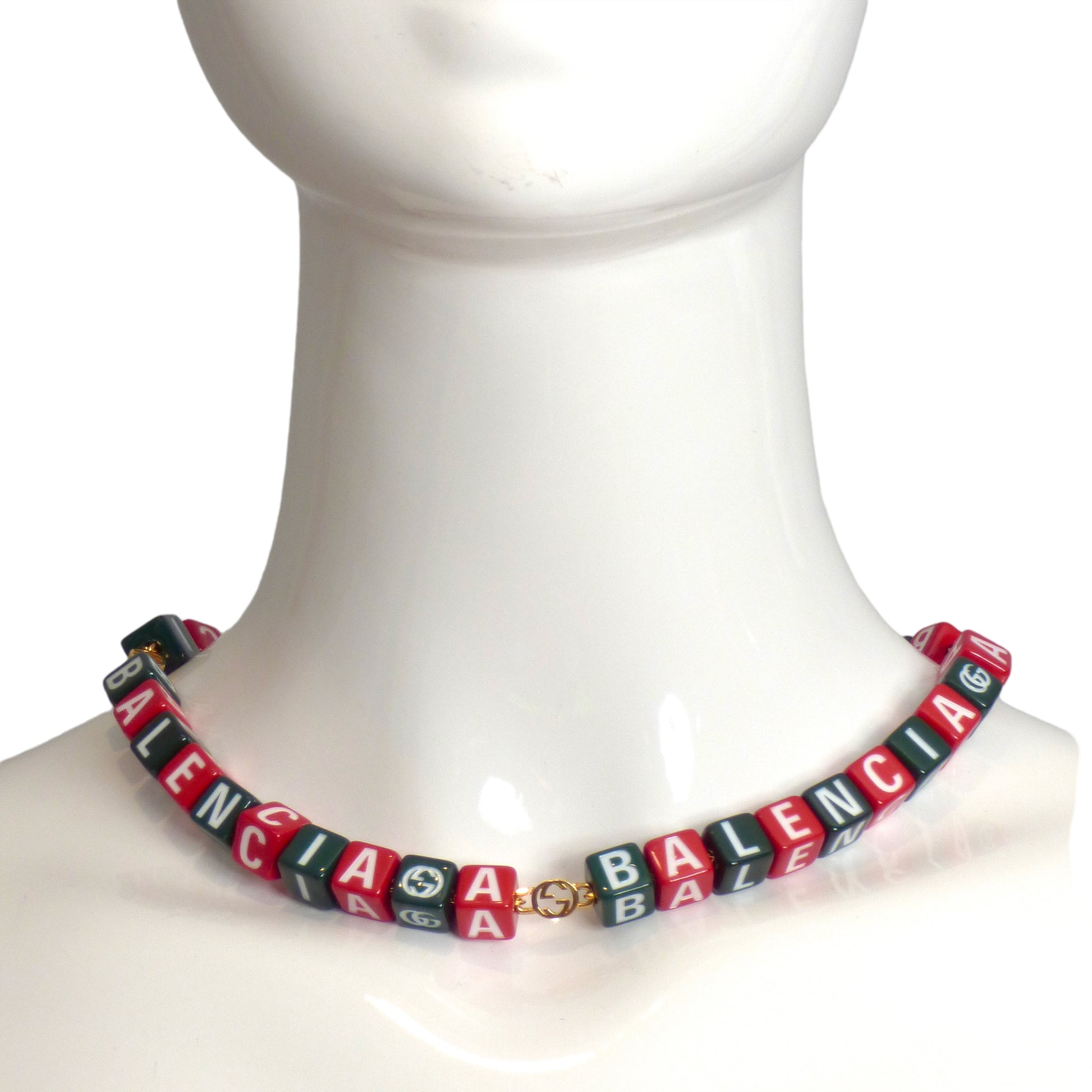 Description: From Gucci's 100th Anniversary Aria collection comes the Hacker project collaboration with Balenciaga! The record sell out collection consisted of this symbols bracelet. The necklace consists of alternating red and green dice with each letter of "Balenciaga" on every cube and the Gucci logo in place of the "G". The dice are connected to a gold chain with a locking clasp and additional "GG" charms. Still has the original box.