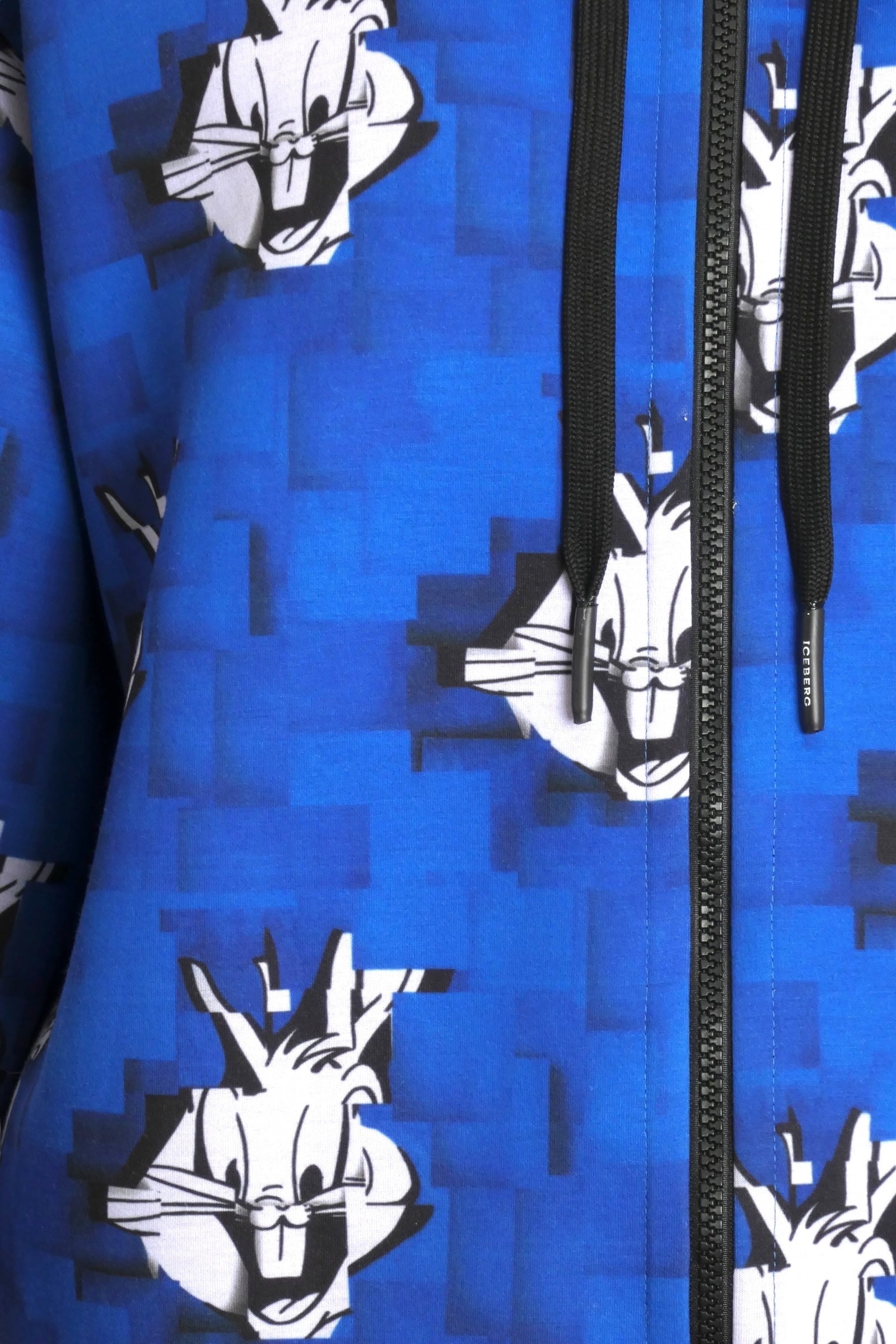 Description: Embrace playful style with this Iceberg Bugs Bunny hoodie jacket. Crafted from comfortable neoprene, it features a striking computer-generated pixilated Bugs Bunny graphic that blends nostalgia with modern design. The front zipper closure offers ease and versatility, while black knit waistband and cuffs ensure a snug fit. Perfect for those who appreciate unique, high-quality casual wear that sparks joy and individuality.