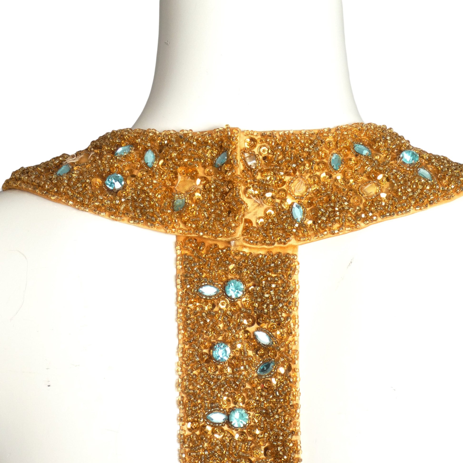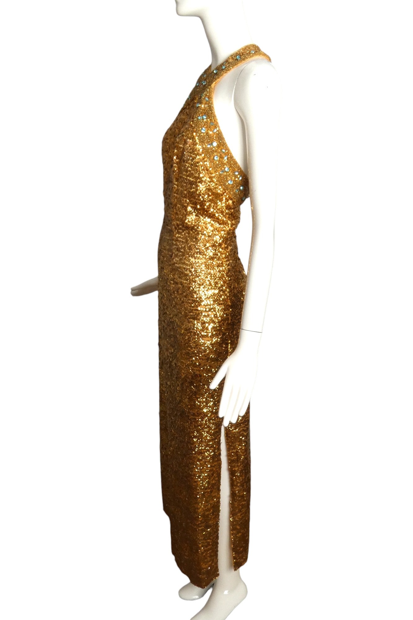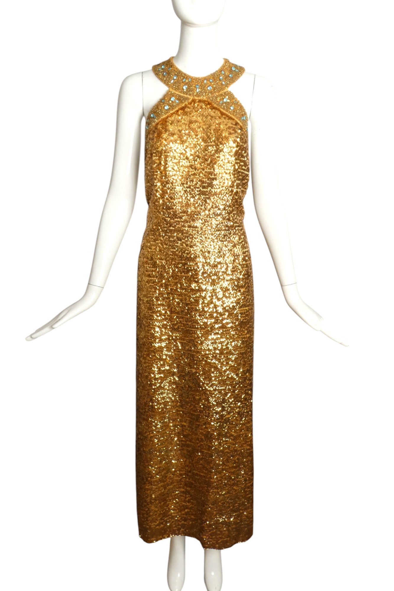 Description: Captivate attention at your upcoming formal event with this exquisite late 1960s evening attire. This gold satin gown features a complete overlay of luminous gold sequins for maximum visual impact. The distinctive halter design showcases a neckband and upper panel adorned with brilliant gold beadwork and blue rhinestone accents, creating a sophisticated vintage statement piece.