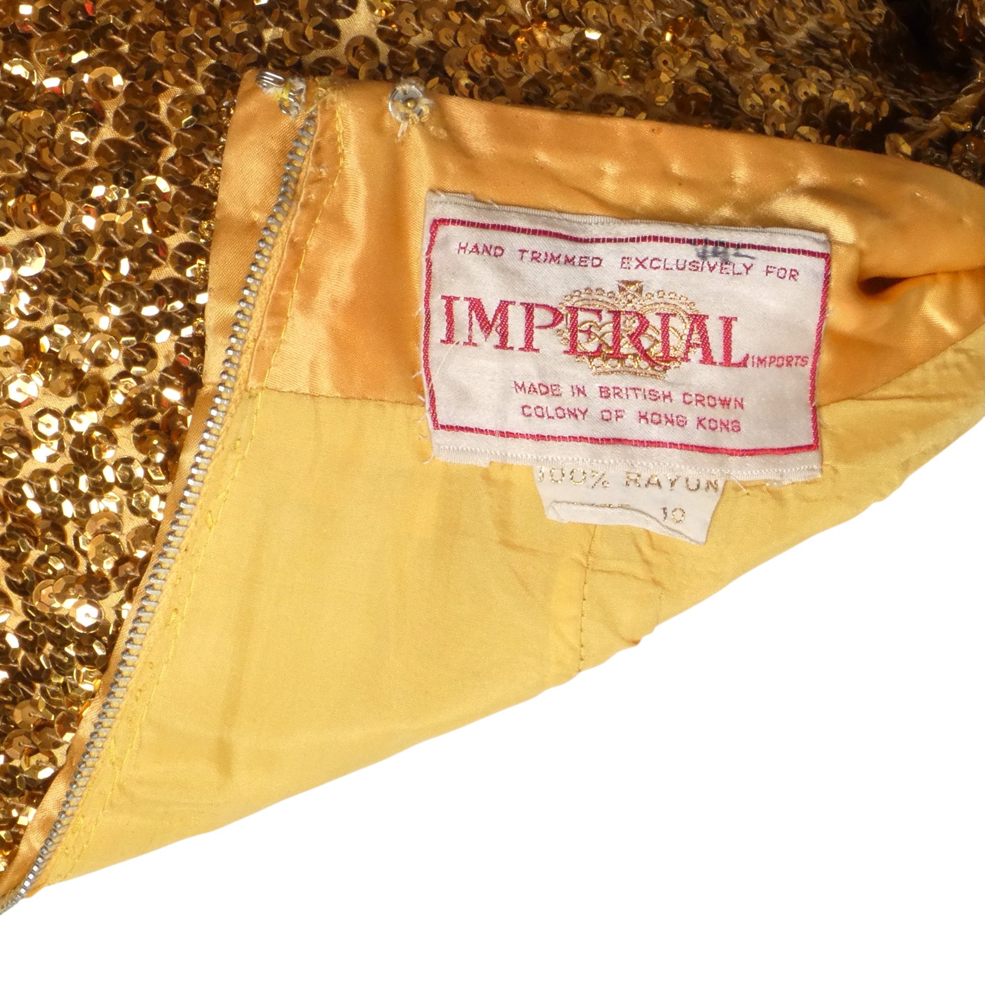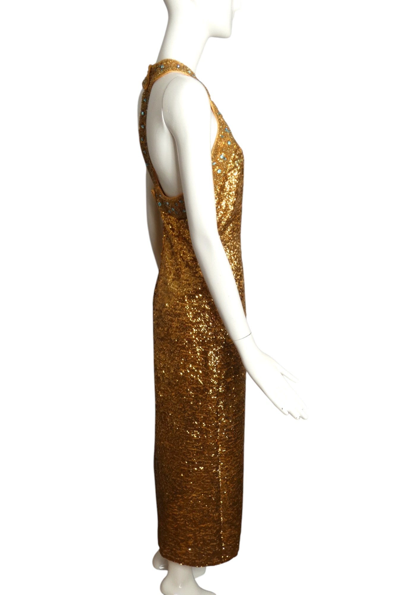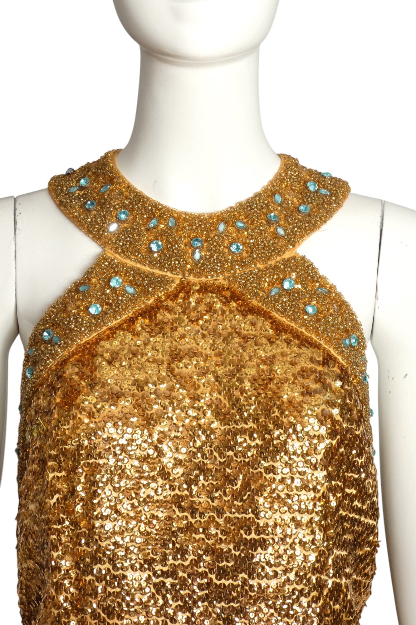 Description: Captivate attention at your upcoming formal event with this exquisite late 1960s evening attire. This gold satin gown features a complete overlay of luminous gold sequins for maximum visual impact. The distinctive halter design showcases a neckband and upper panel adorned with brilliant gold beadwork and blue rhinestone accents, creating a sophisticated vintage statement piece.