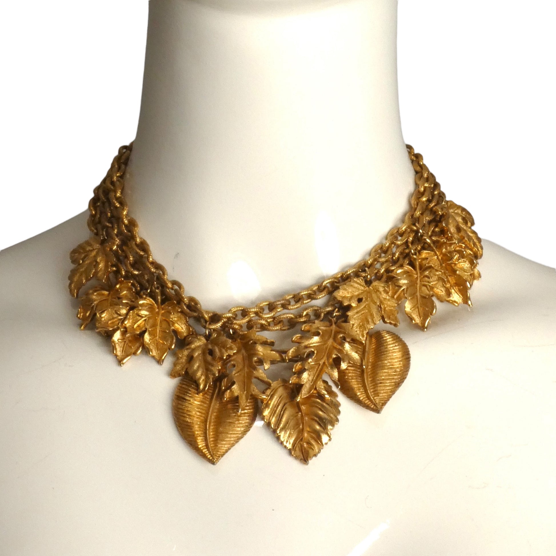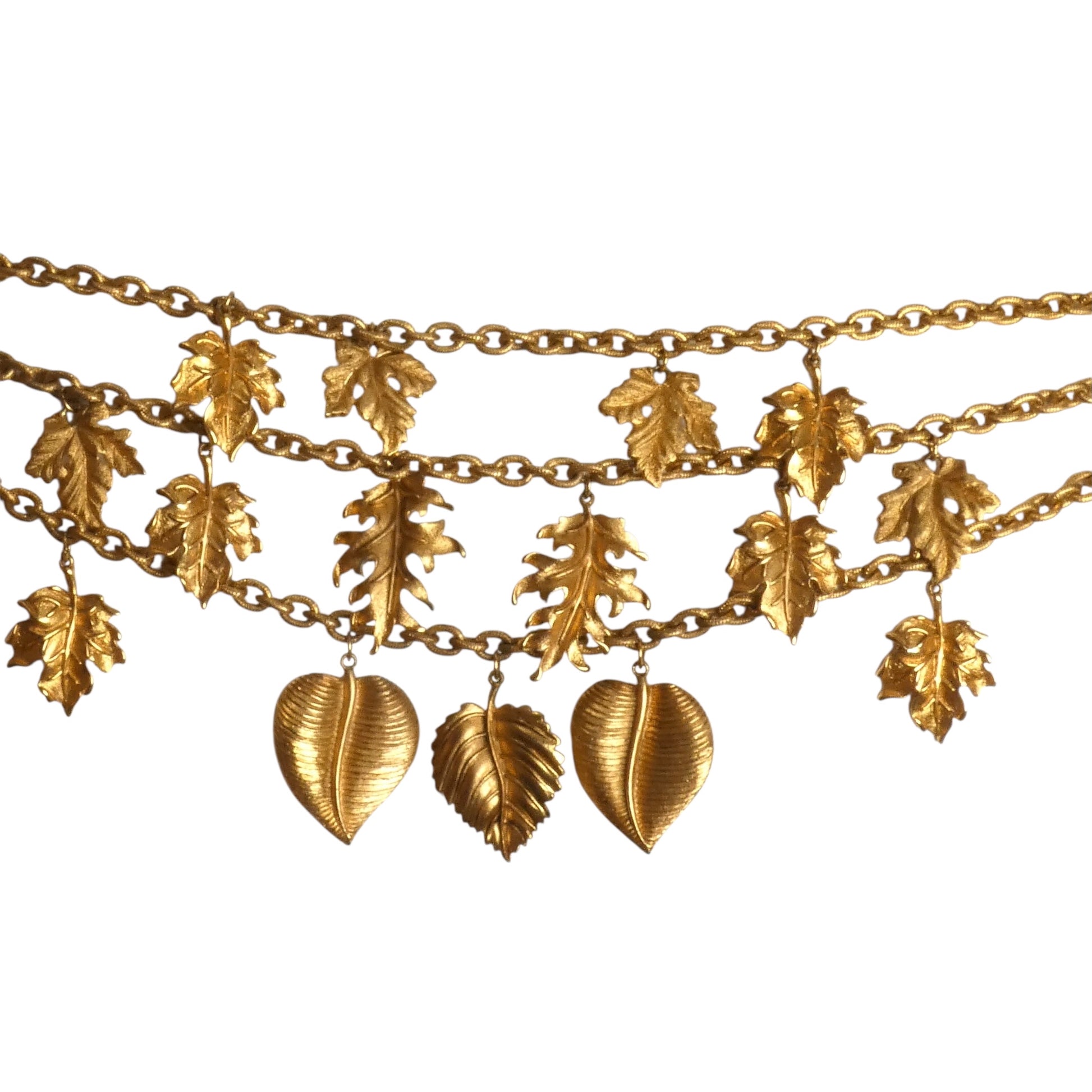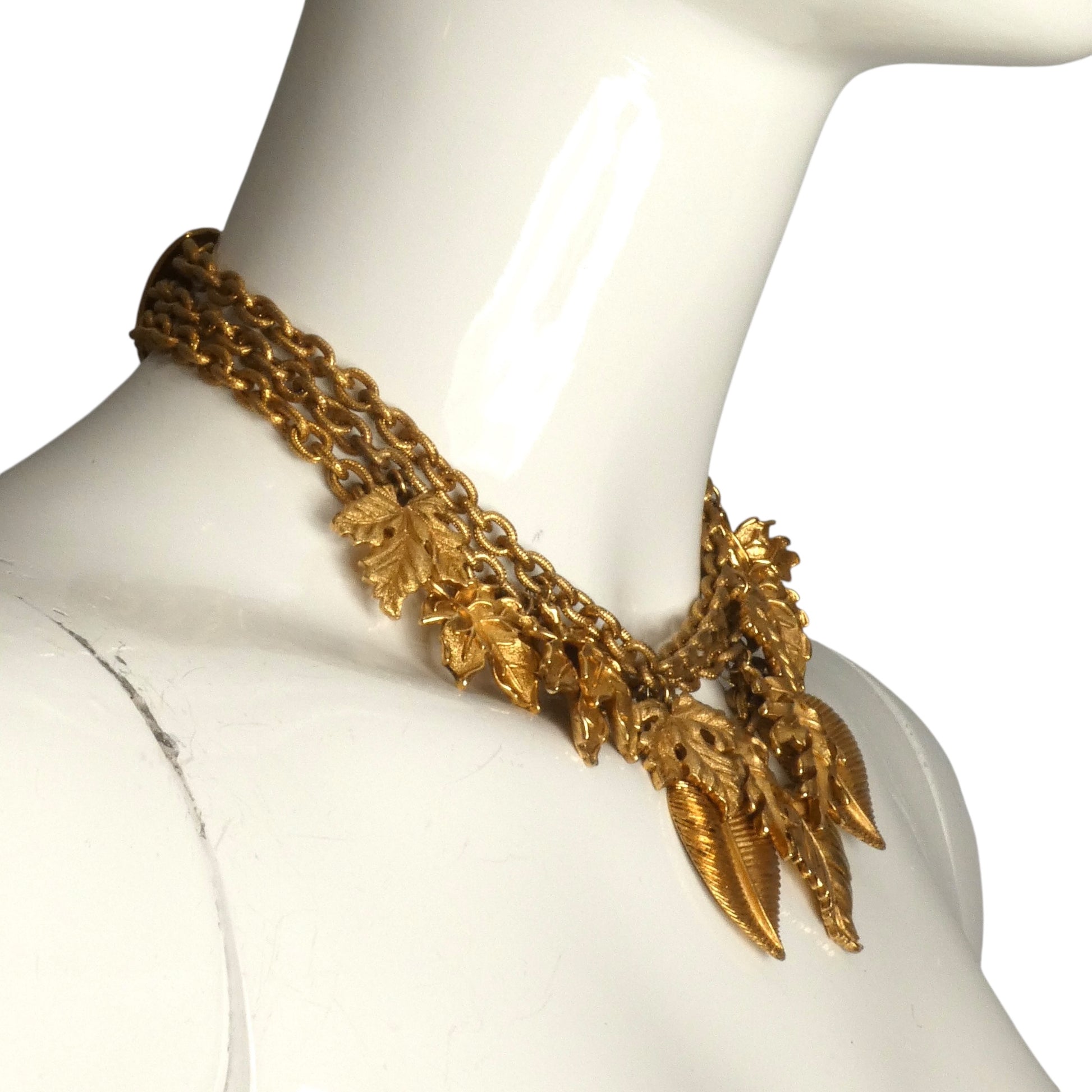 Description: This exquisite 1990s Jay Feinberg choker features three gold gilt chains adorned with large, detailed gold gilt leaves that cascade gracefully from each strand. Designed to complement autumnal styles, the necklace closes securely with a hook clasp, offering both seasonal charm and sophisticated elegance.