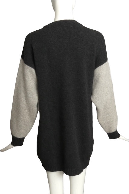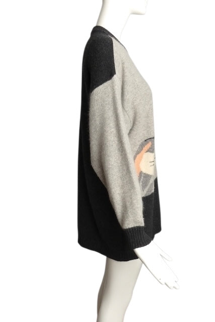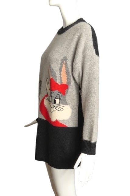 Description: This playful 1990s tunic sweater blends warmth and charm with soft wool in a cozy charcoal and dove grey. Featuring Bugs Bunny and Lola in detailed intarsia knit, the design comes alive with embroidered accents and appliqué noses, perfect for adding a fun, nostalgic touch to your wardrobe. Its tunic length offers extra comfort and style for chilly days.