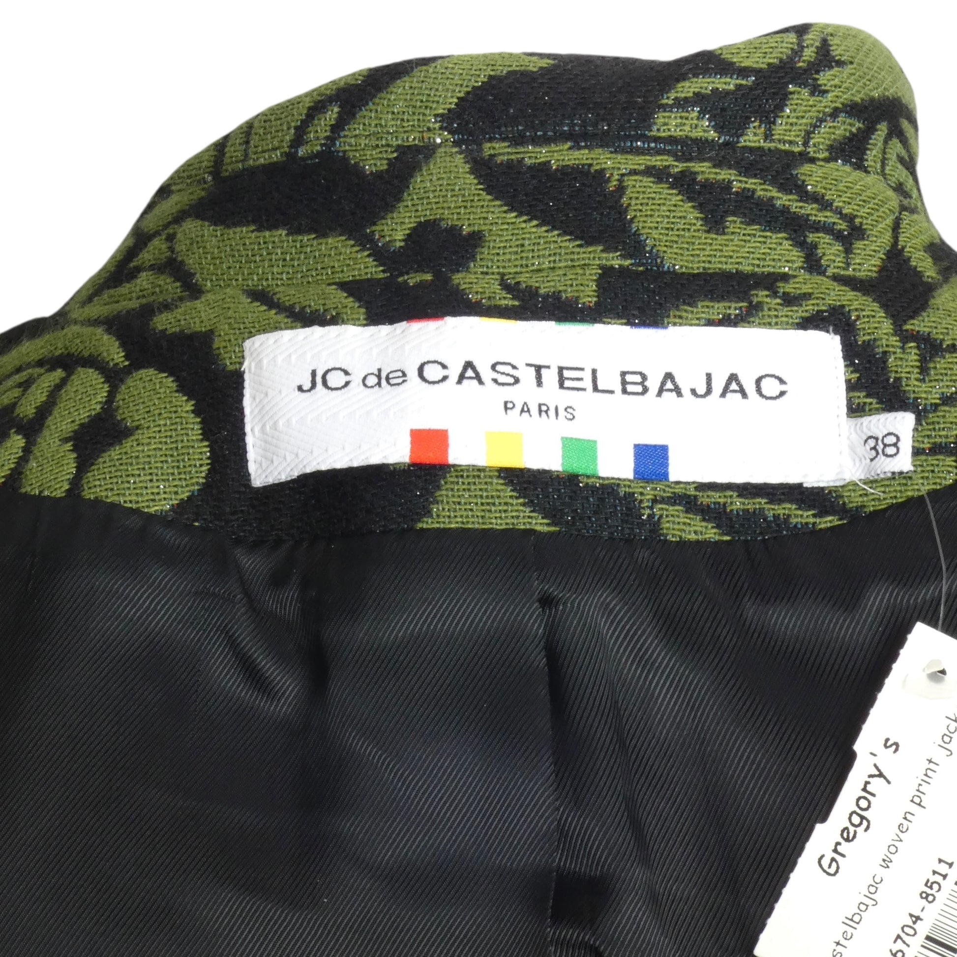 Description: Step into sparkle with this JC de CASTELBAJAC blazer from the Fall 2013 collection. In lively green floral brocade with a subtle twinkle woven throughout, it charms with tiny notched lapels and a sleek snap closure at the waist. Tailored darts create a flattering fit, while inset pockets add a touch of practicality. Brand new with store tags still attached.