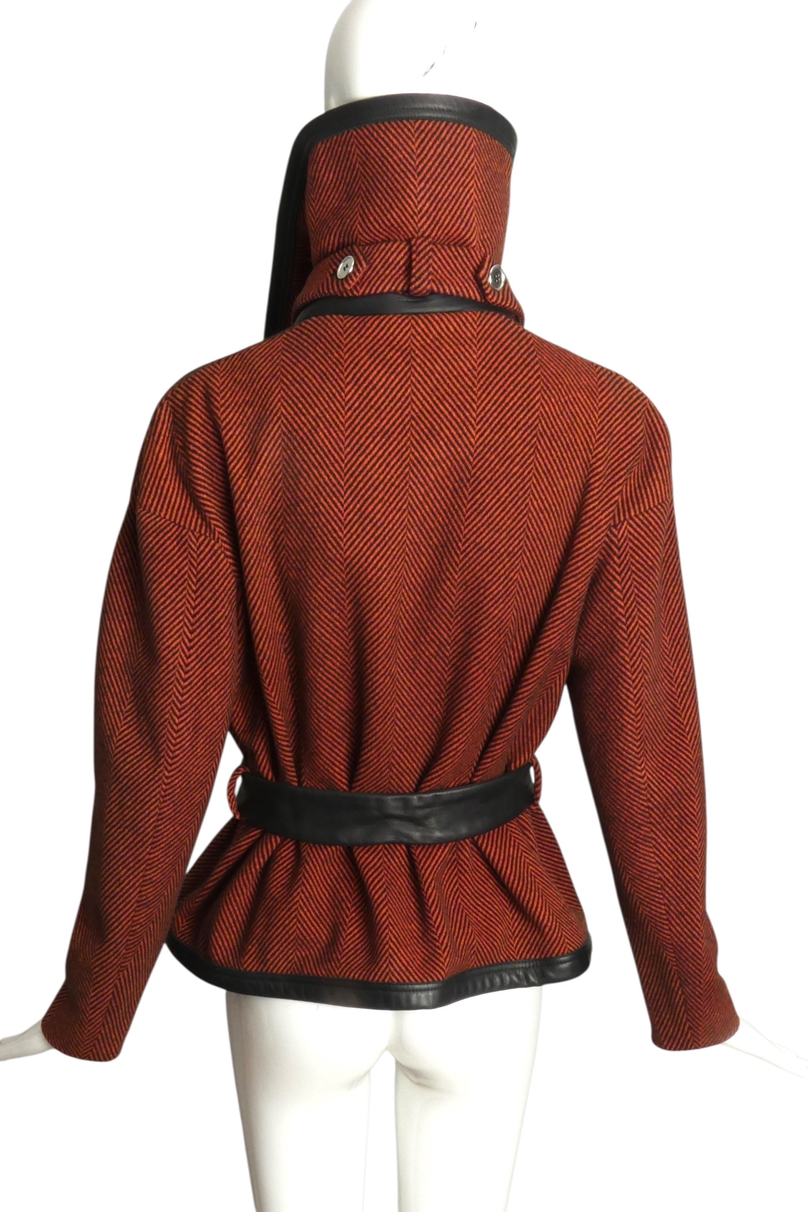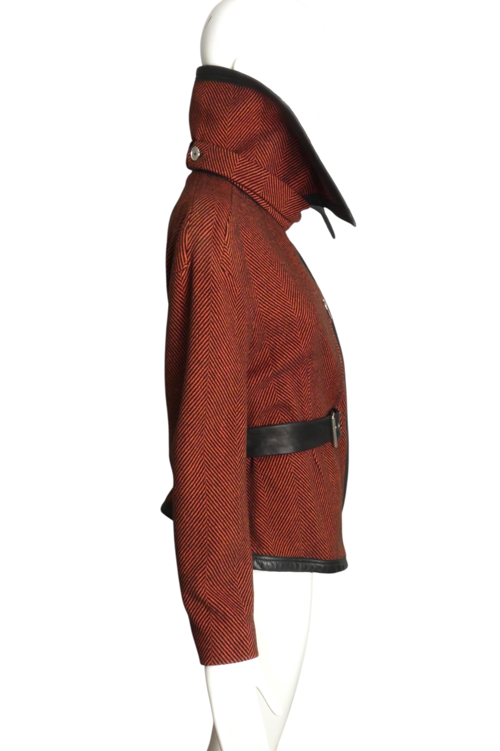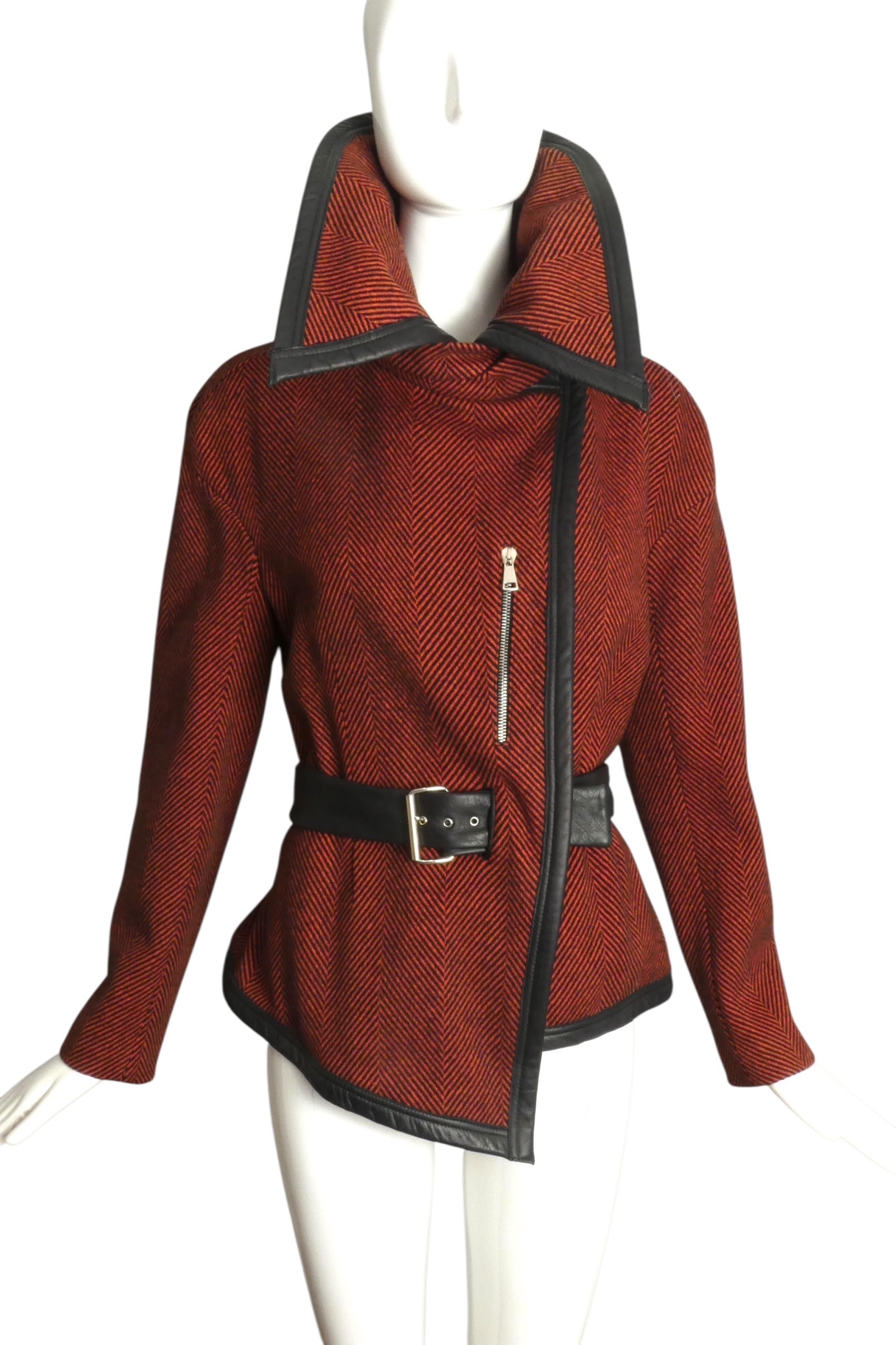 Description: Step out in style with this playful JC de CASTELBAJAC wool moto jacket, dazzling in a bold red and black chevron pattern. Trimmed in sleek black leather, it features a dramatic fluted collar with a double-button neck strap and edgy asymmetrical zipper front. The leather belt cinches the waist perfectly, sliding through a front loop for a custom fit. Brand new with original tags, this treasure brings a fun, fashionable twist to your wardrobe.