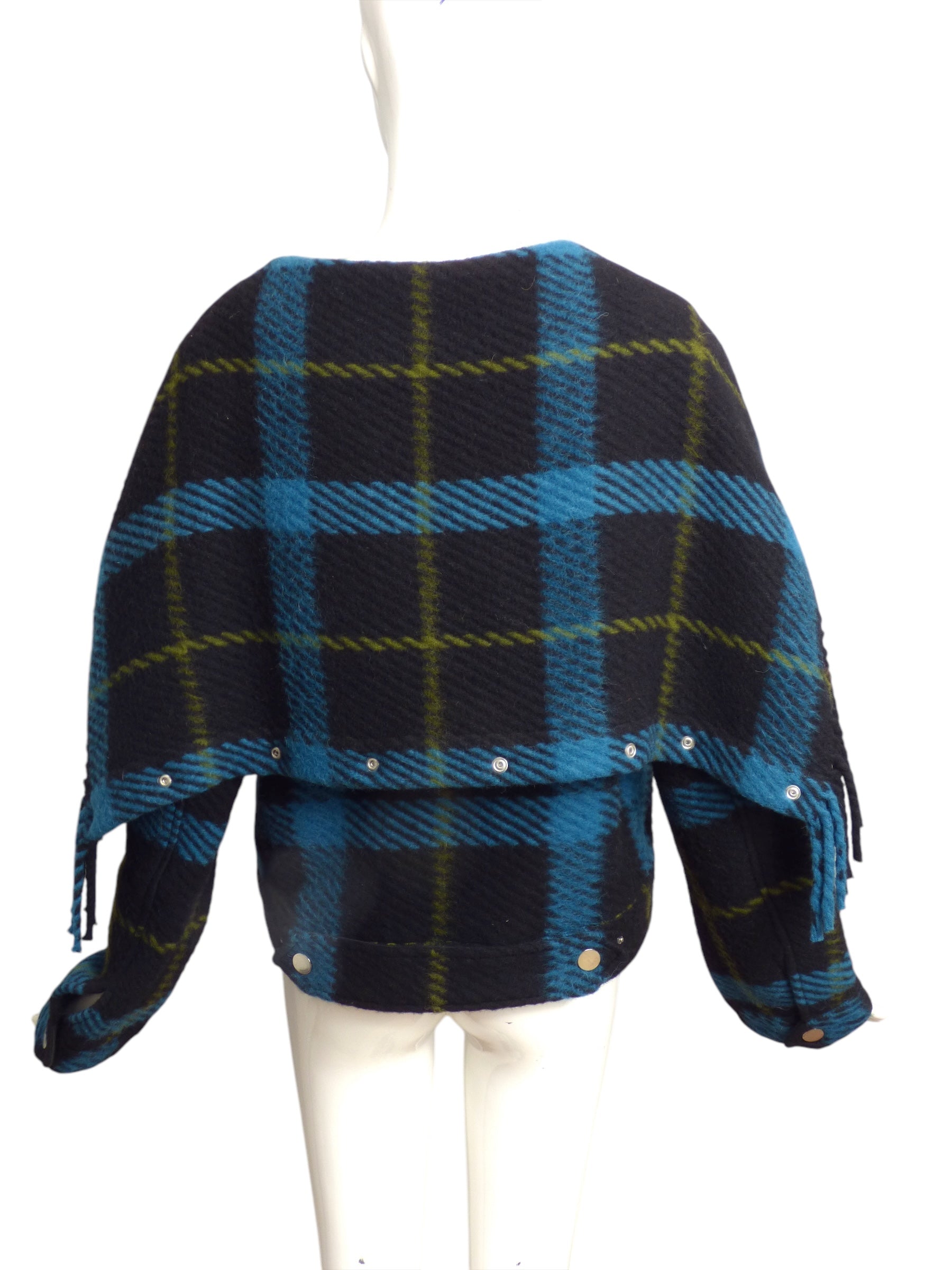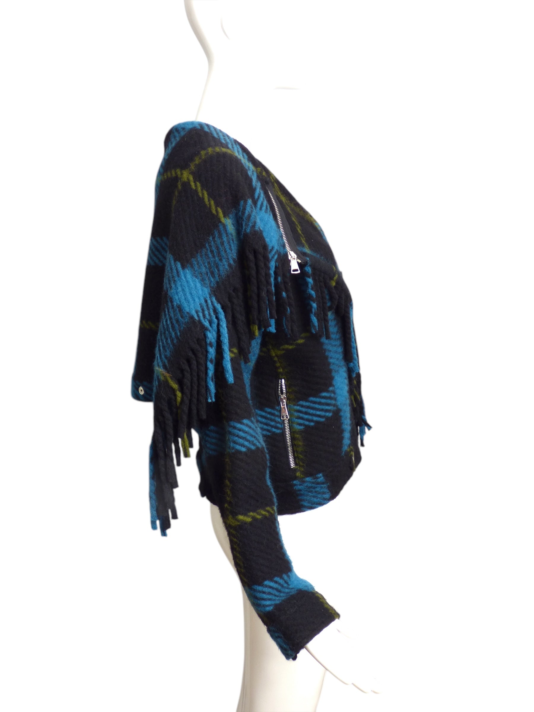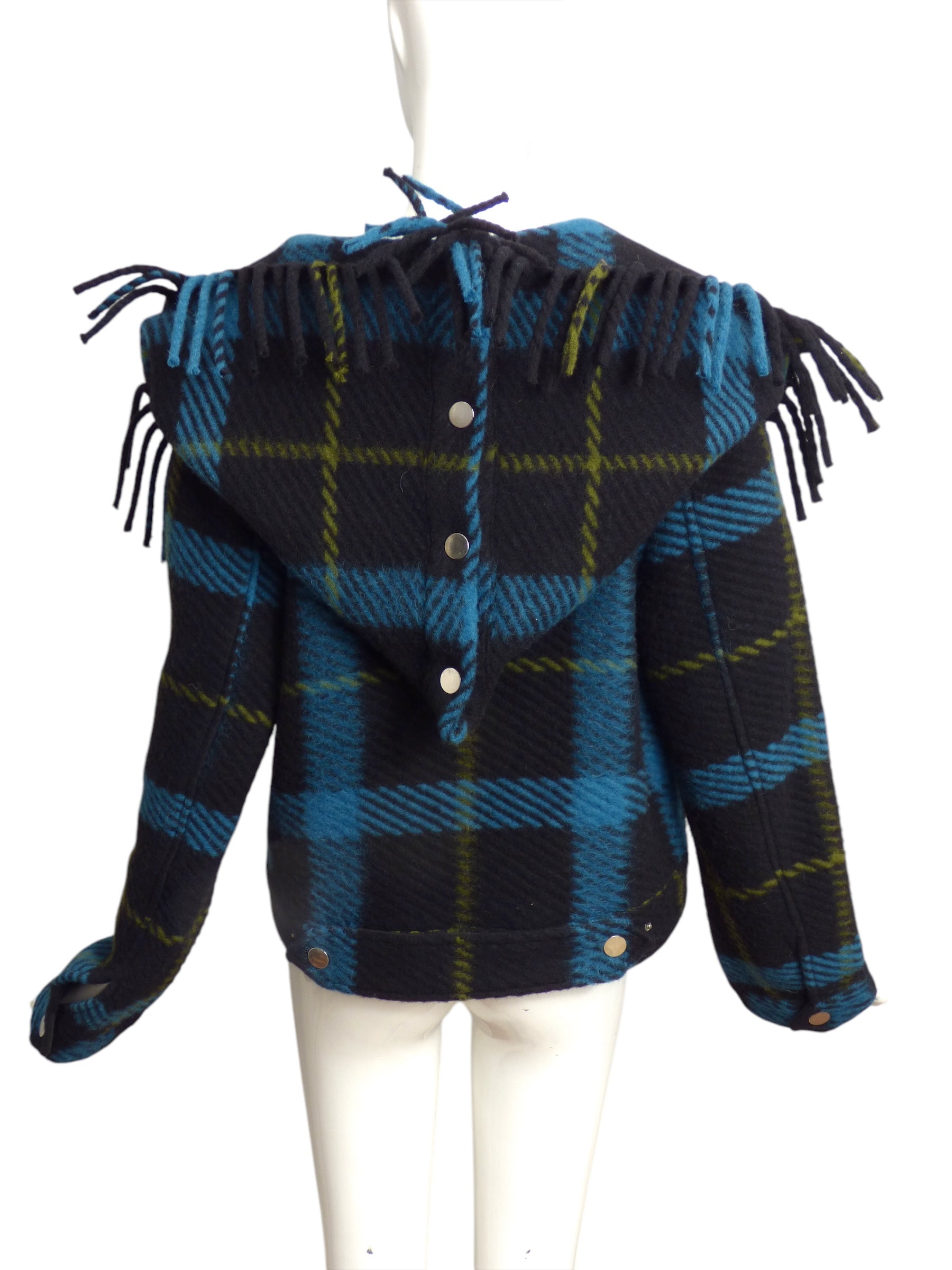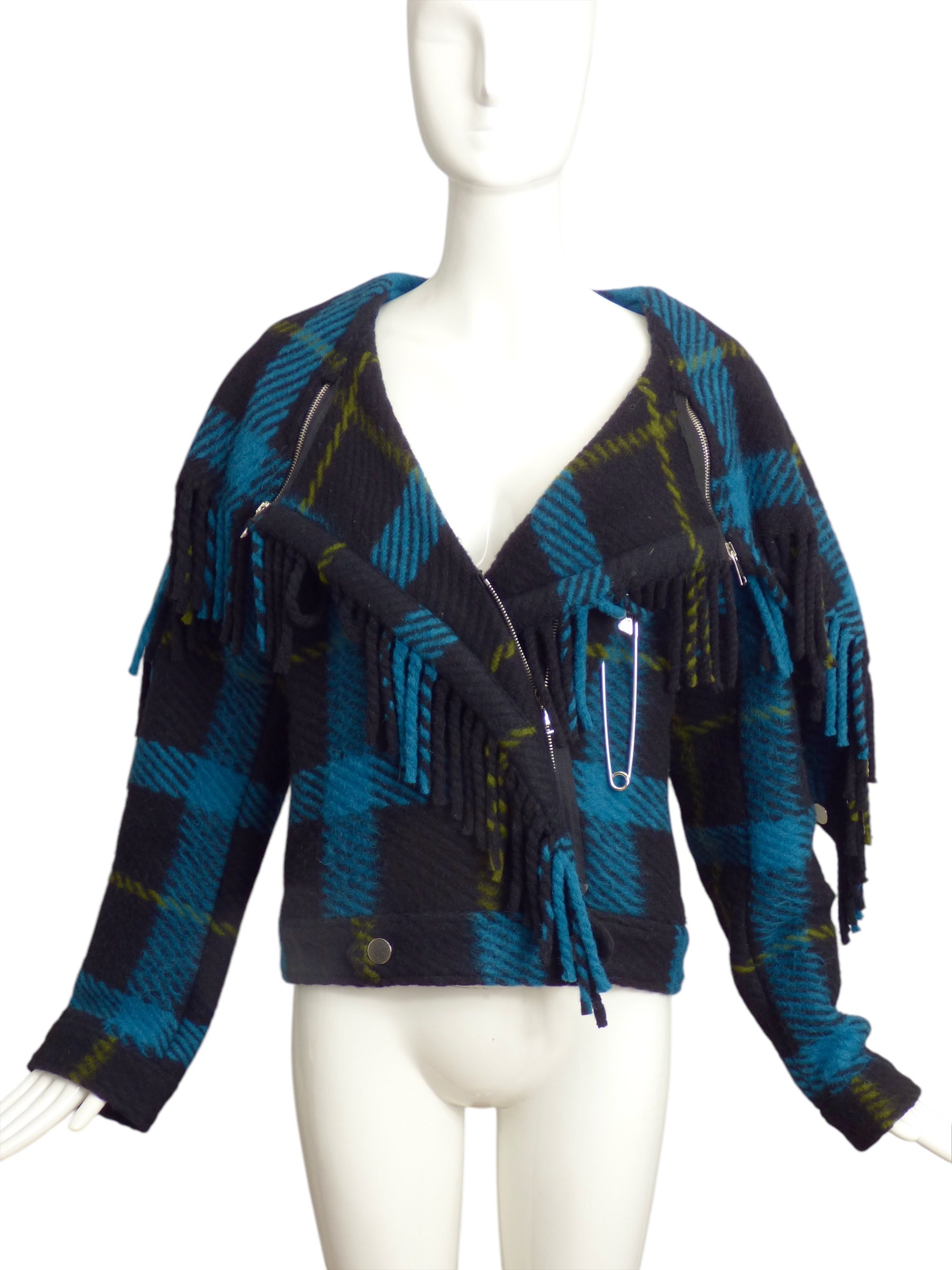 Description: Stunning wool plaid moto jacket in blue and black, accented with shiny chrome zippers. The jacket boasts fold-back revers with top zippers that release the back collar, transforming it into a luxurious hood. Sleek inset pockets feature zipper closures, while a wide waistband adds a touch of sophistication. Adorned with a large safety pin, this jacket exudes elegance. It is brand new, with store tags attached and an original price tag of $1,395.00.