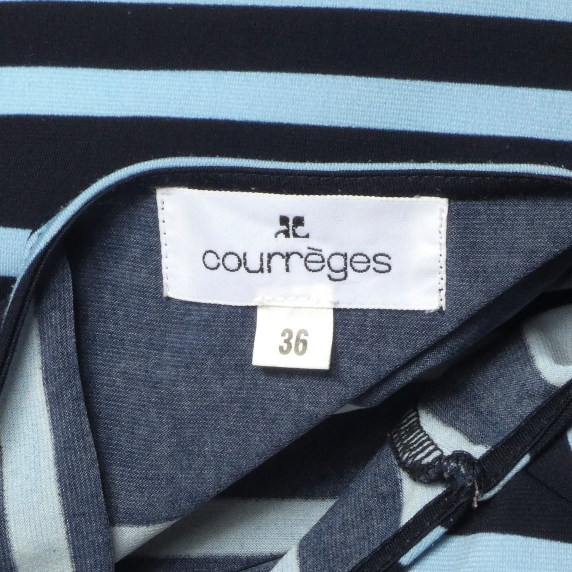 Description: A modern, easy silhouette from Courrèges, this striped jersey dress reflects the brand’s signature clean lines and understated graphic appeal. Crafted in a soft, fluid jersey knit, it features a navy base with pale blue horizontal stripes that create a subtle optical rhythm across the body. The design is cut with a relaxed, slightly A-line shape, enhanced by gentle pleating at the waist that adds movement without structure. Cap sleeves and a simple round neckline keep the look minimal and versatile, while the drape of the fabric gives it a comfortable, everyday wearability.