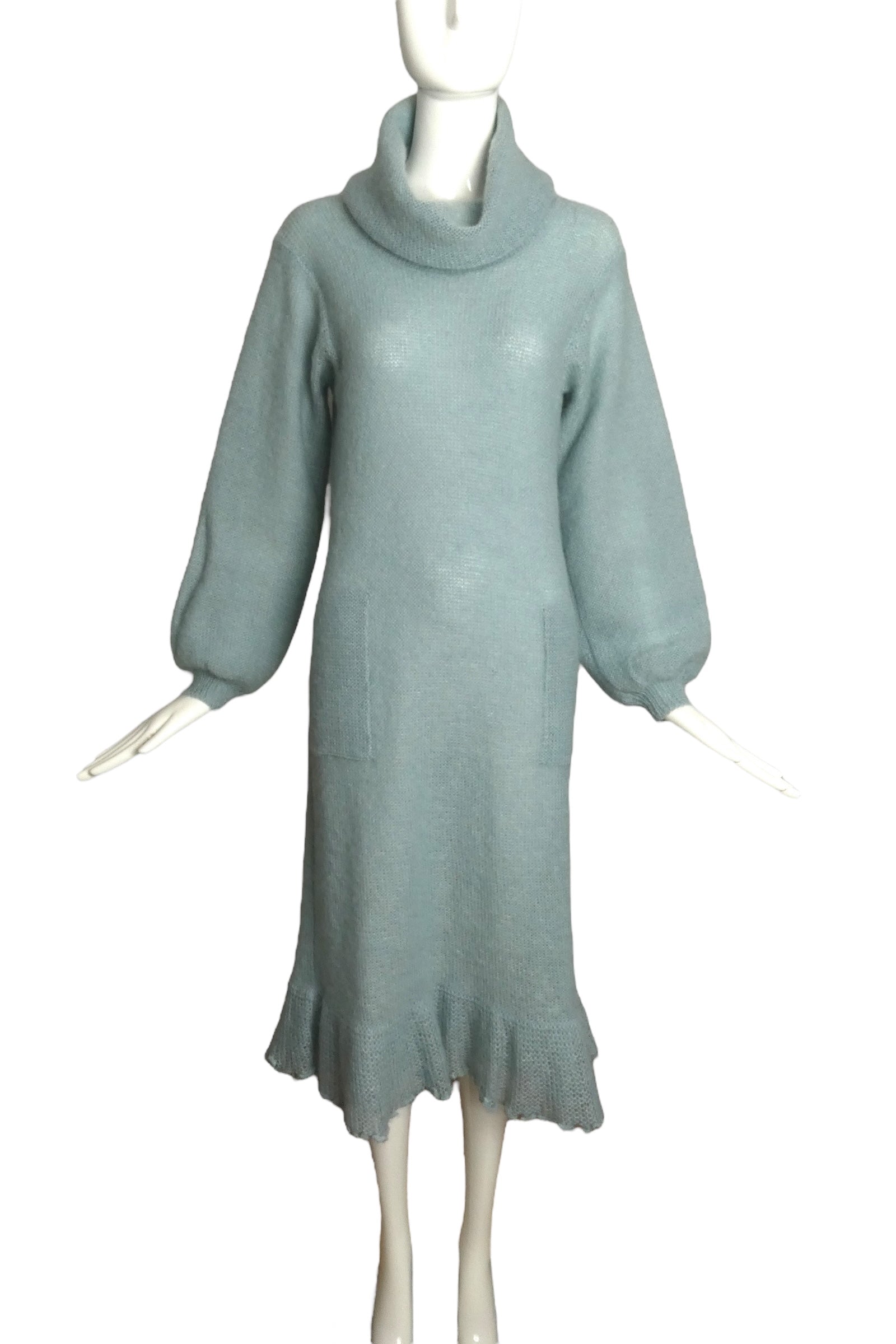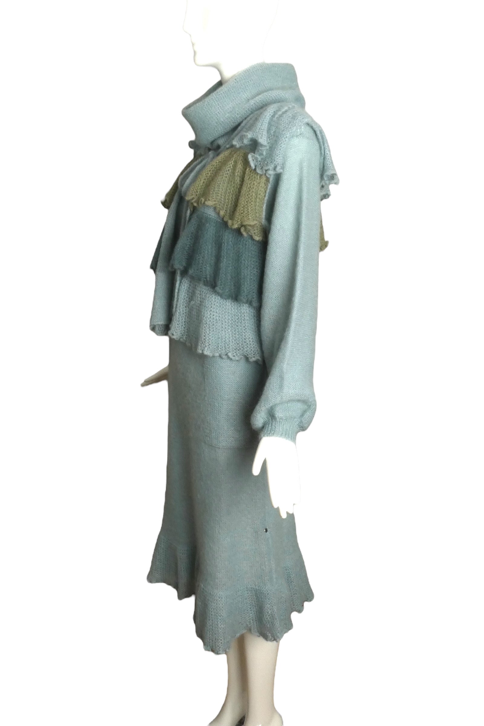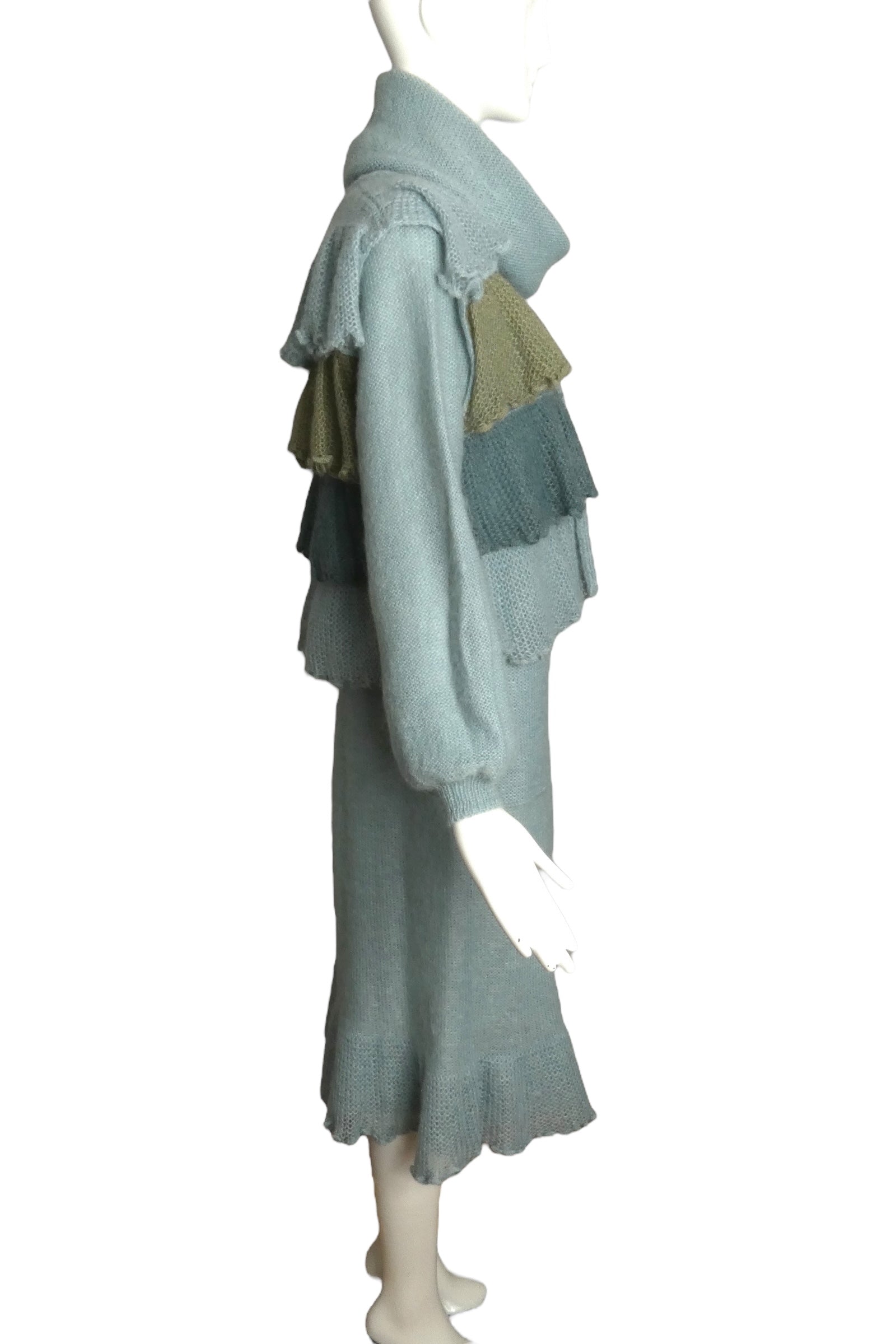 Description: This stylish 1970s ensemble features a mohair-blended knit dress paired with a coordinating vest. The dress showcases a draped cowl neckline and a straight silhouette that finishes with a ruffled hem. Its voluminous sleeves are cinched at the wrists with narrow bands. Complementing the dress, the vest displays cascading ruffled rows in alternating colors and secures with a string tie at the neckline.
