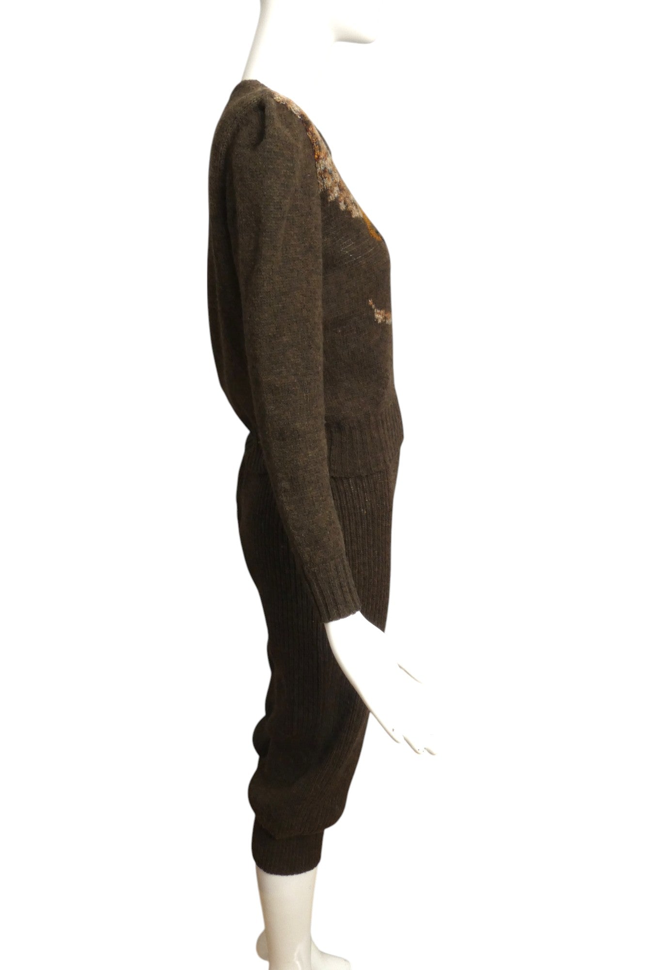 Description: Step back into the playful charm of the early '80s with this delightful KRIZIA two-piece wool knit set. The cozy brown sweater features a whimsical design that looks like bird talons poised to snatch up a tiny mouse, adding a fun twist to your wardrobe. Paired with matching knickers, these pants offer an elastic waistband and snug cuffs for comfort and style. Perfect for adding vintage flair with a dash of mischief to any outfit.