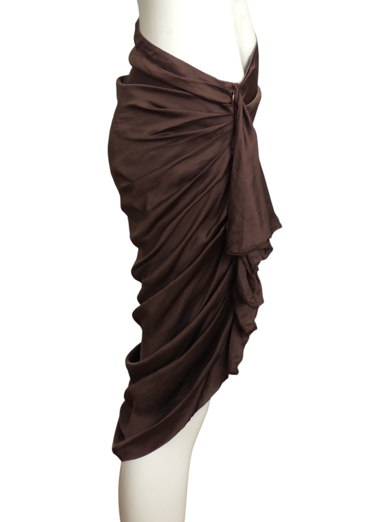 Description: Embrace the thrill of the unknown with this stunning brown sarong-style skirt from LANVIN's 2010 collection. Its silky draping and side ruching exude a sense of daring and movement, while its lack of waistband adds a bold touch. Be prepared to turn heads with the cascading ruffles that adorn this unique piece.