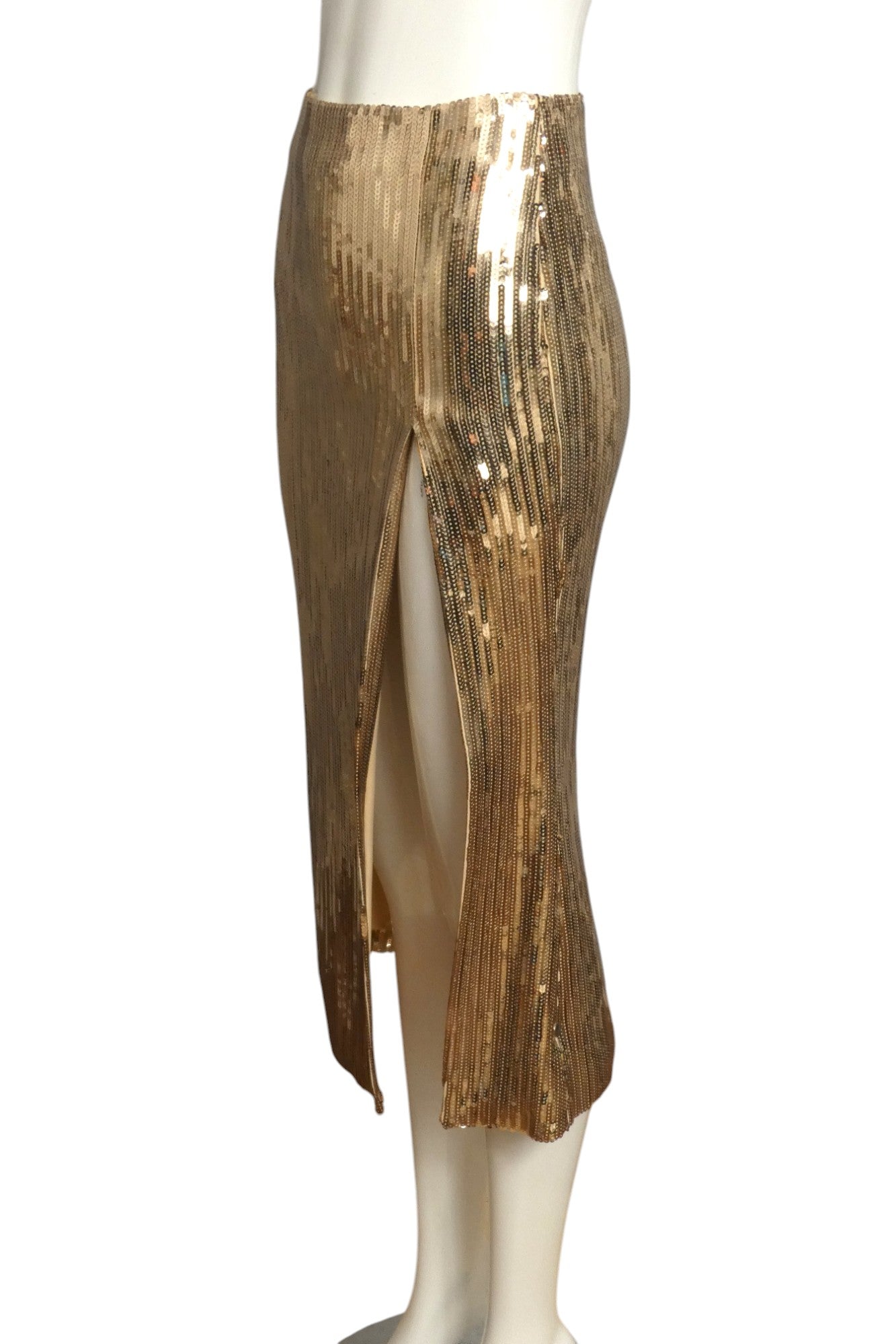 Description: Elevate your evening wardrobe with the stunning LaQuan Smith gold sequin Skirt. This high-rise midi skirt is adorned with all-over shimmering sequins that catch the light beautifully, ensuring you stand out at any event. The daring thigh-high slit adds a touch of allure, while the fluted hem creates a graceful silhouette. With a convenient zip closure, this skirt combines style and ease, making it a must-have for your next night out. Embrace the glamour and make a statement in this exquisite piece!