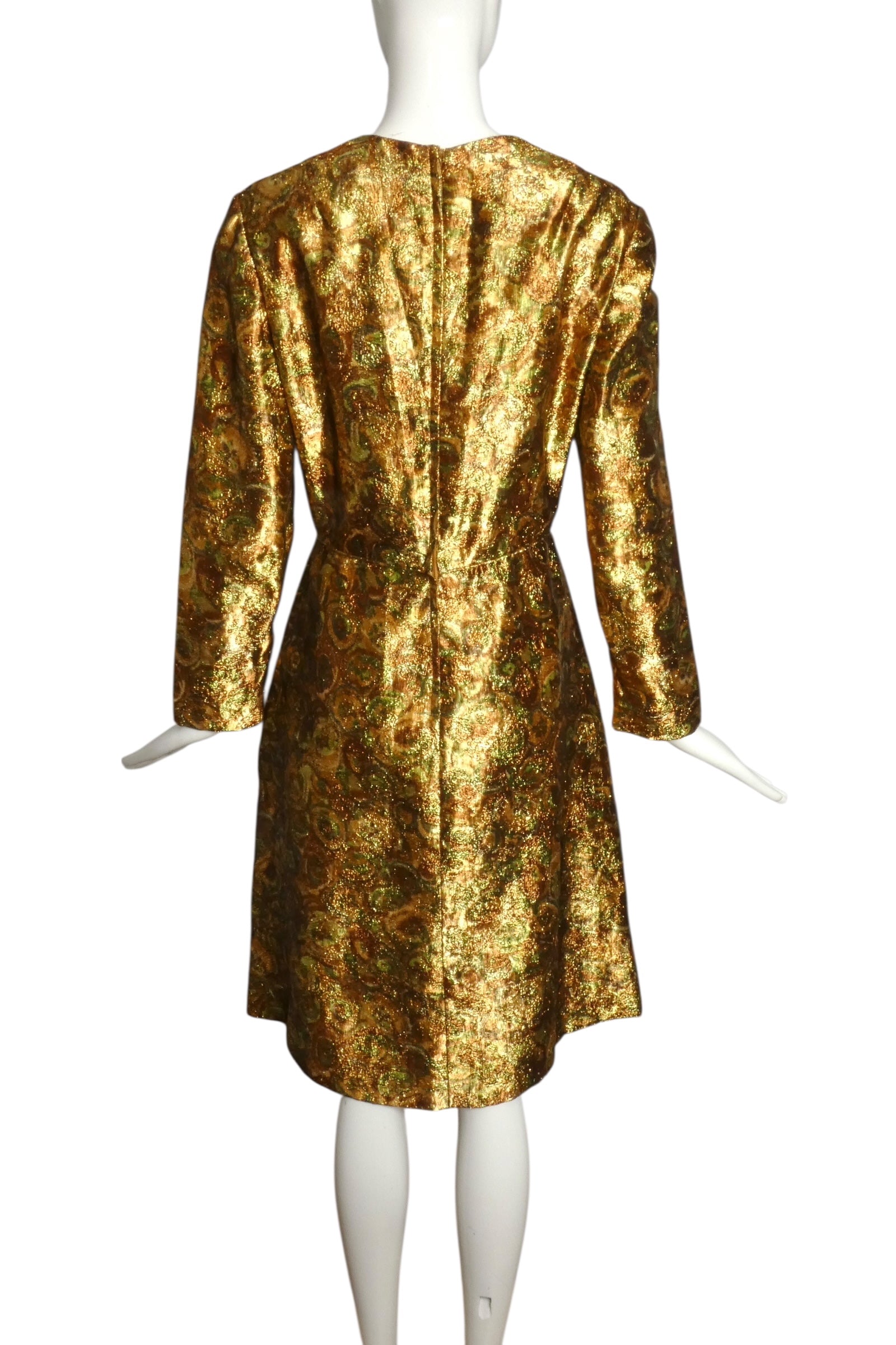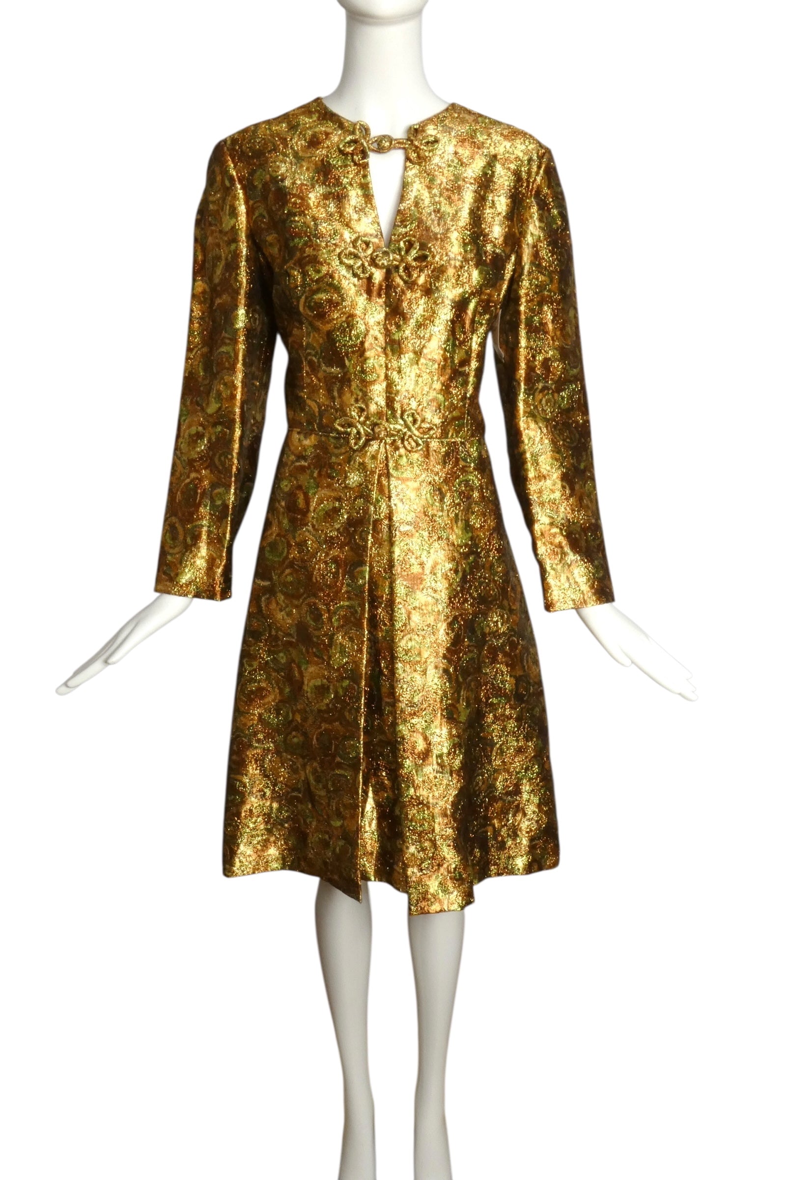 Description: This stunning late 1960s cocktail dress by Lee Jordan epitomizes the era's glamorous sophistication. Crafted from printed metallic lamé, the fabric shimmers with luxurious dimension and movement. The dress features a flattering V-neckline adorned with substantial frog fasteners that serve as both functional closures and decorative elements down the dart-fitted bodice. A gored skirt construction provides elegant drape from the piped waistline, while an inverted front pleat adds architectural interest and subtle movement. A refined example of 1960s cocktail elegance that remains timelessly wearable.