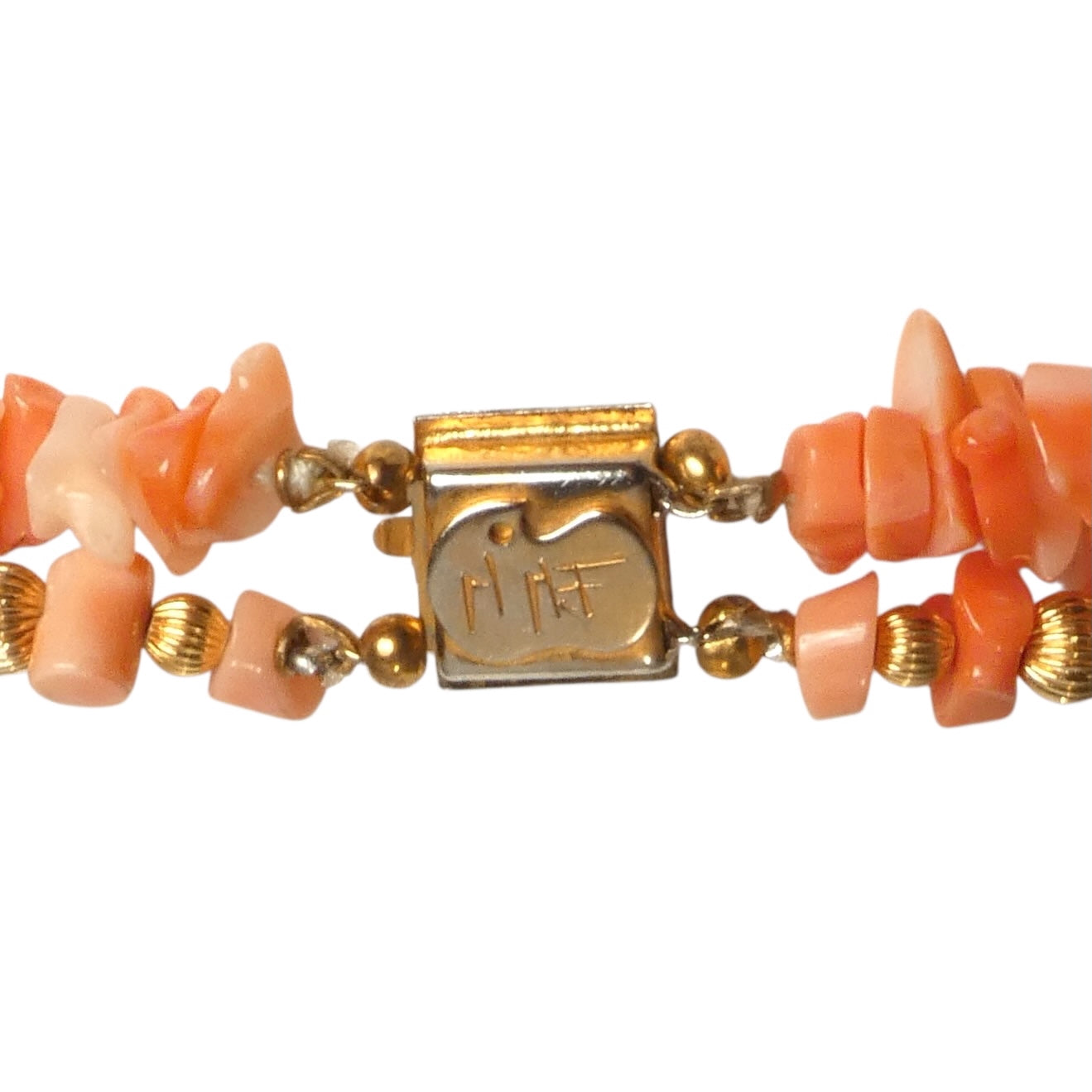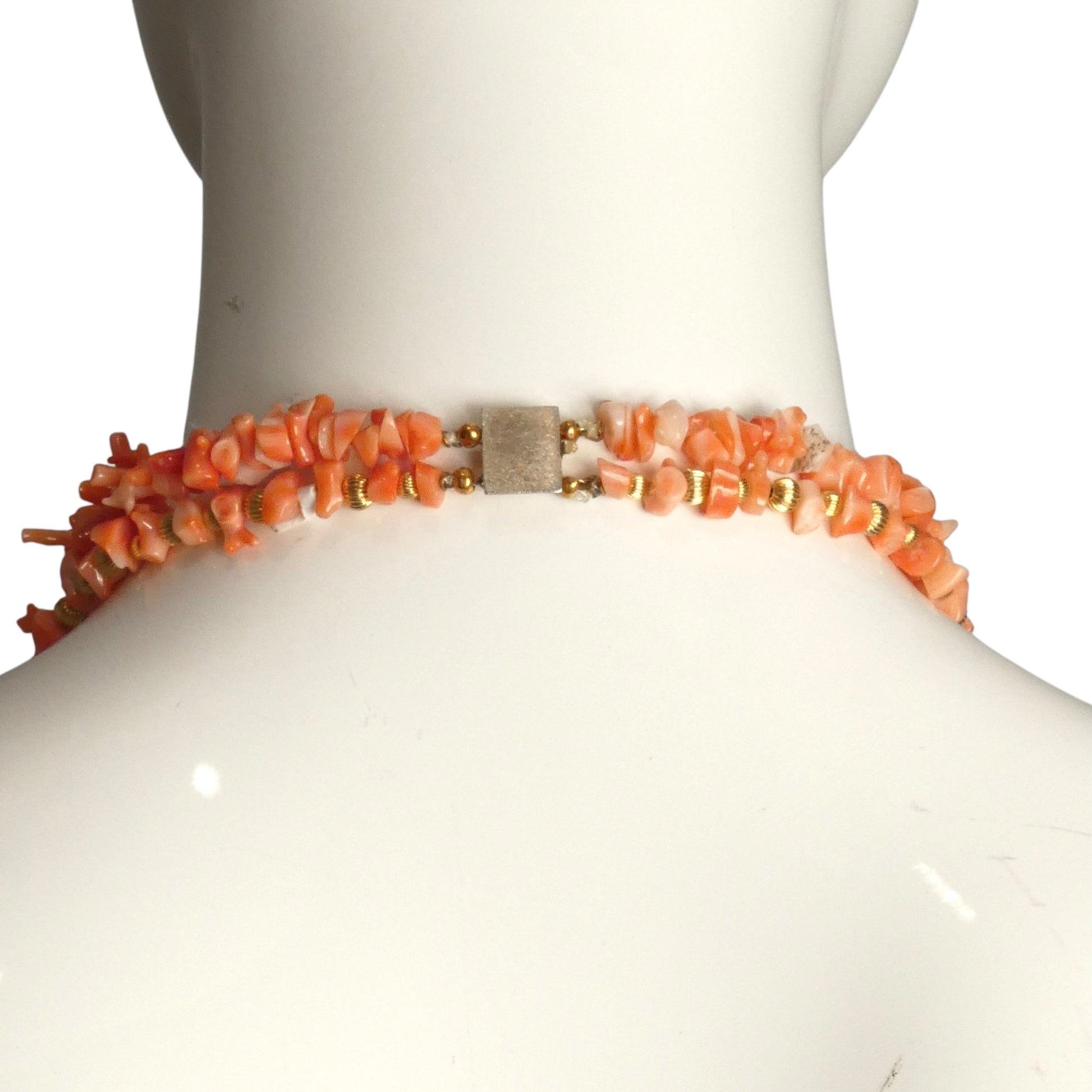 Description: This exquisite 1980s Mary McFadden necklace features a double strand of coral beads, with one strand accented by gold metal beads. Large filigree gold-gilt leaves add an elegant focal point, while a locking clasp at the back ensures secure wear.