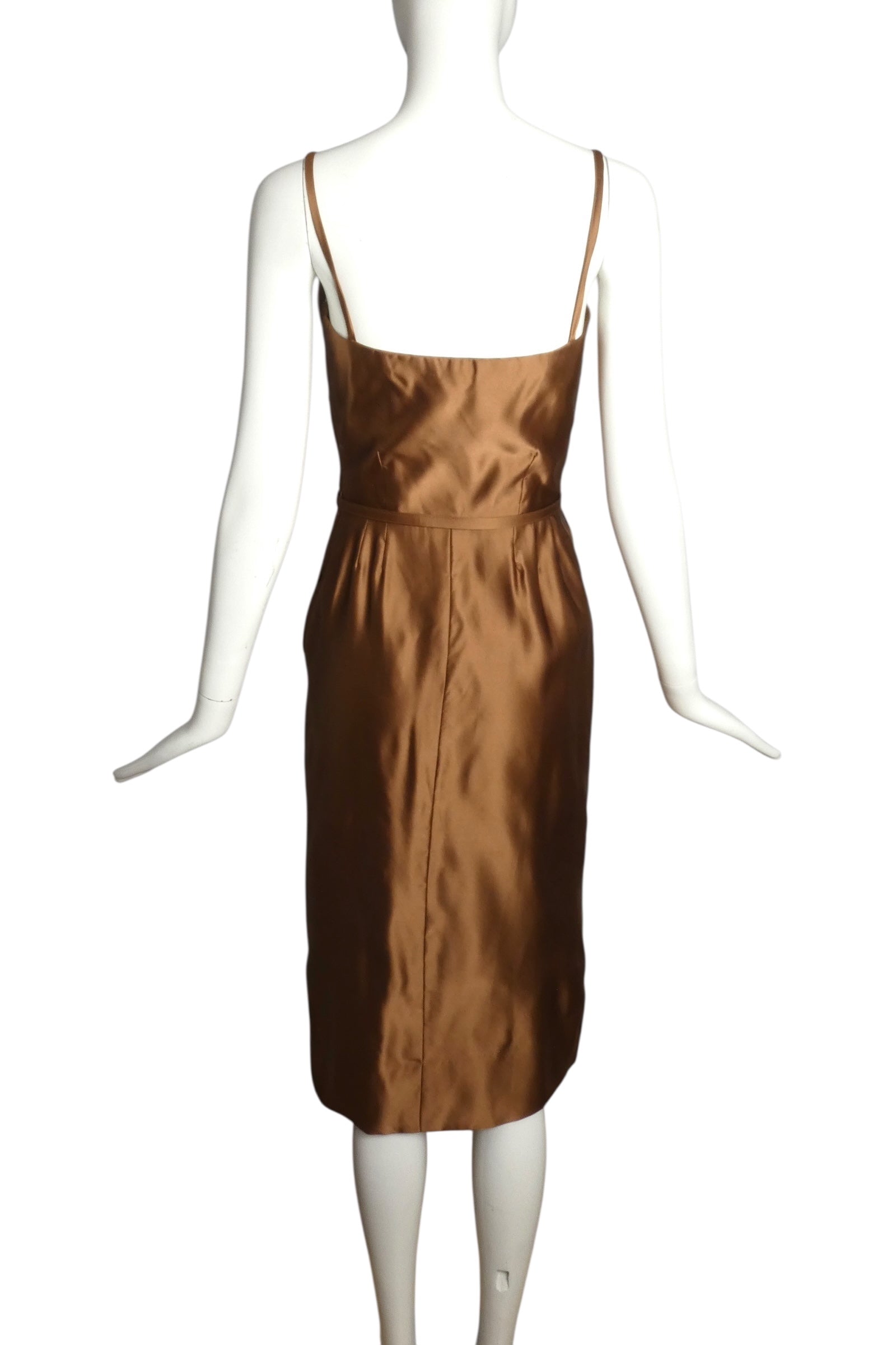 Description: A refined 1950s Maurice Rentner evening ensemble in sumptuous brown silk that exemplifies mid-century couture sophistication. The dress features a precisely dart-fitted bodice with overlapping chest panels crowned by a starburst of pleats that create architectural fullness in the pointed cups, accented with a delicate bow at center front. The wrap skirt descends in graceful wide pleats from the natural waistline, secured by a matching silk-covered belt. The accompanying coat, unadorned at the front, reveals a luxurious ivory silk lining and features inset welt pockets at the waist. A complete statement of postwar elegance and impeccable tailoring.
