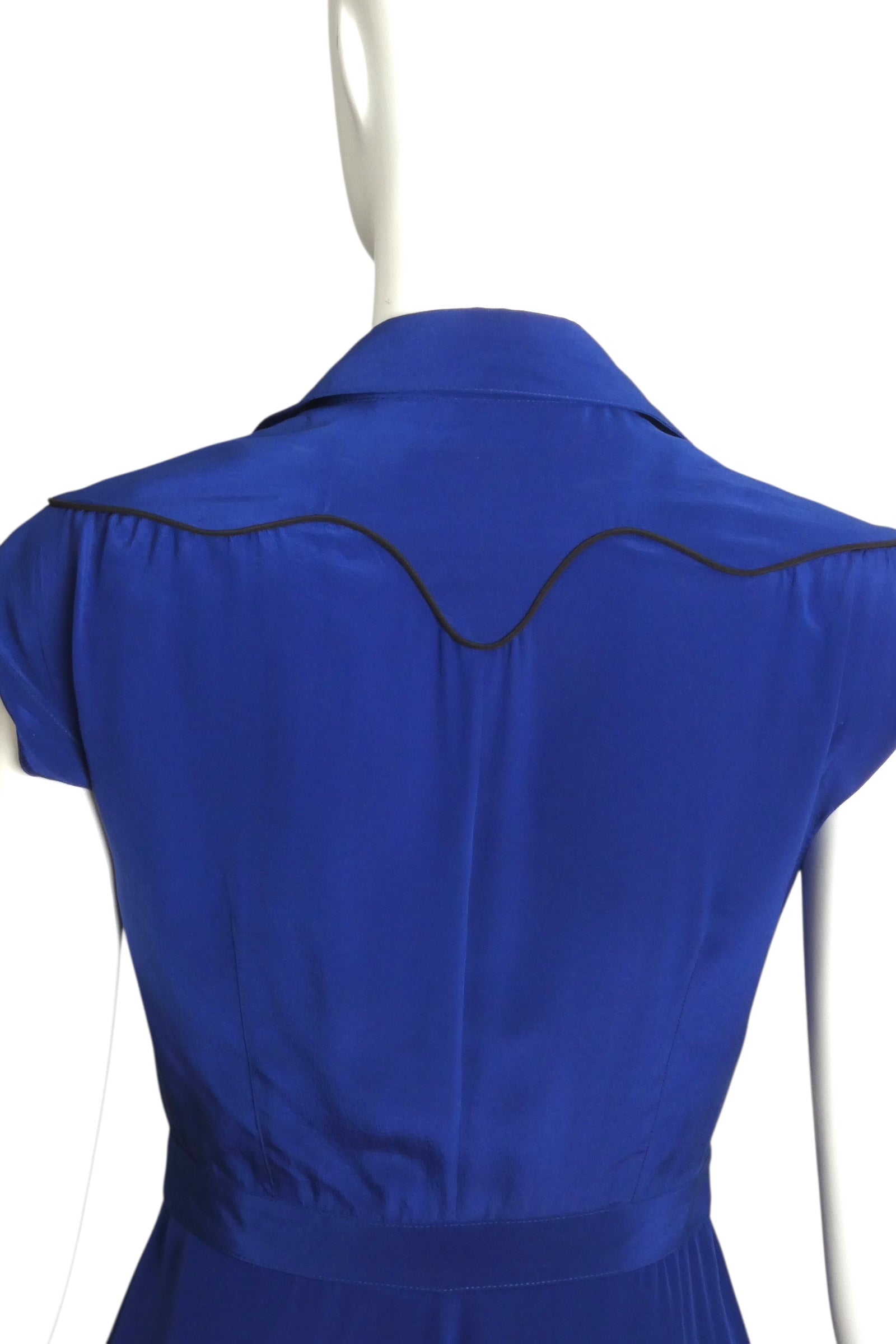 Description: Step back in time with this playful 2011 MCQ McQueen dress in vibrant cobalt blue. Featuring a western-inspired shirt waist with black-piped shoulder yokes and charming button closures, it adds a fun twist to classic style. Embroidered arrows accent the curved chest pockets, while a dart-fitted bust and wide waistband highlight your silhouette. The flowy gored skirt moves gracefully beneath, complemented by a separate slip with a chemise top and a black net petticoat. Brand new with tags, this size 4 gem once retailed at $925—ready to bring a fresh spark to your wardrobe!