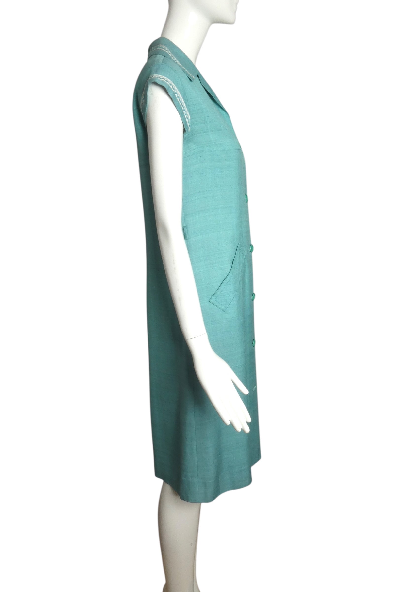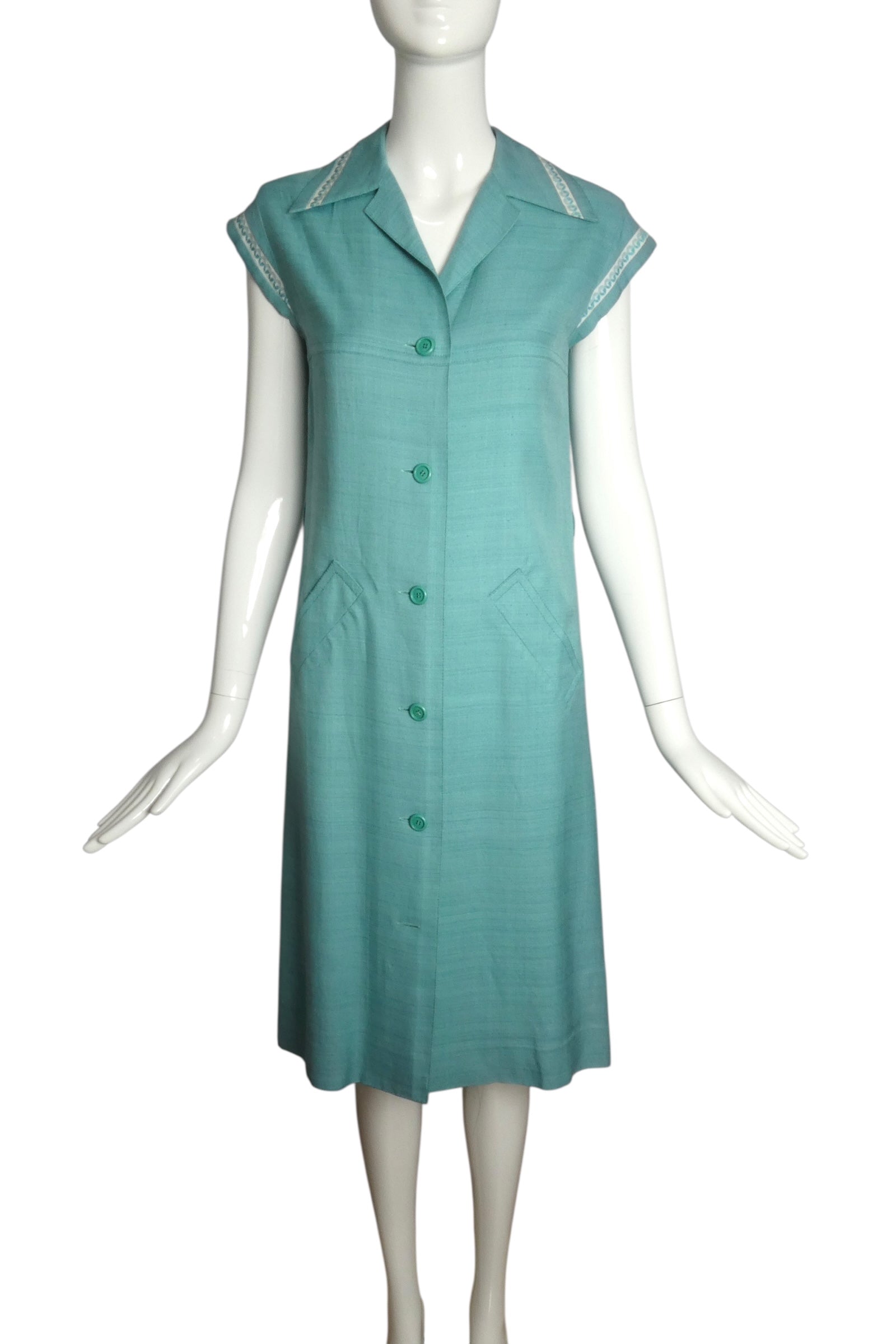 Description: A distinguished example of 1960s tailoring, this shift dress exemplifies refined minimalist design in luxurious silk shantung. The structured spread collar features notched lapels that frame the neckline with architectural precision, while a series of front button closures provides both functionality and visual interest. Diminutive cap sleeves are elegantly trimmed with coordinating brocade ribbon that echoes the collar detailing, creating sophisticated continuity throughout the design. Generously proportioned welt pockets offer practical utility without compromising the dress's clean silhouette. A signature piece from an era celebrated for understated elegance and impeccable construction.