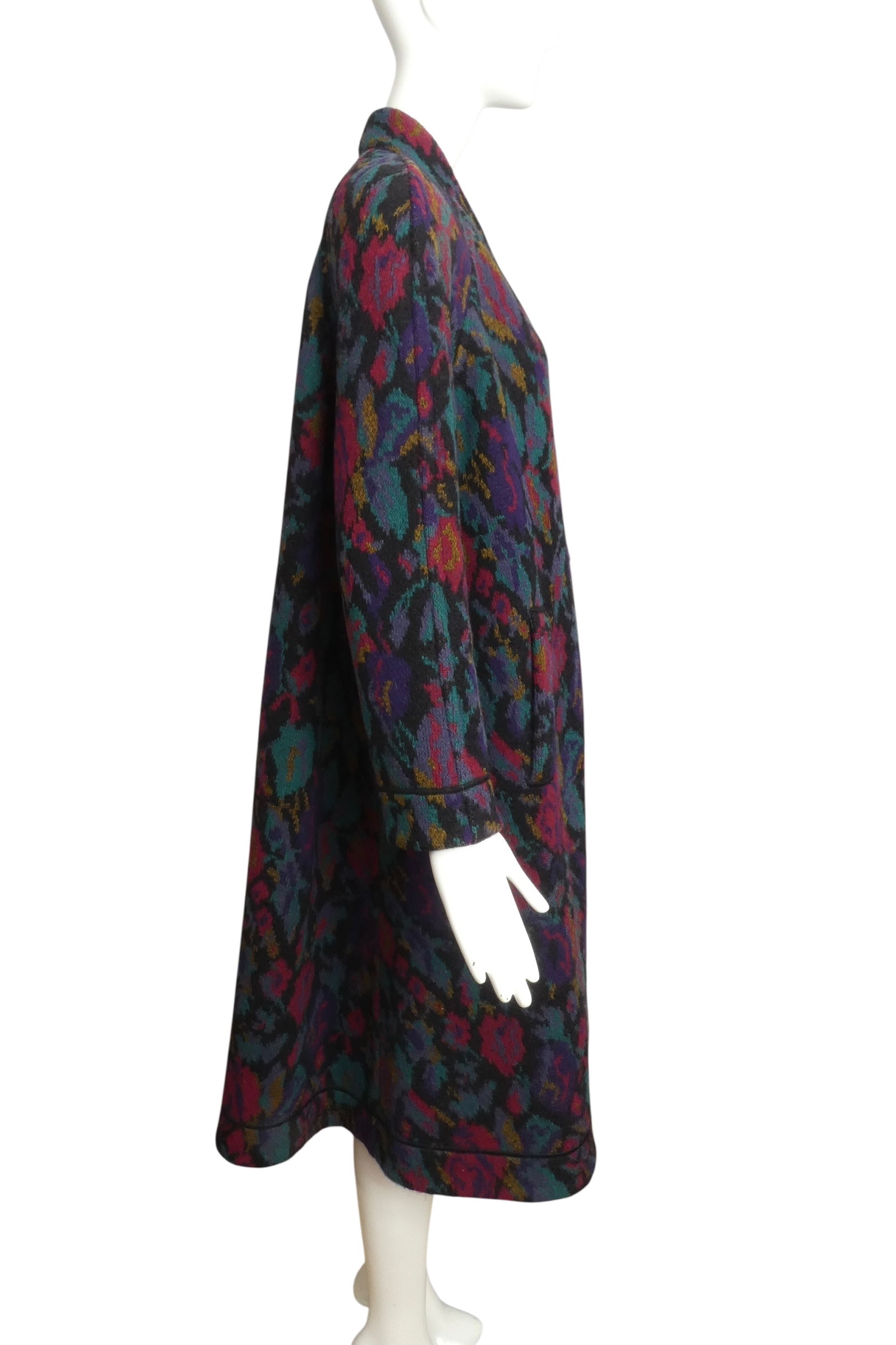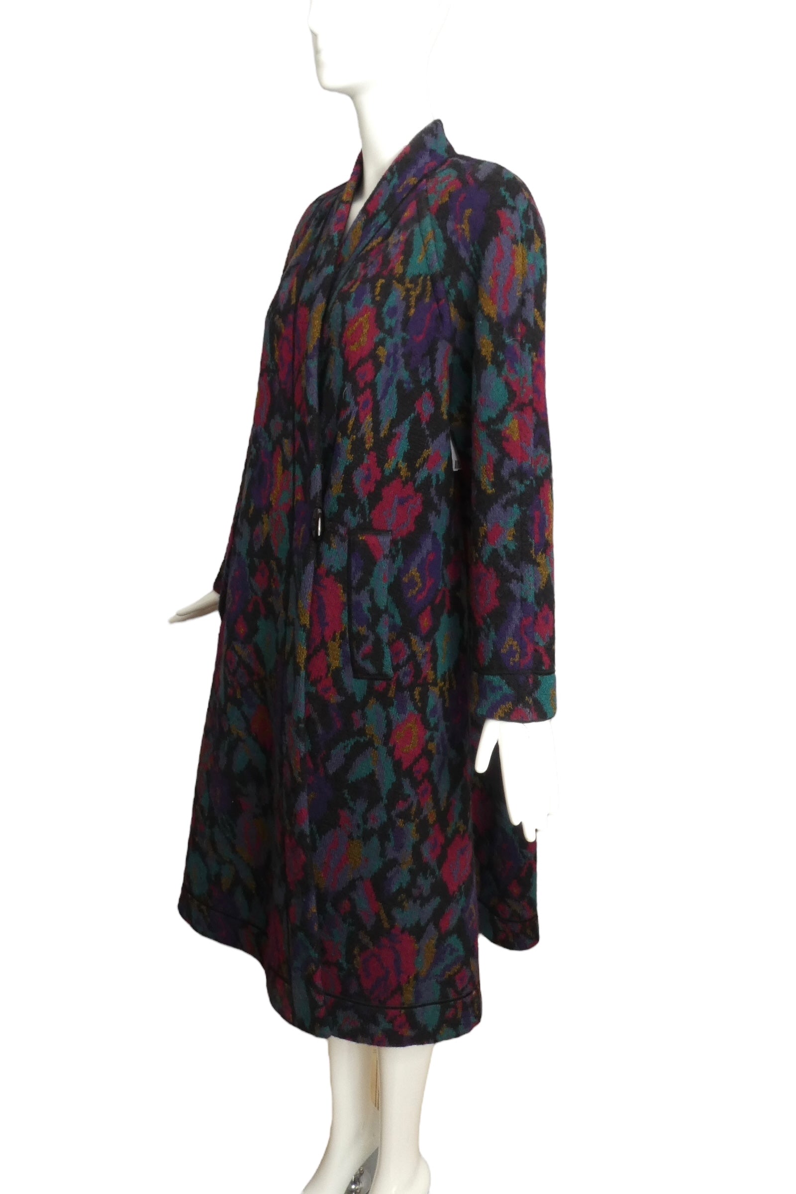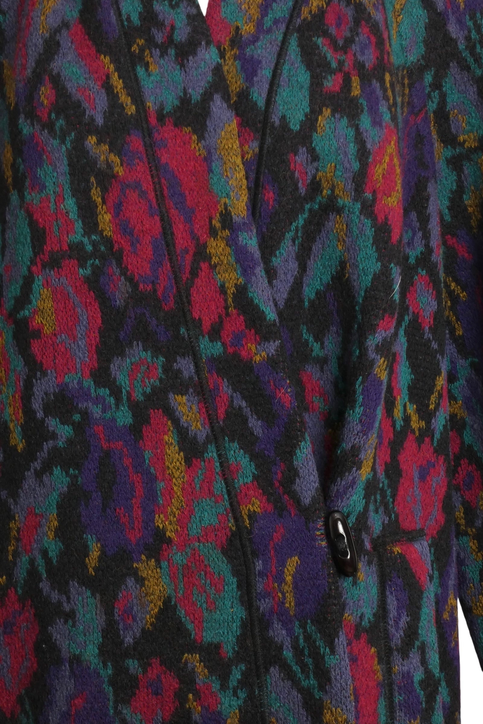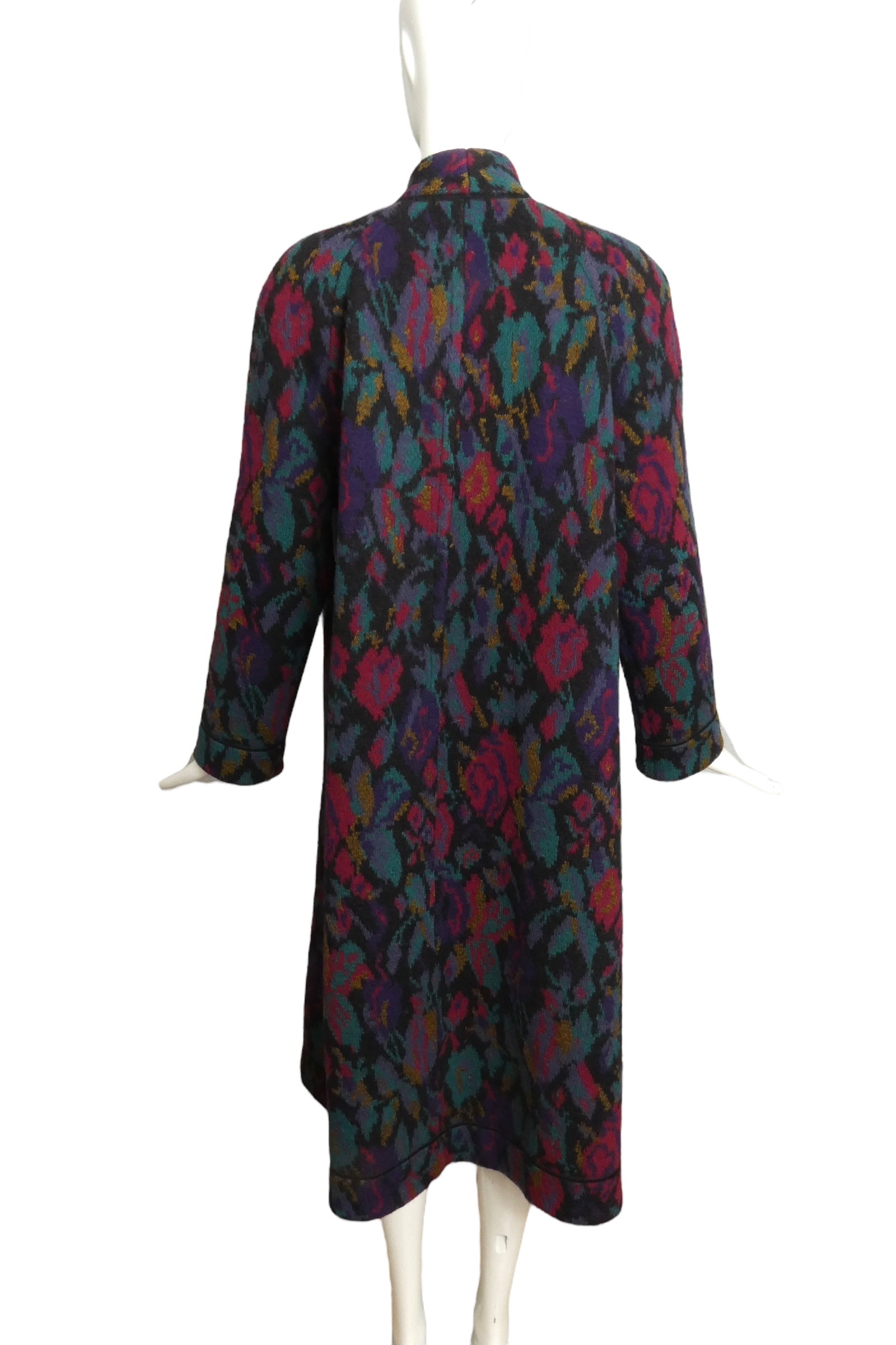 Description: Immerse yourself in vibrant sophistication with this 1970s Missoni wool knit coat, showcasing a striking multicolored floral design. The coat features elegant raglan sleeves and refined black knit piping, blending comfort with style seamlessly. A single button closure at the waist enhances the silhouette, while welt inset pockets offer practical convenience. Ideal for layering, this timeless piece enriches your wardrobe and provides warmth across seasons. Own a distinctive piece of fashion heritage with this exceptional coat.