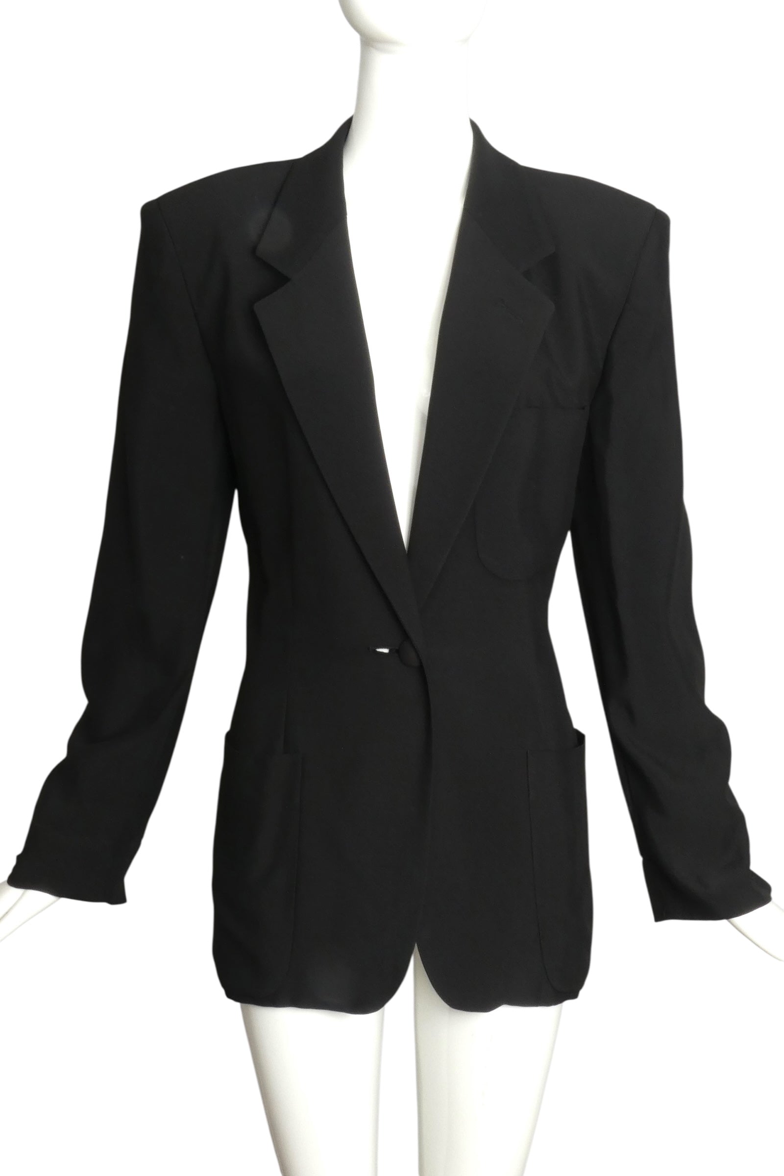 Description: This early 1990s Moschino Couture blazer blends classic tailoring with bold novelty. Crafted from black rayon, it features traditional notched lapels and a single button closure for a sleek silhouette. Functional patch pockets adorn the left chest and waist, while the standout detail is the striking embroidered cat eye design on the back, complete with sculpted eyebrows—adding intrigue and artistic flair to this size 8 statement piece. Perfect for those seeking sophisticated style with a distinctive edge.