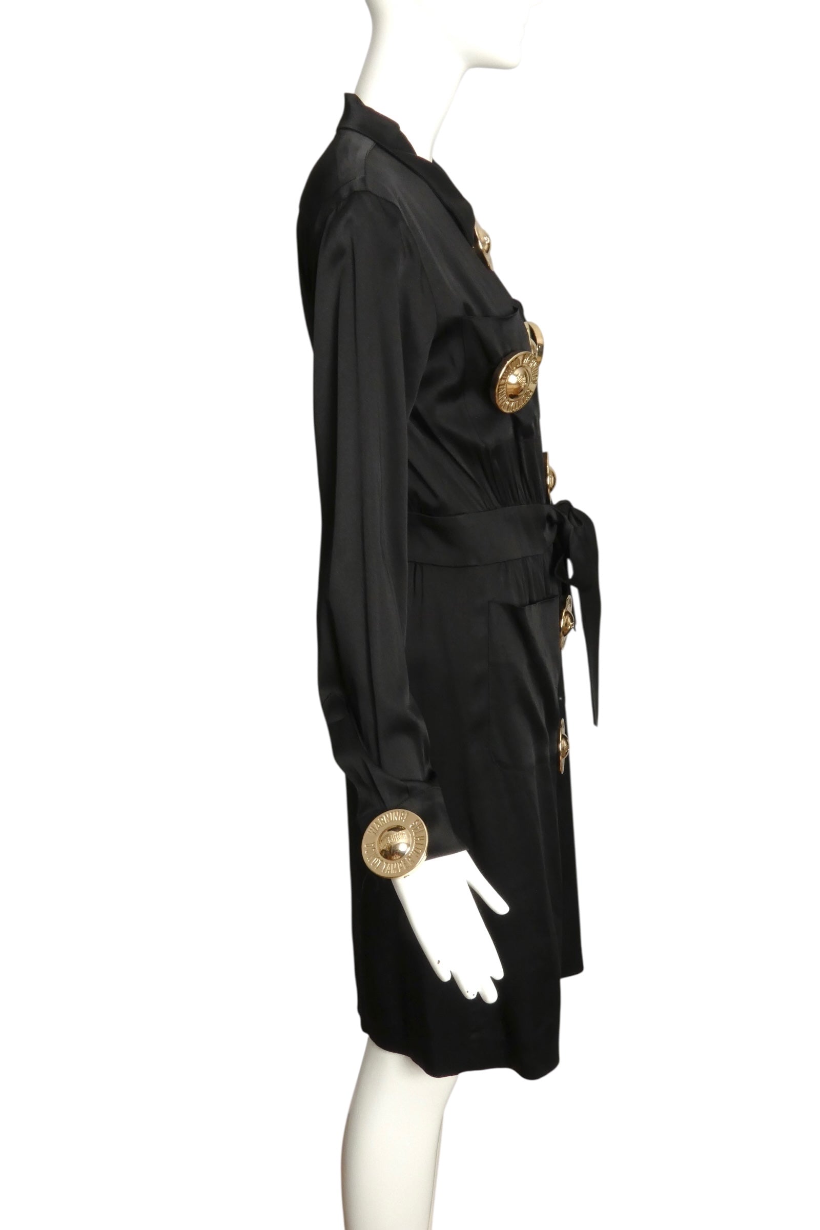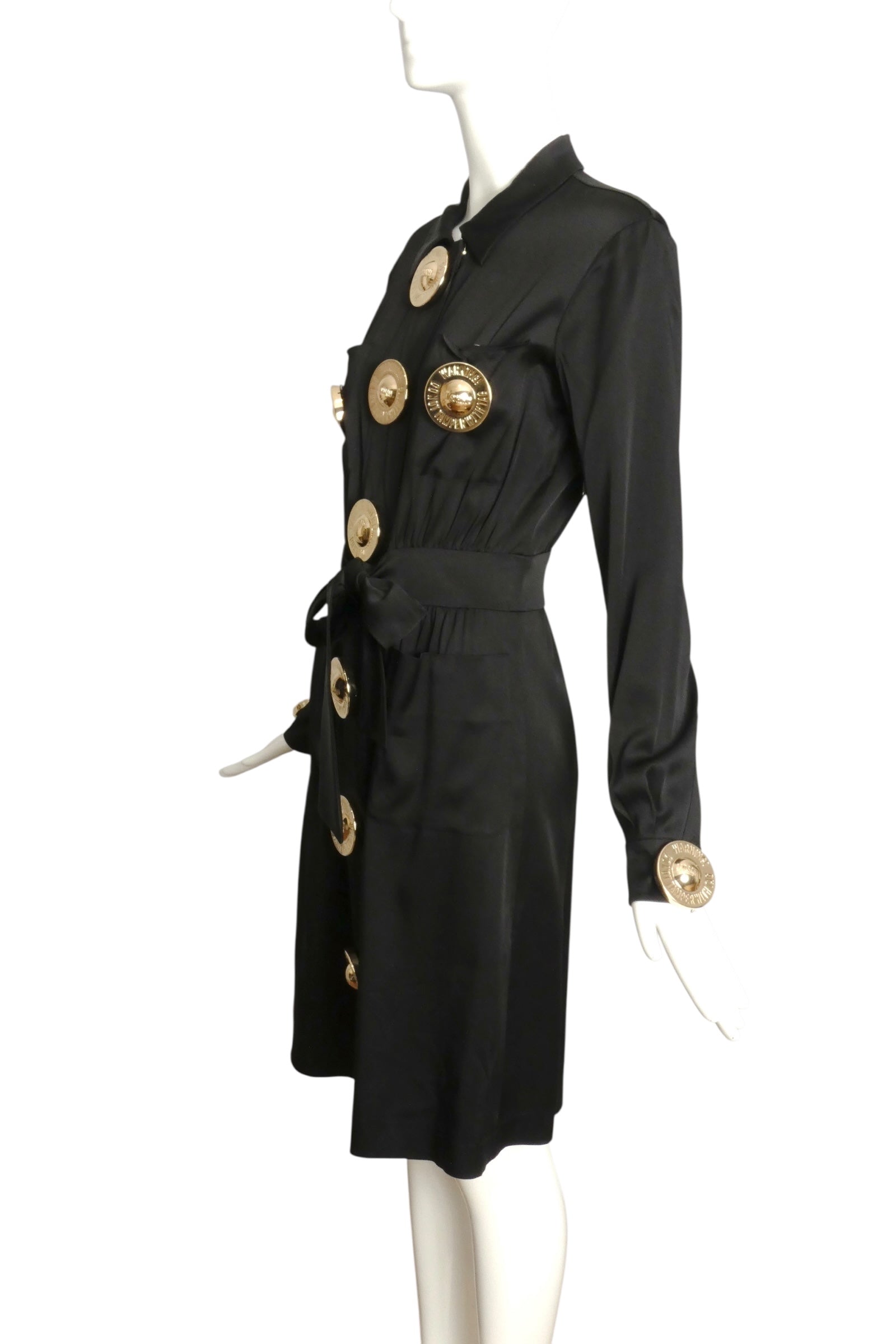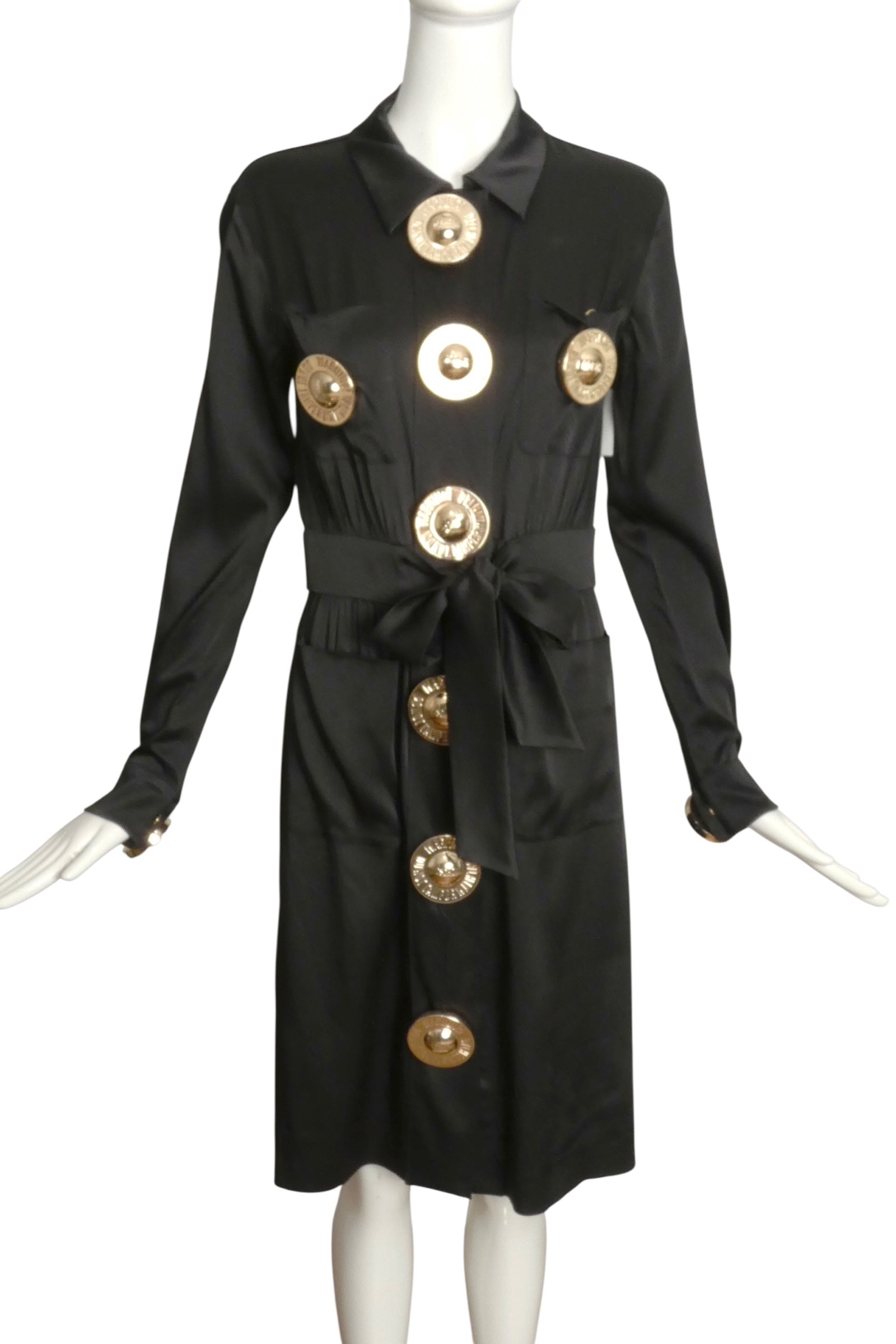 Description: From Moschino's 2016 Resort collection, this black crepe-back satin shirtwaist dress combines elegance with distinctive details. It features a spread collar and hidden snap closures along the front, accented by bold gold buttons engraved with “Warning, Do Not Tamper With Tag.” The dress offers practical style with patch pockets on the chest and skirt, each secured with snaps. A wide waistband at the front transitions into a sash, enhancing the silhouette with a tailored fit.