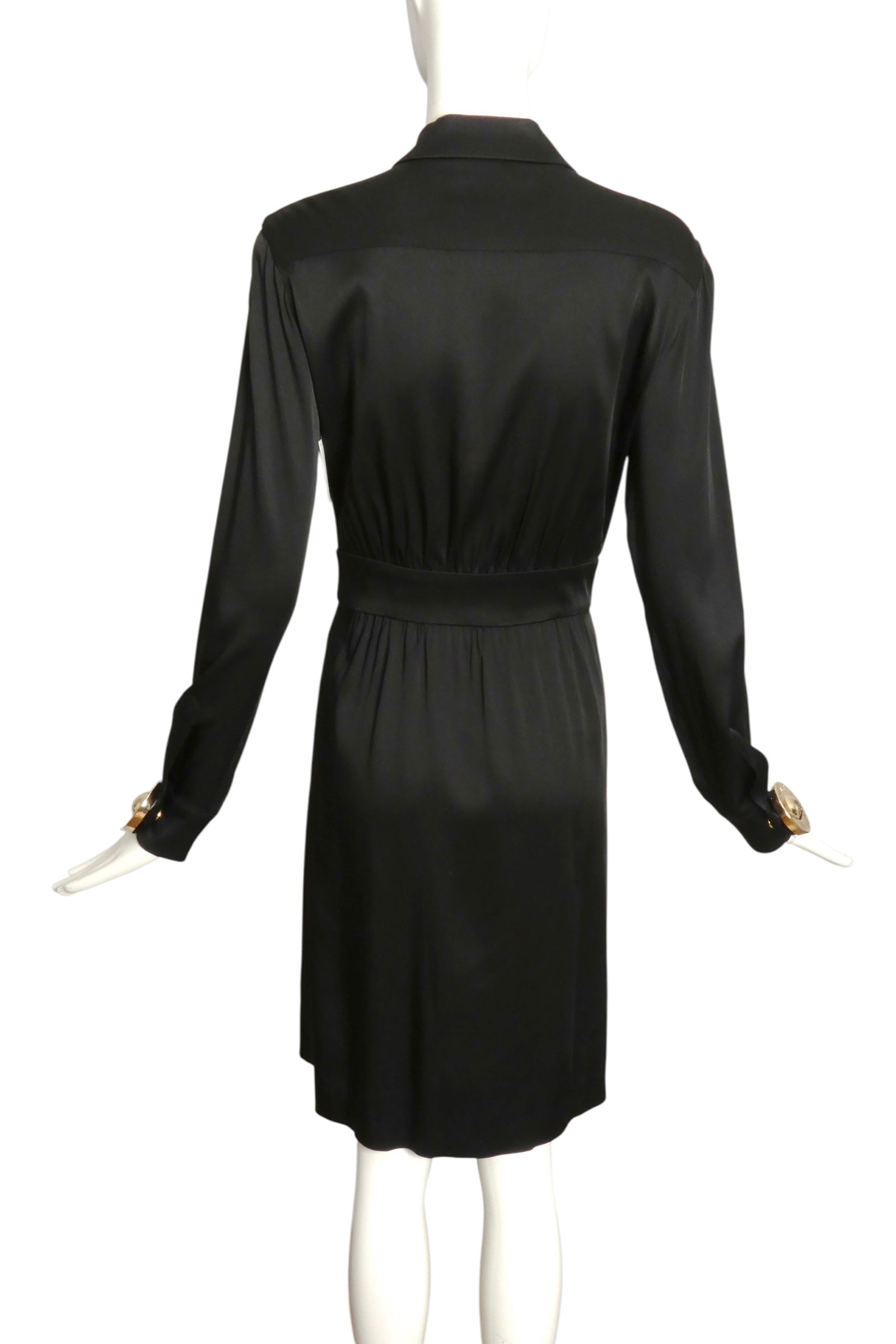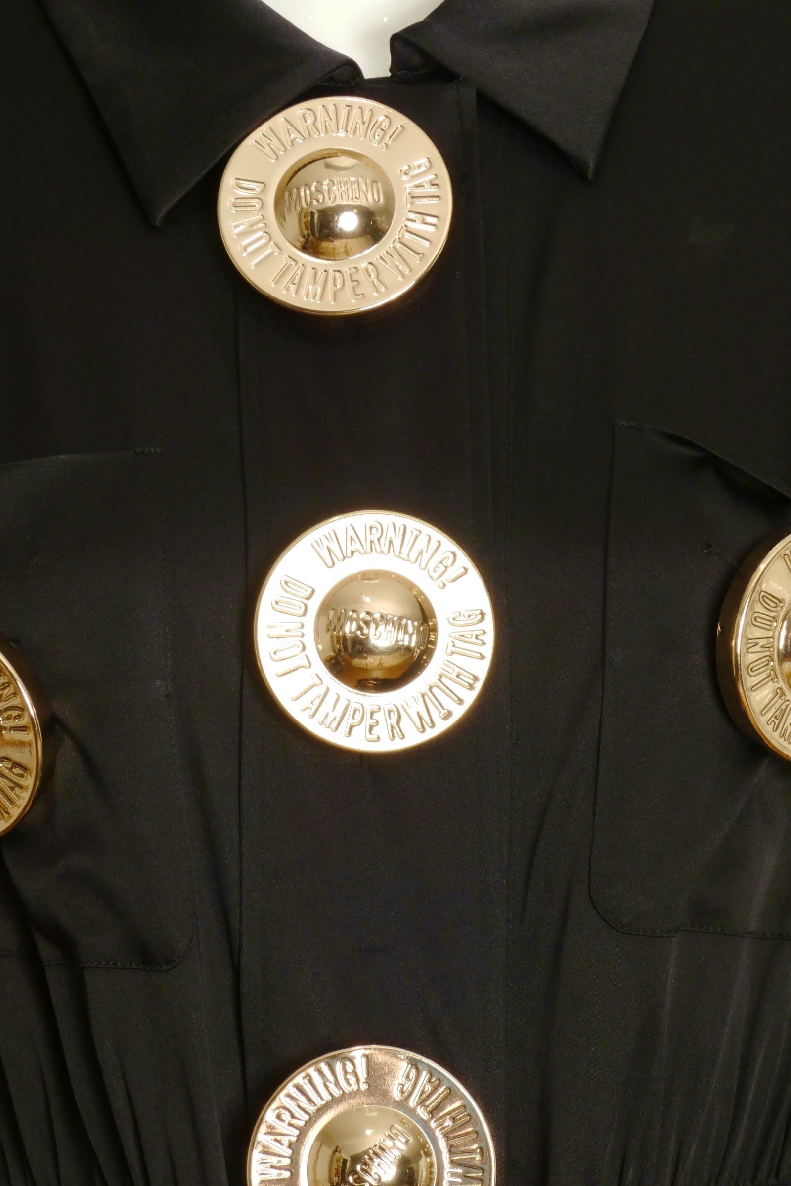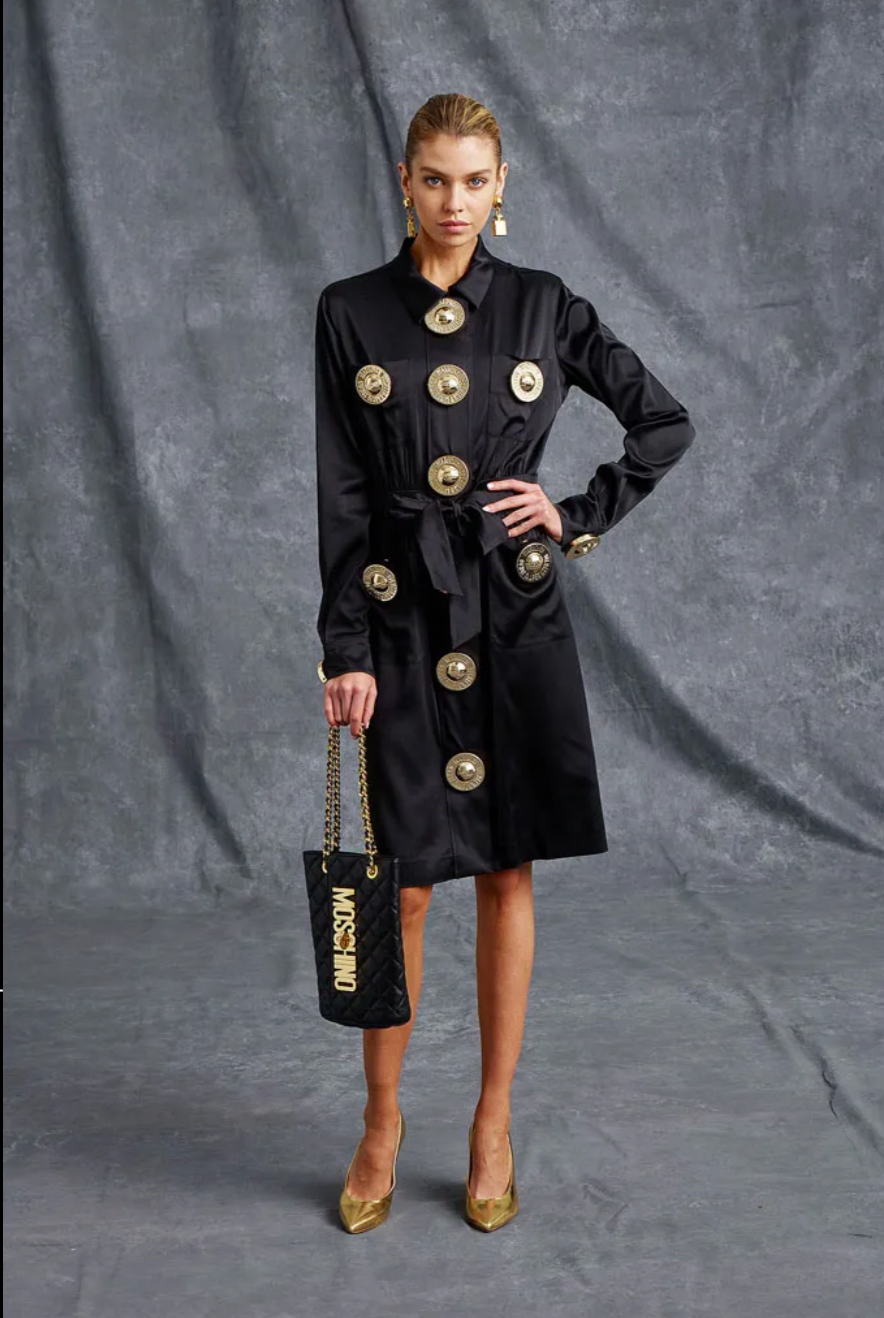 Description: From Moschino's 2016 Resort collection, this black crepe-back satin shirtwaist dress combines elegance with distinctive details. It features a spread collar and hidden snap closures along the front, accented by bold gold buttons engraved with “Warning, Do Not Tamper With Tag.” The dress offers practical style with patch pockets on the chest and skirt, each secured with snaps. A wide waistband at the front transitions into a sash, enhancing the silhouette with a tailored fit.