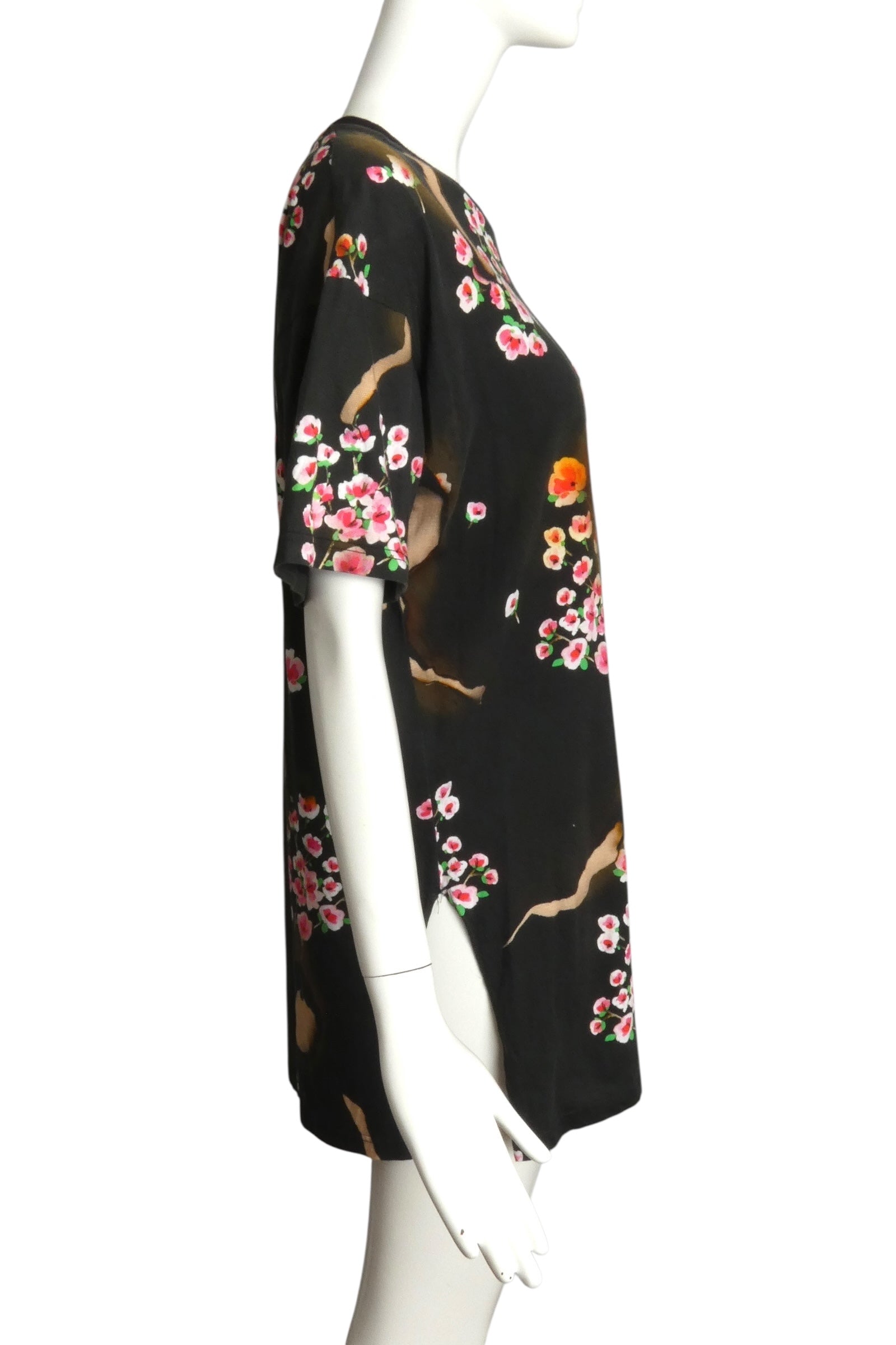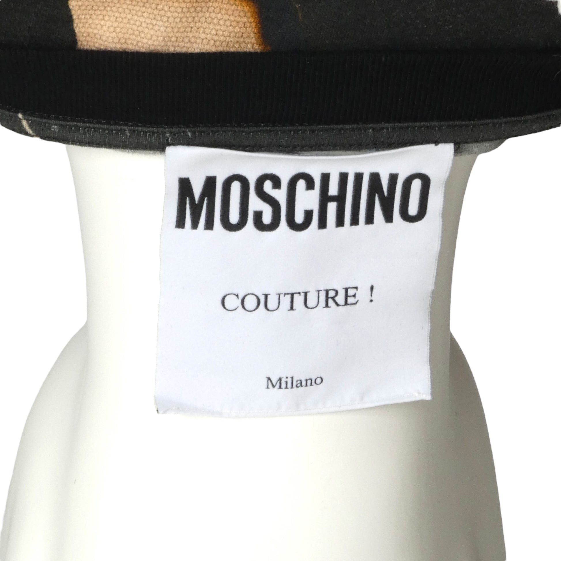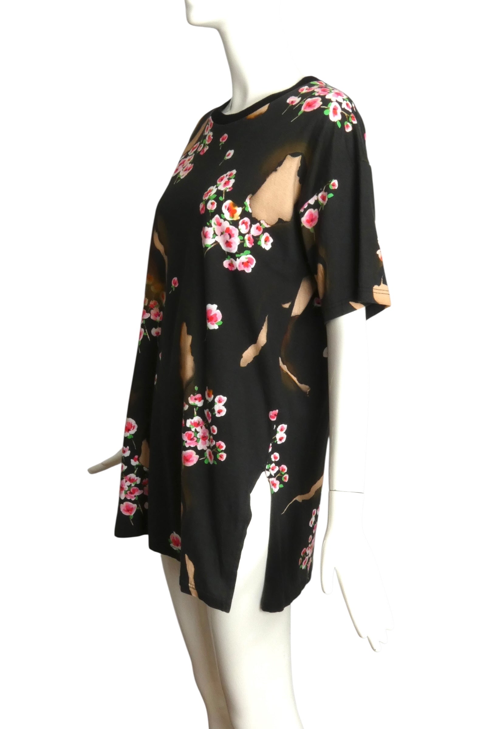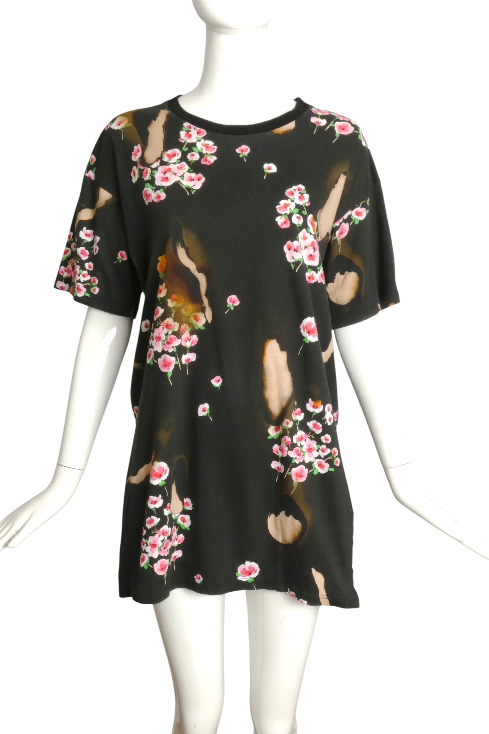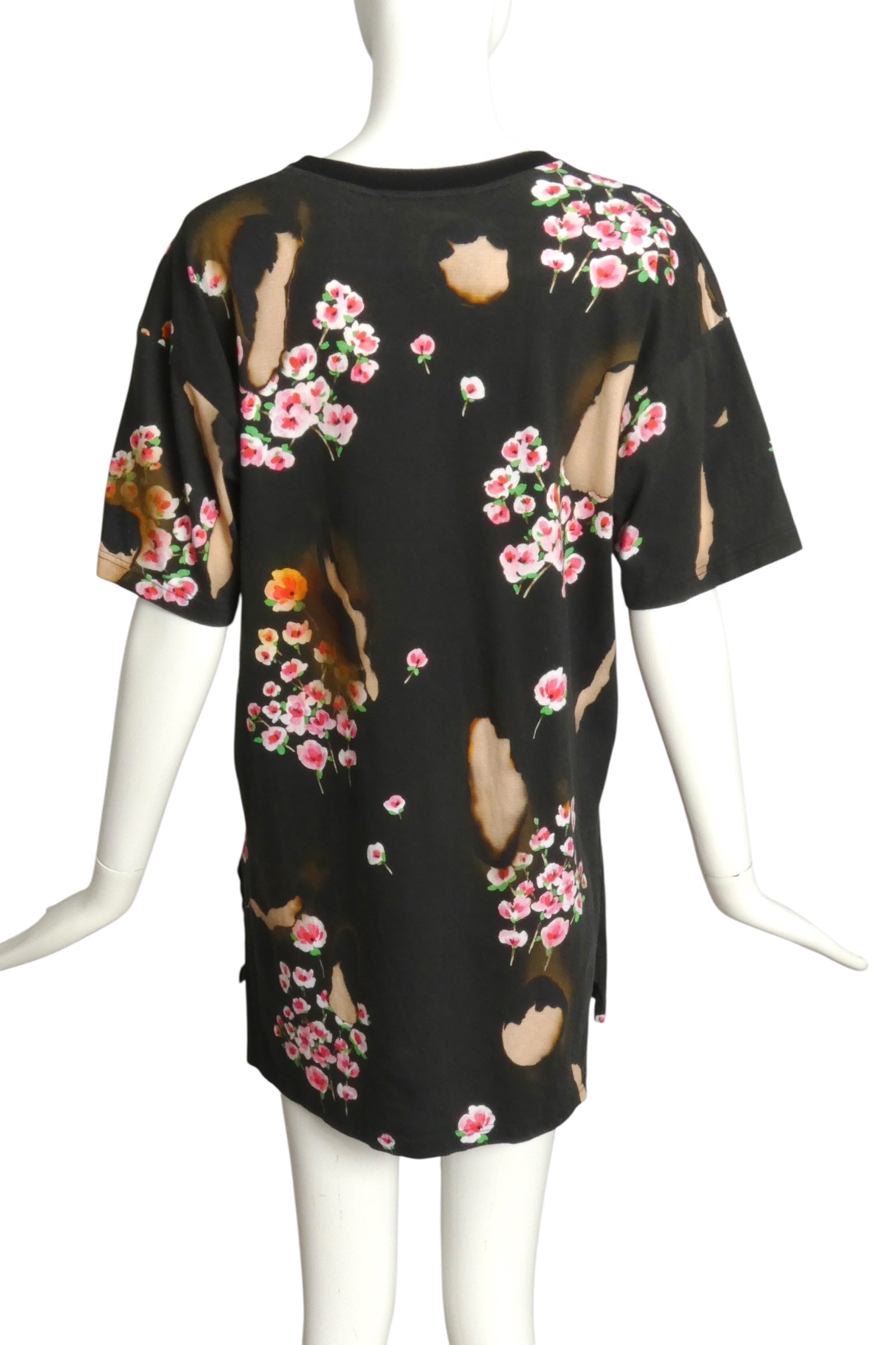 Description: From Moschino Couture’s Fall 2016 collection, this graphic print t-shirt dress features distinctive "burned" motifs contrasted with a delicate pink floral pattern on a black knit fabric. The dress is finished with a comfortable black knit neckband, offering both style and ease of wear in a unique, fashion-forward design.