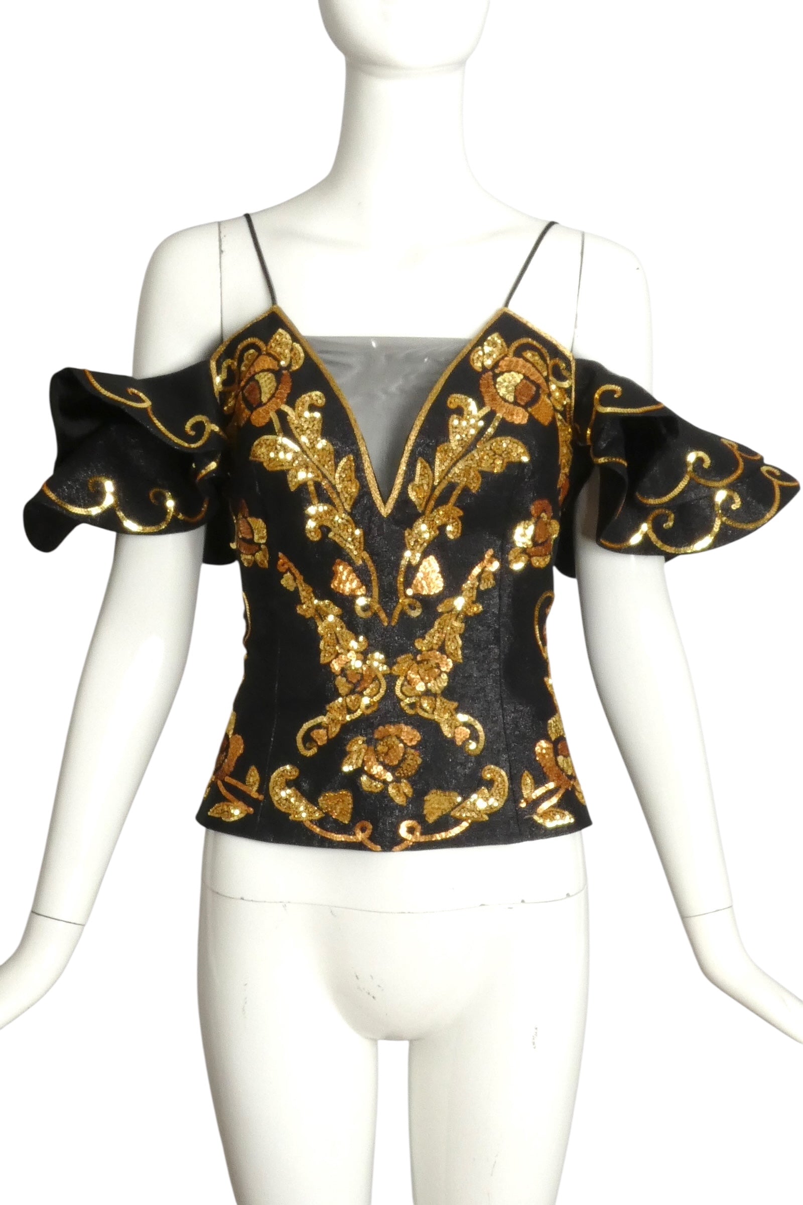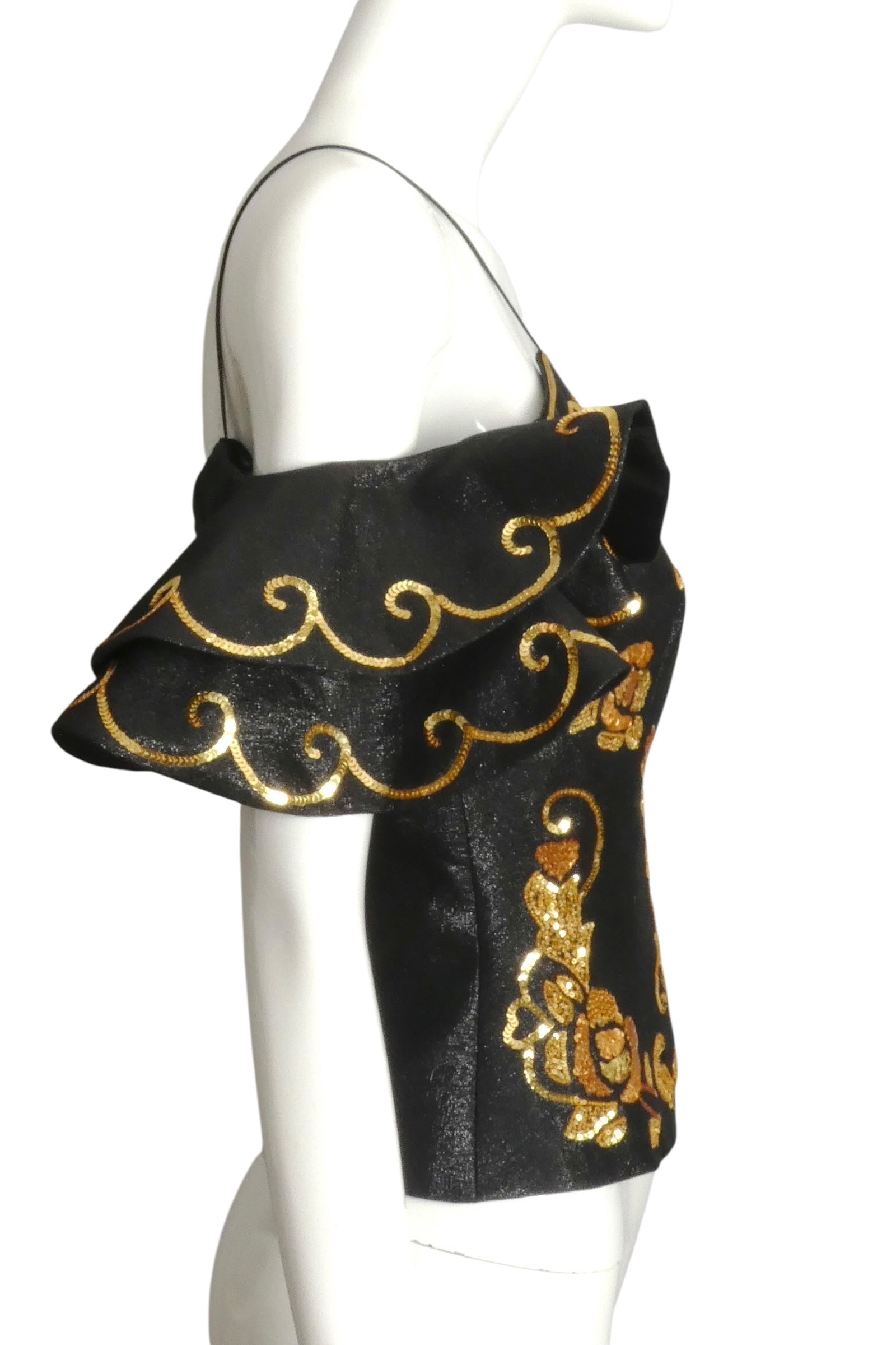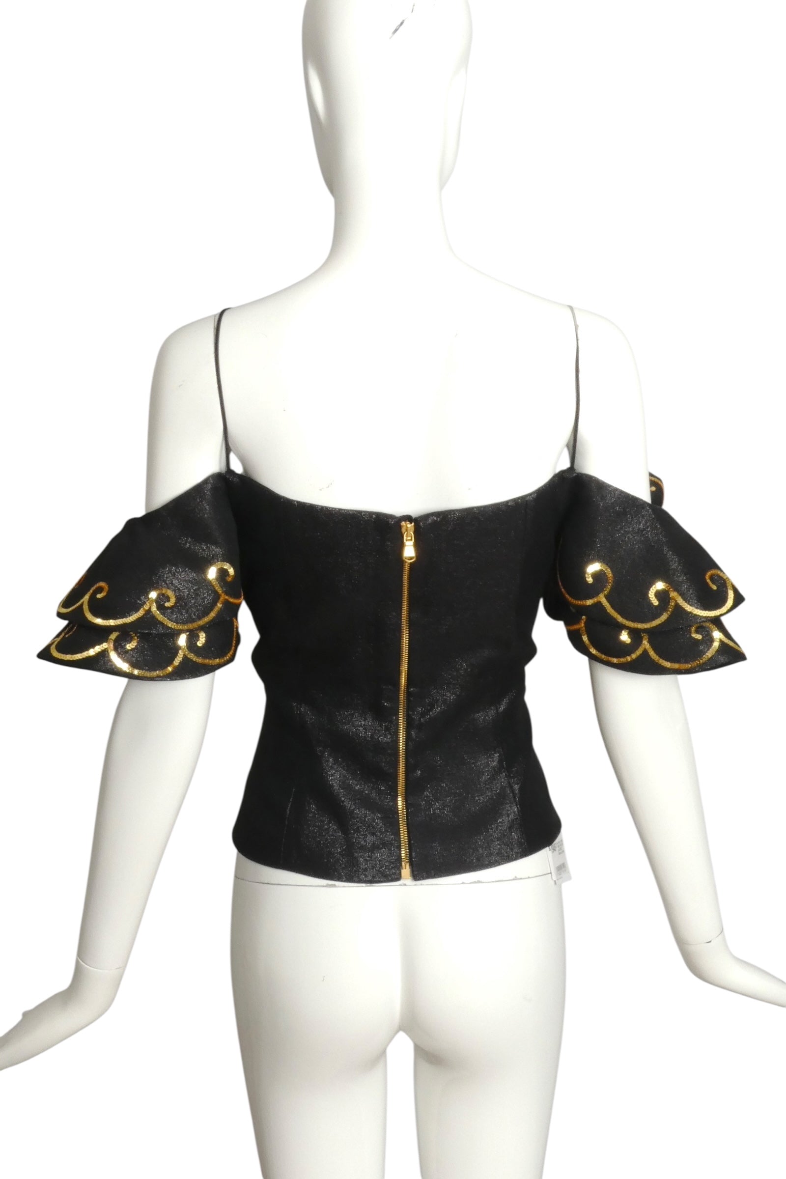 Description: This Moschino Couture bustier bodice from the Spring 2018 runway collection features black lamé fabric embellished with gold sequin floral motifs. Designed with a ballerina silhouette, it has a V-neckline accented by a sheer tulle modesty panel across the cleavage, double ruffles around the arms, and delicate spaghetti straps. The center back zipper offers a secure fit. Brand new with store tags originally retailed at $1945, exemplifying refined craftsmanship and runway elegance.