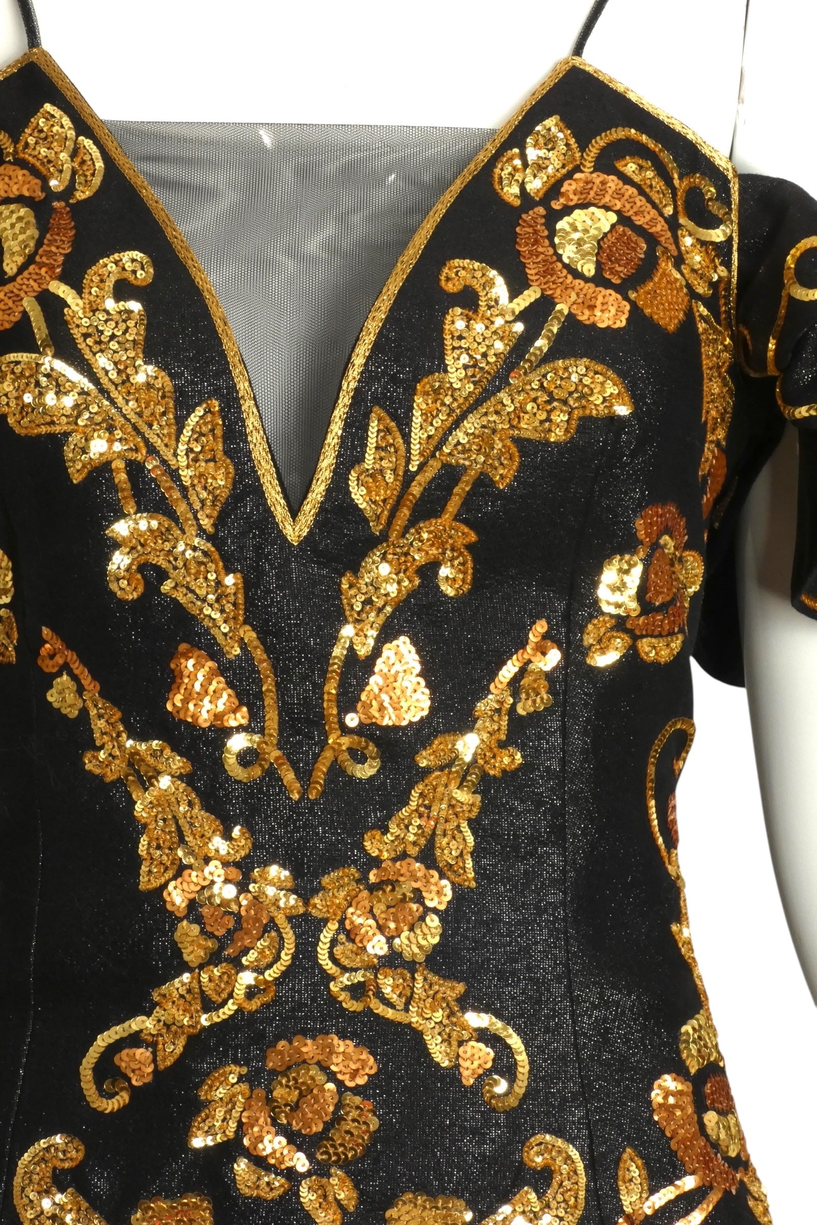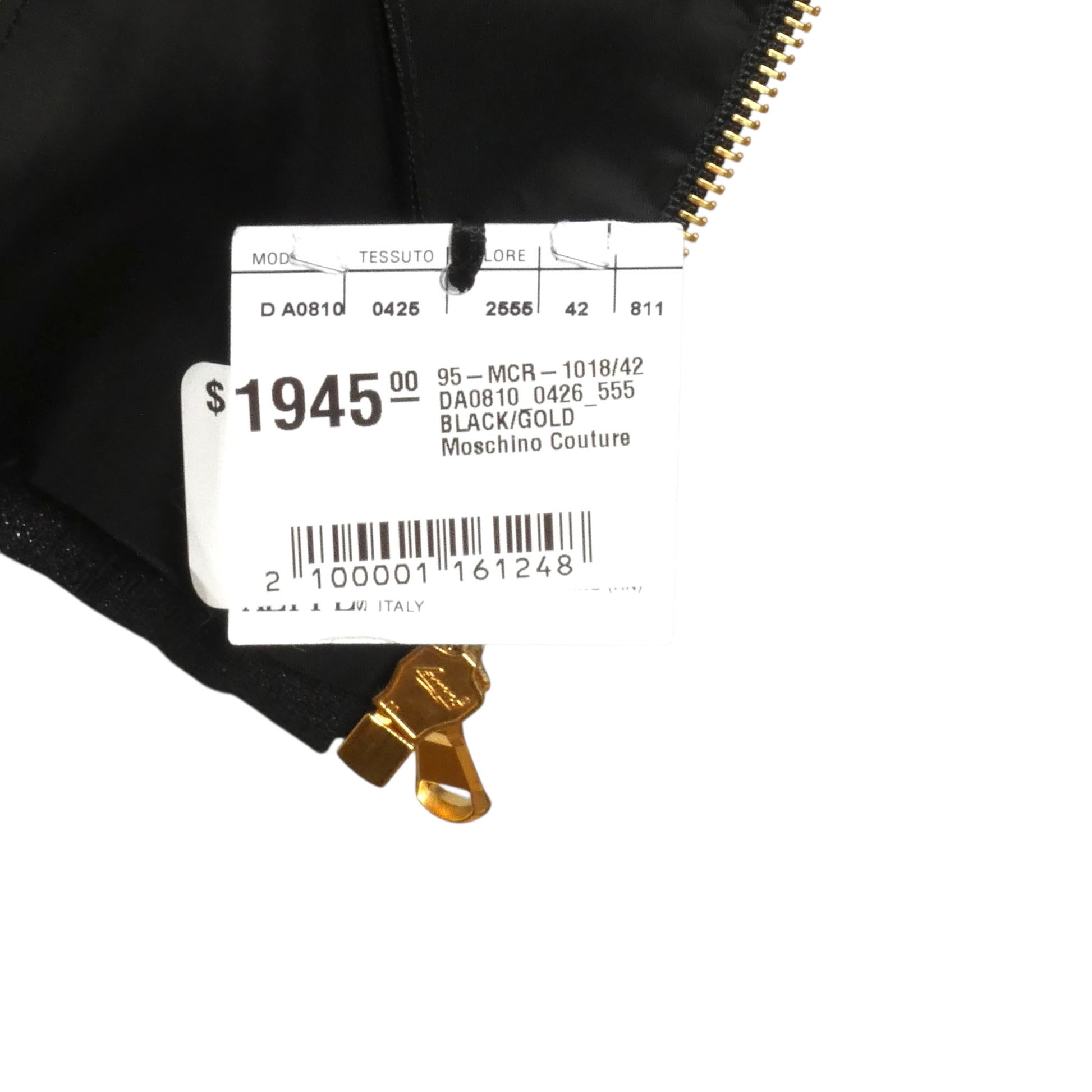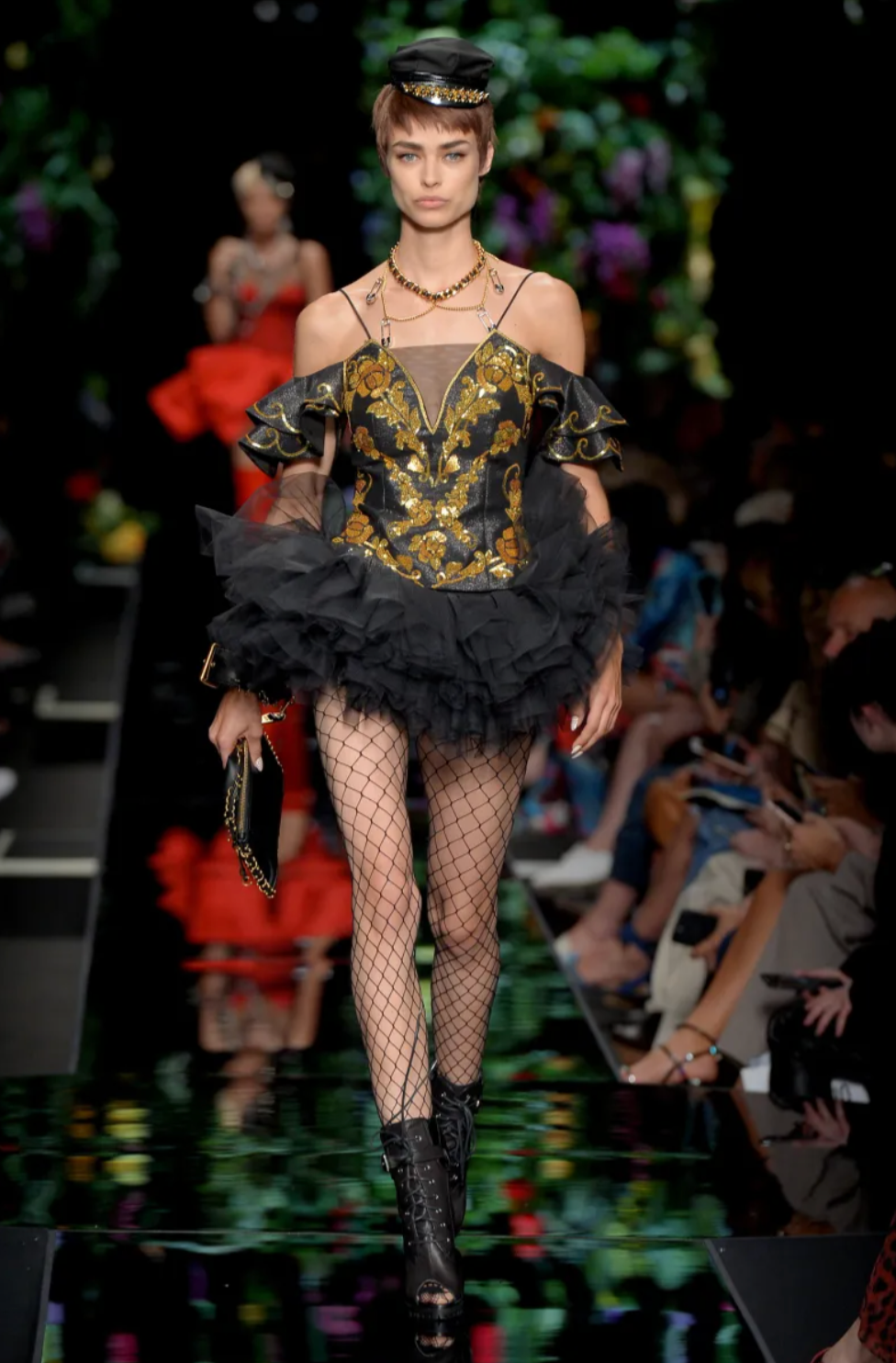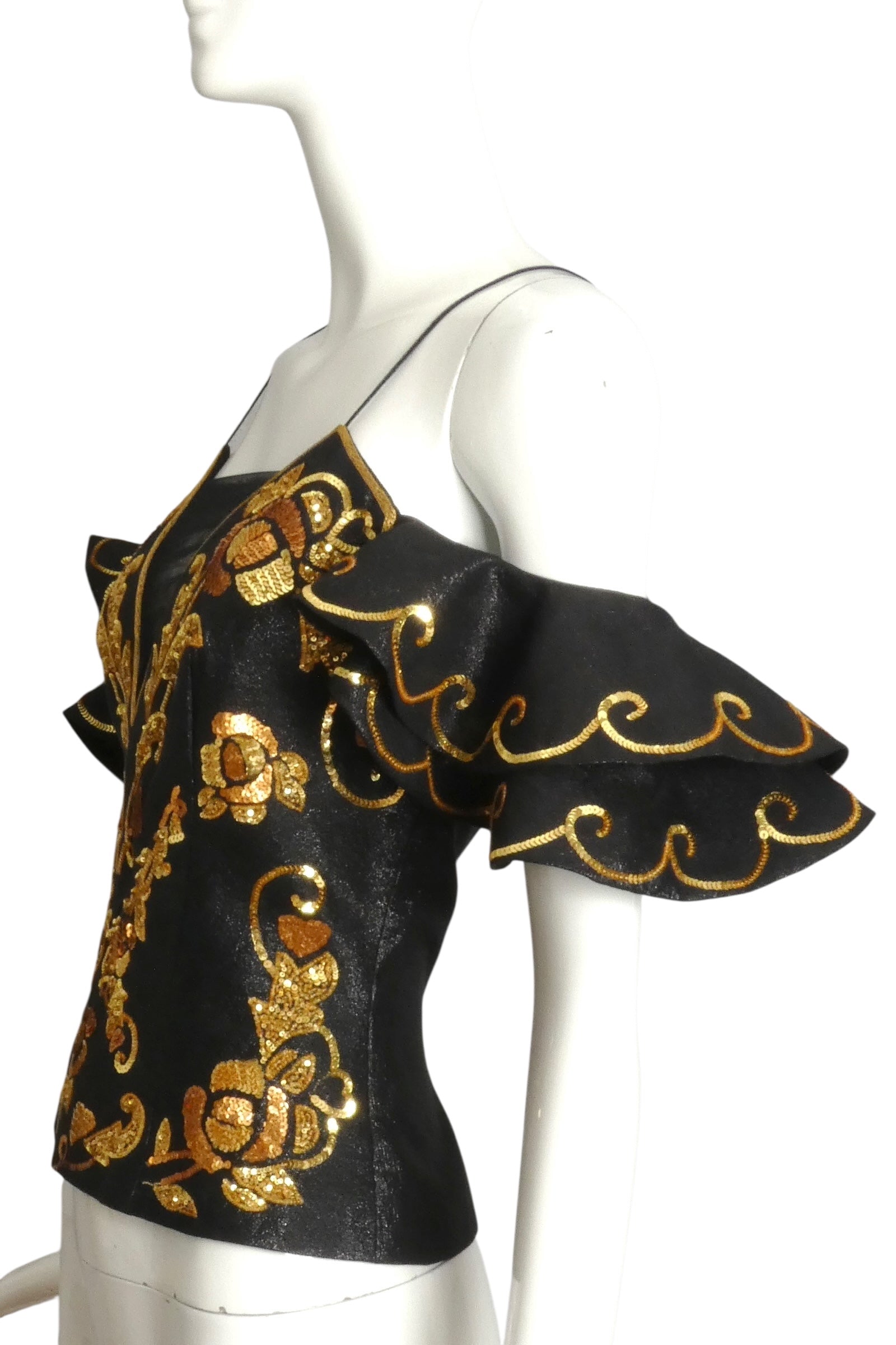 Description: This Moschino Couture bustier bodice from the Spring 2018 runway collection features black lamé fabric embellished with gold sequin floral motifs. Designed with a ballerina silhouette, it has a V-neckline accented by a sheer tulle modesty panel across the cleavage, double ruffles around the arms, and delicate spaghetti straps. The center back zipper offers a secure fit. Brand new with store tags originally retailed at $1945, exemplifying refined craftsmanship and runway elegance.