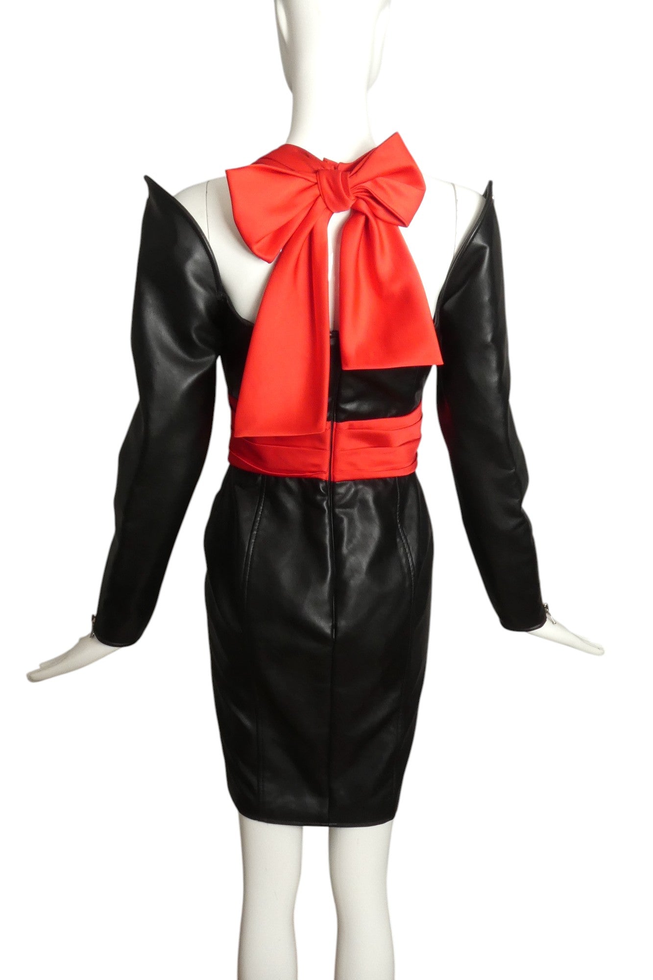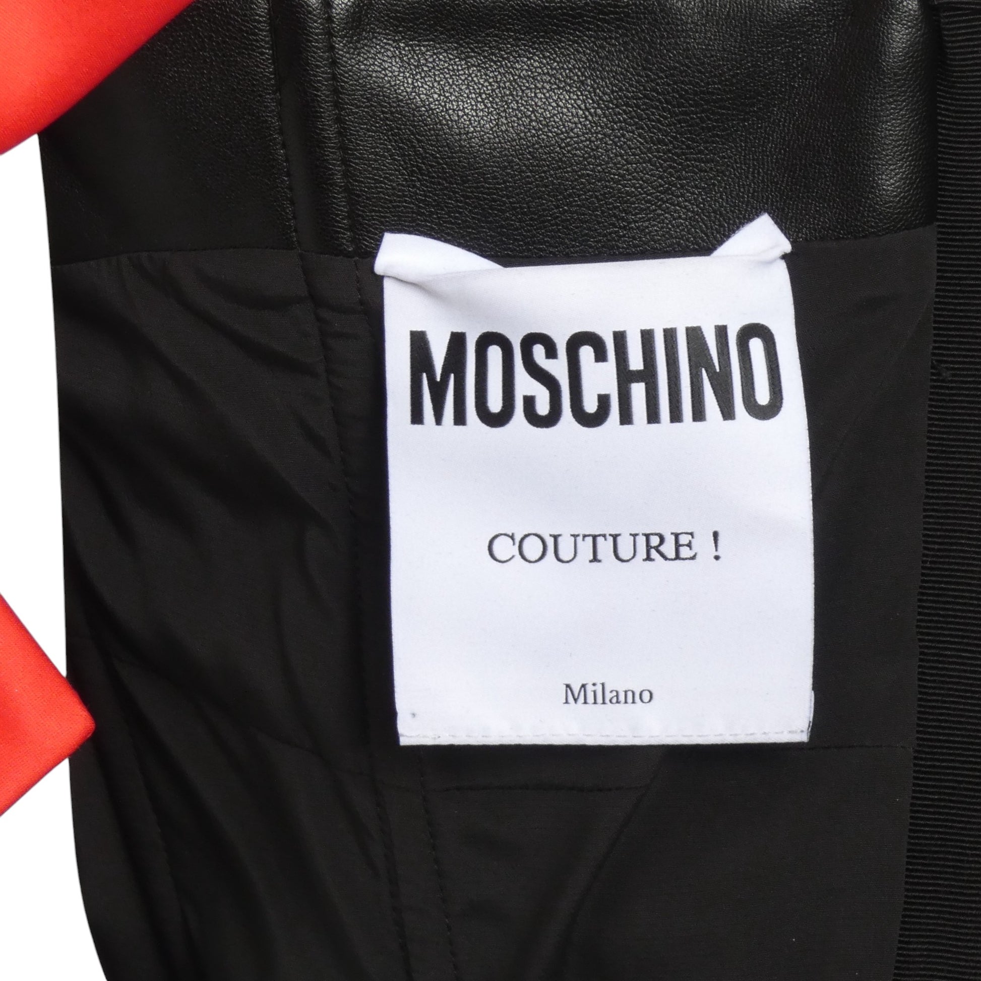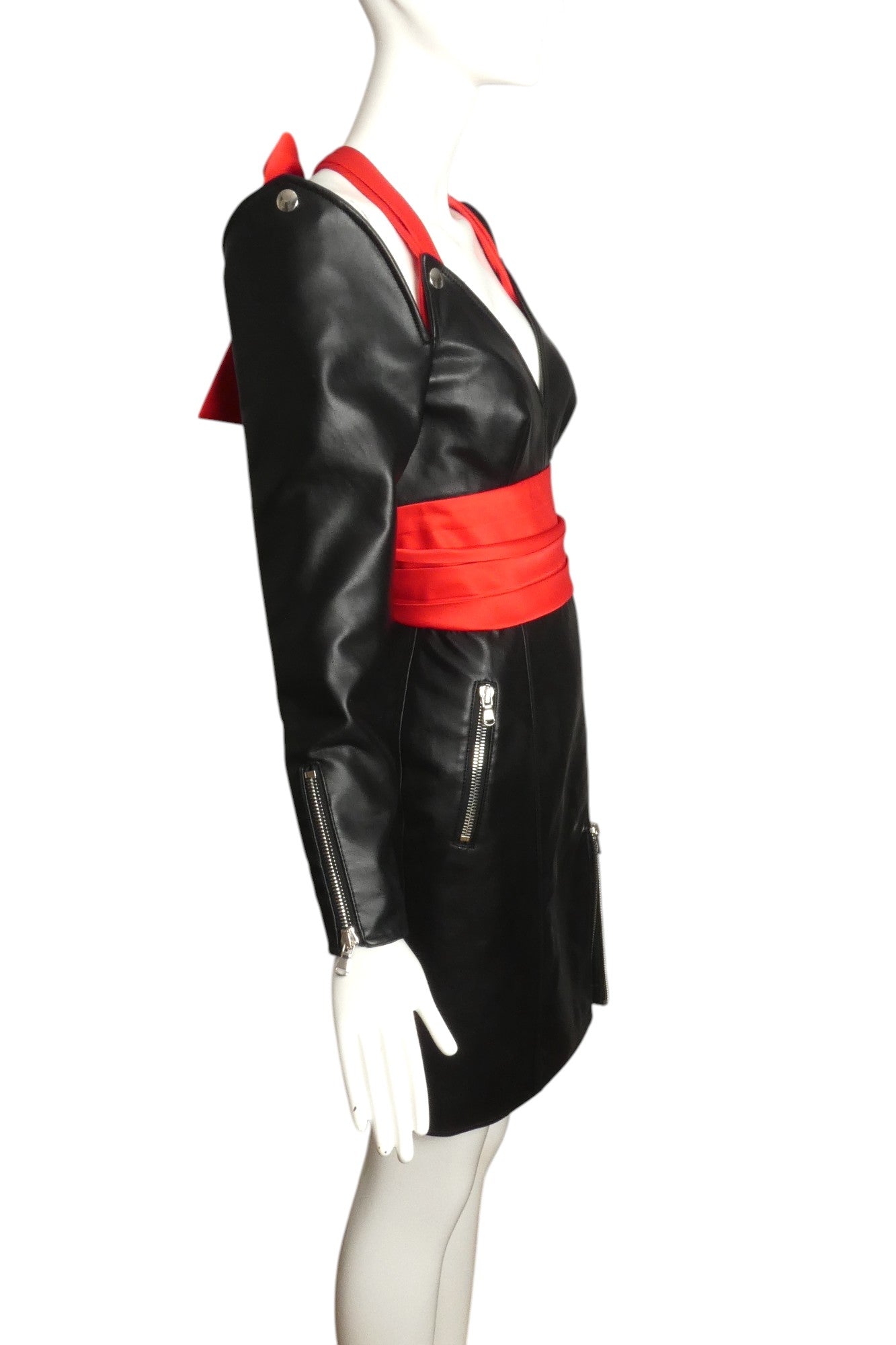 Description: Step into the spotlight with the Moschino Couture Pre Fall 2021 collection dress, a stunning blend of edgy and elegant. This black faux leather moto dress features striking red satin trim and a chic halter neckline, complete with a large red bow at the back for a playful touch. Perfect for making a bold statement at any event, this dress combines comfort and style, ensuring you turn heads wherever you go
