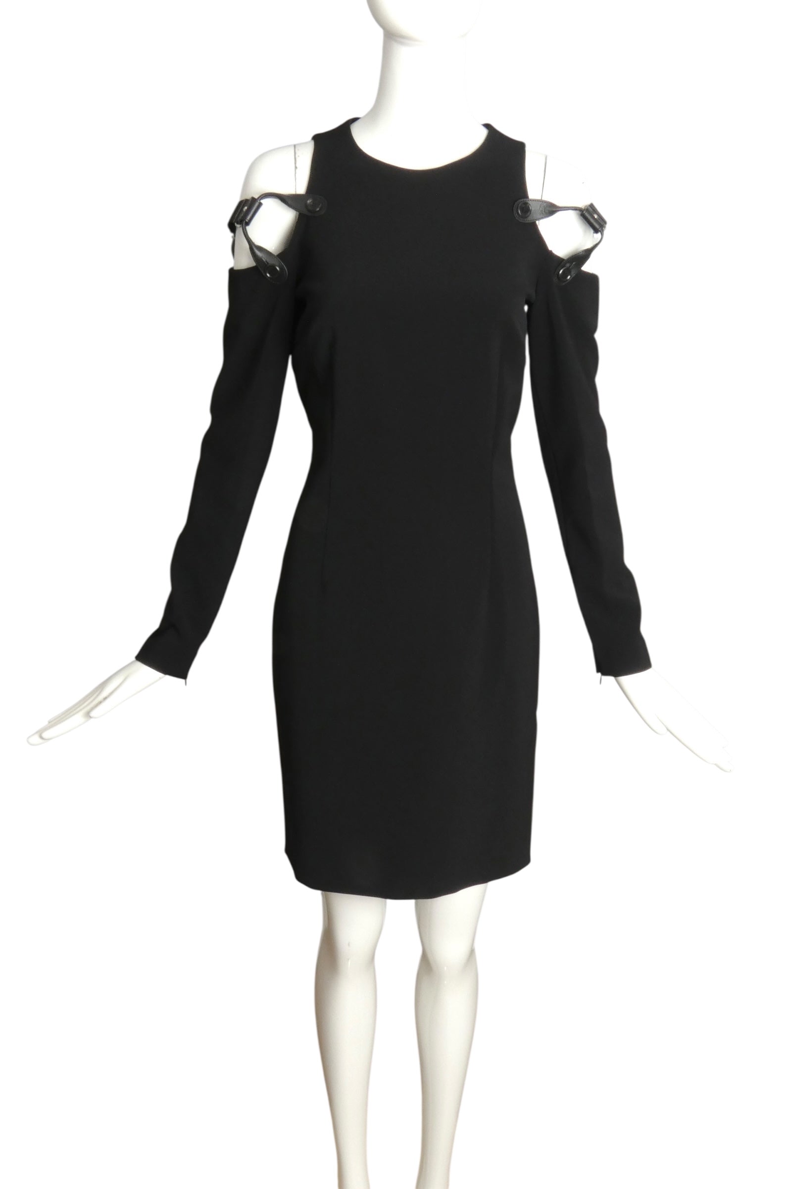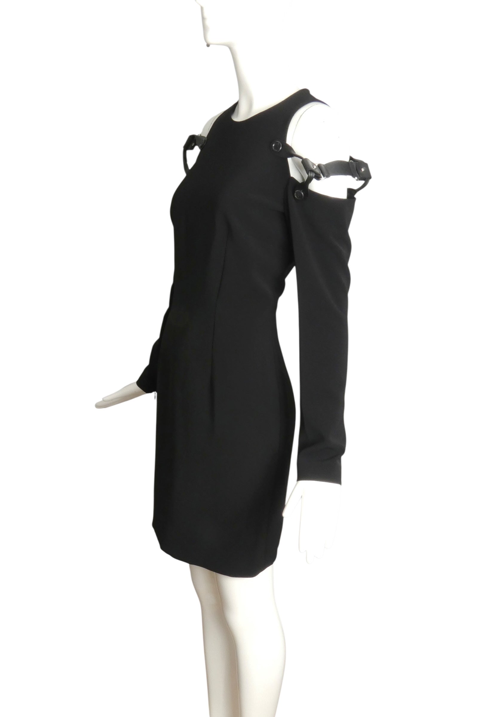 Description: Hailing from the Pre Fall 2018 collection, this eye-catching black knit dress showcases fashionable shoulder cutouts and the distinctive suspender strap accents that dominated the runway. The dart-fitted shift design sculpts the body with elegant refinement. Brand new with Moschino tags attached, this size 8 dress is the perfect bold choice for making a memorable style statement.