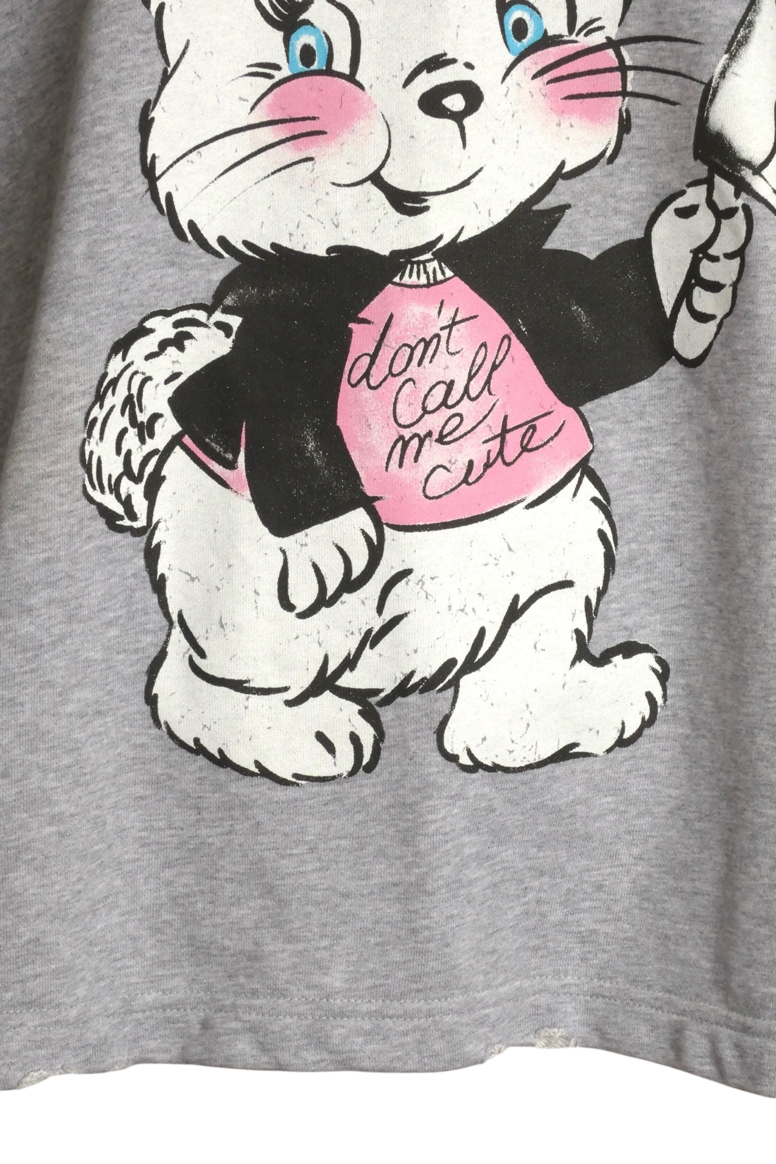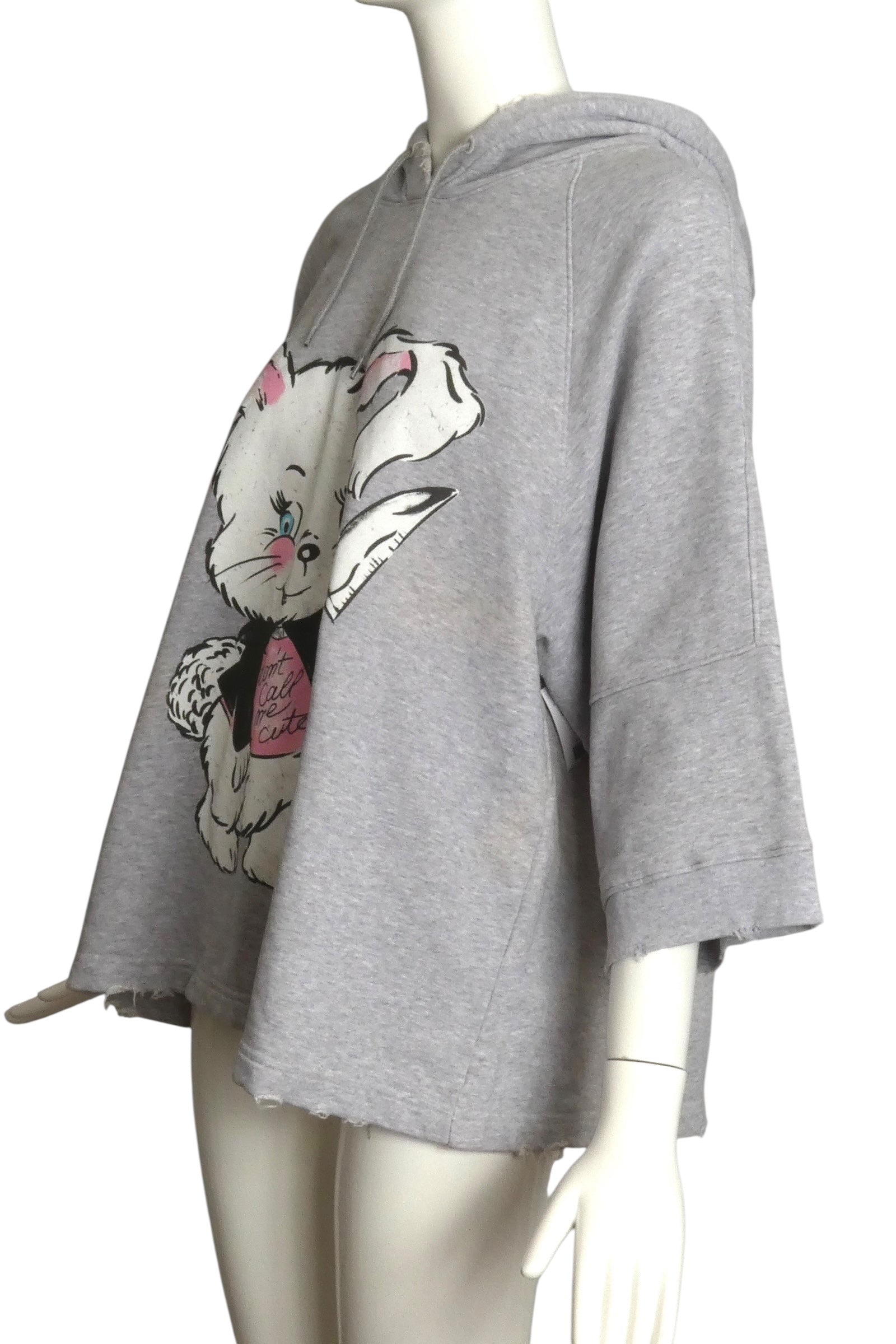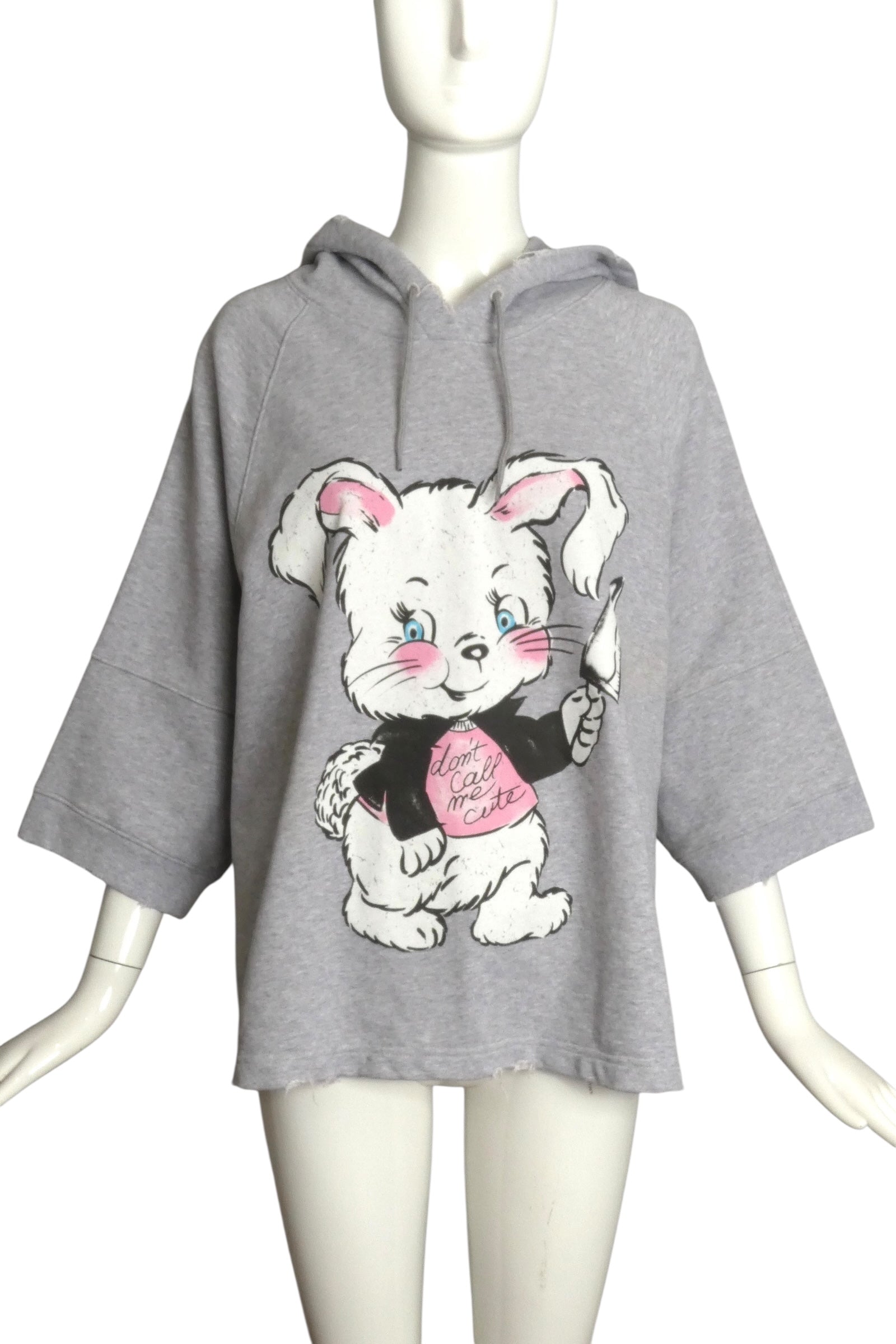 Description: Part of Moschino’s 2020 Halloween runway collection, this grey distressed sweatshirt hoodie features a bold design with a playful horror twist. Sporting worn edges and a large graphic of a bunny holding a knife with the phrase "Don't Call Me Cute," it perfectly balances cute and edgy elements.