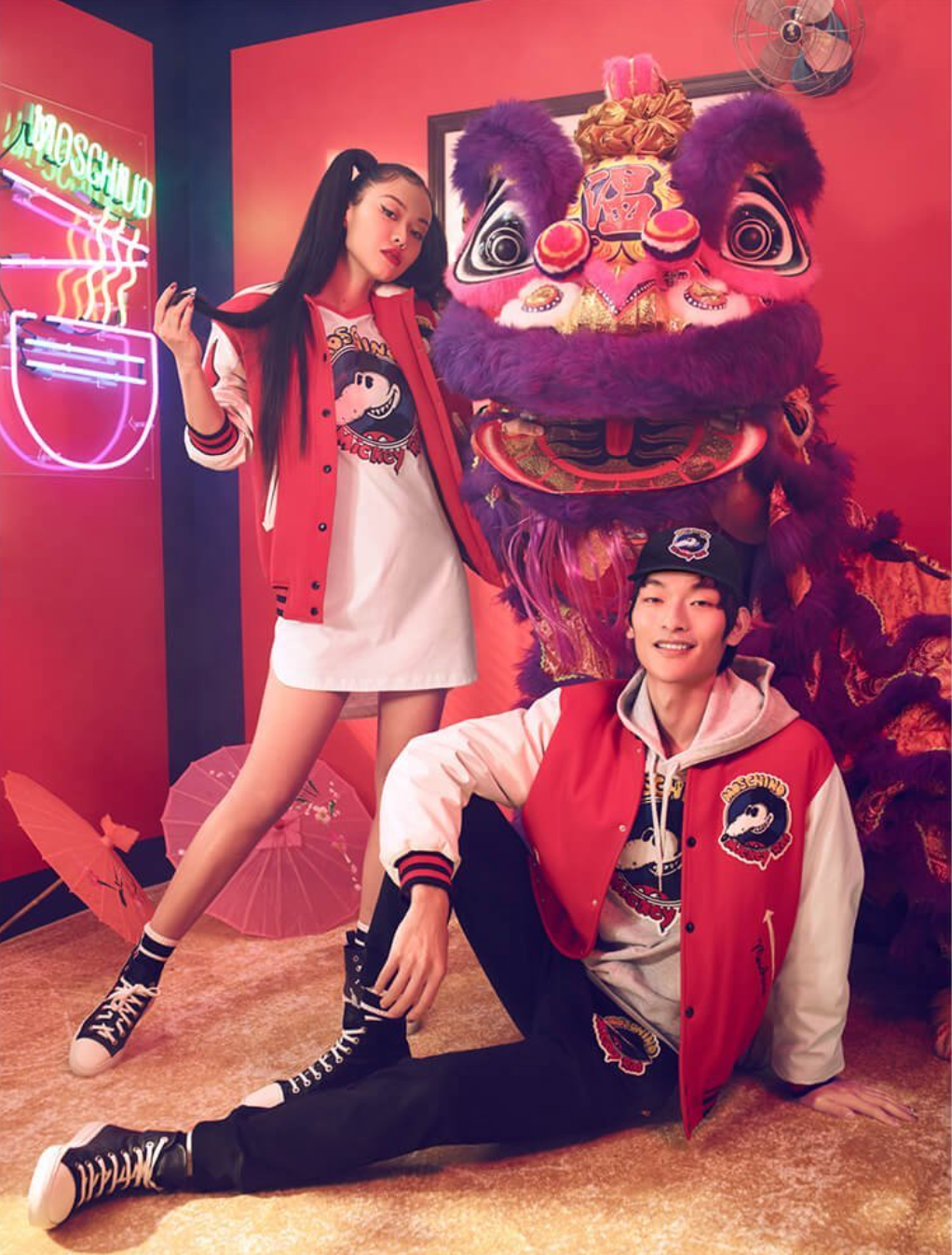 Description: This bold varsity jacket is from Moschino’s 2020 Couture Chinese New Year capsule. Made with red and ivory wool and sharp white leather sleeves, it features Jeremy Scott’s witty "Mickey Rat" patch on the chest and back. New with tags, it adds a playful spin to this timeless jacket.