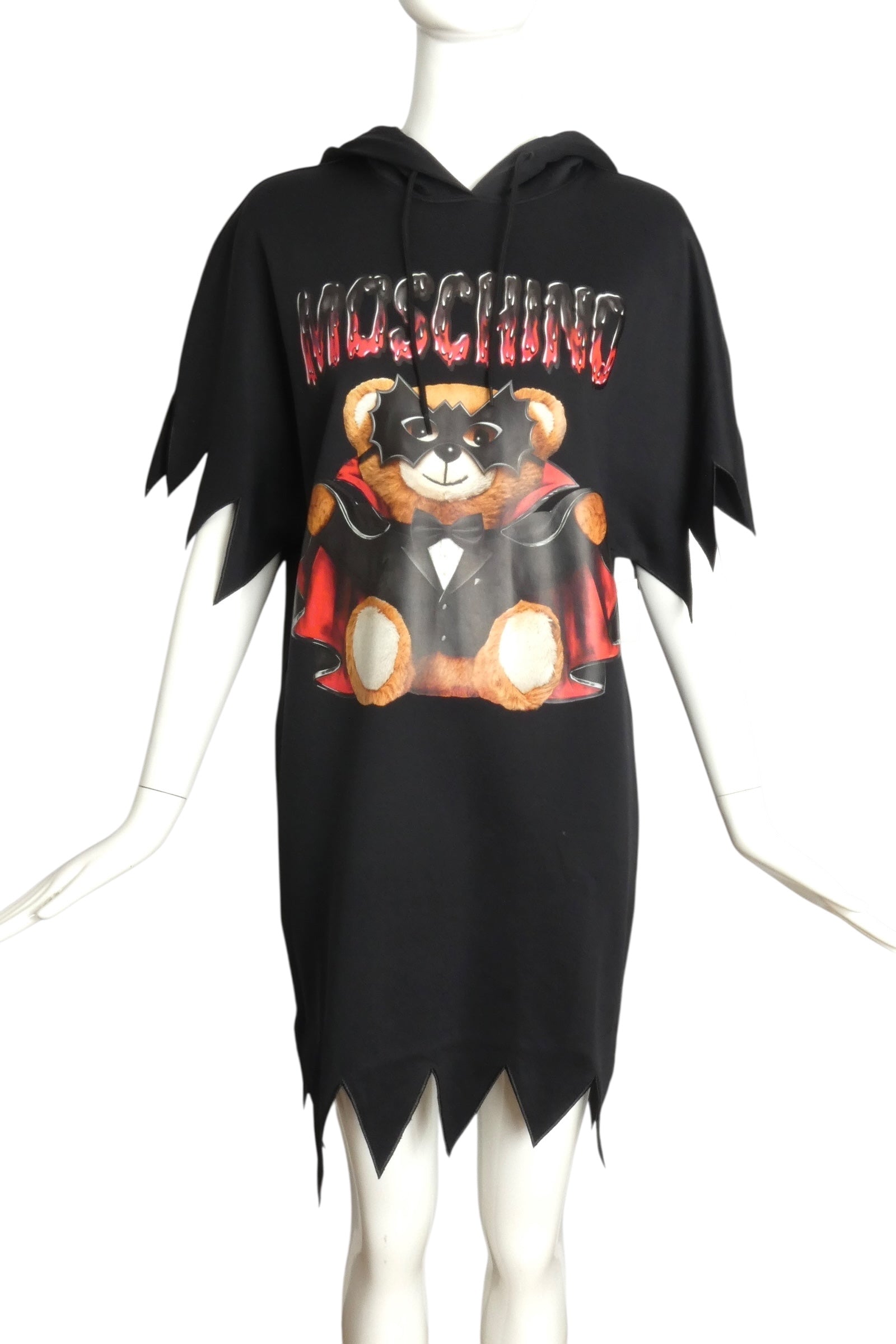 Description: From Moschino’s 2020 Halloween runway collection, this black sweatshirt dress combines bold design with playful gothic charm. Featuring an attached hoodie, short sleeves, and jagged edged hems, it stands out with the iconic teddy bear adorned in a Dracula cape and bat mask on the front and back. Brand new with store tags still attached, this piece perfectly balances fun horror with high-fashion appeal.
