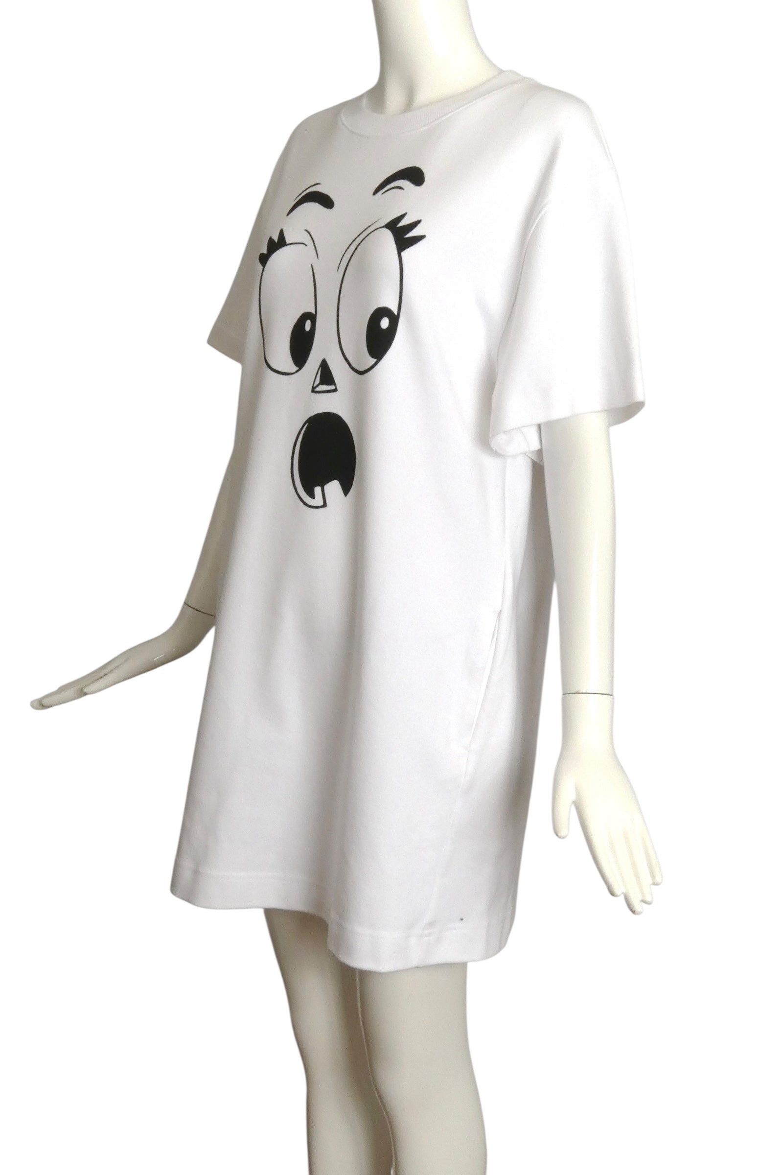 Description: From Moschino’s 2020 Resort collection, this playful dress showcases a charming scaredy ghost motif on the front. The oversized sweatshirt style features a ribbed knit neckline, short sleeves, and side seam inset pockets for added practicality. New with original store tags, this dress offers a unique blend of comfort and standout design, ideal for Halloween occasions.