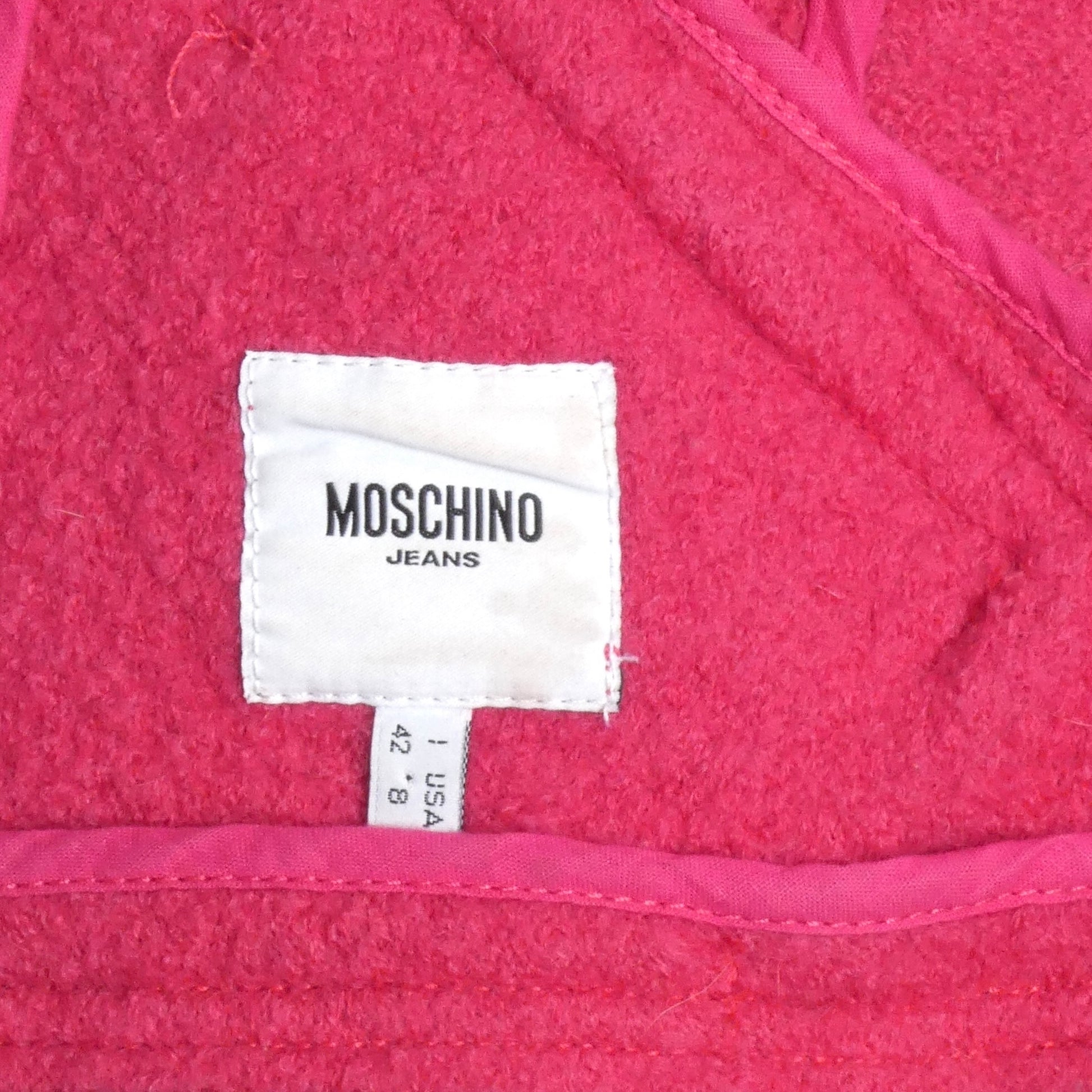 Description: Brighten your wardrobe with this charming pink boucle wool knit blazer from Moschino Jeans. It flaunts playful notched lapels and oversized pink buttons that make a fun and fashionable statement. The inset waist pockets, topped with flaps, show off the bold pewter "Moschino Jeans" lettering—a quirky designer twist. With its perfect fit and delightful texture, this blazer is ready to add a splash of personality to any stylish outfit.