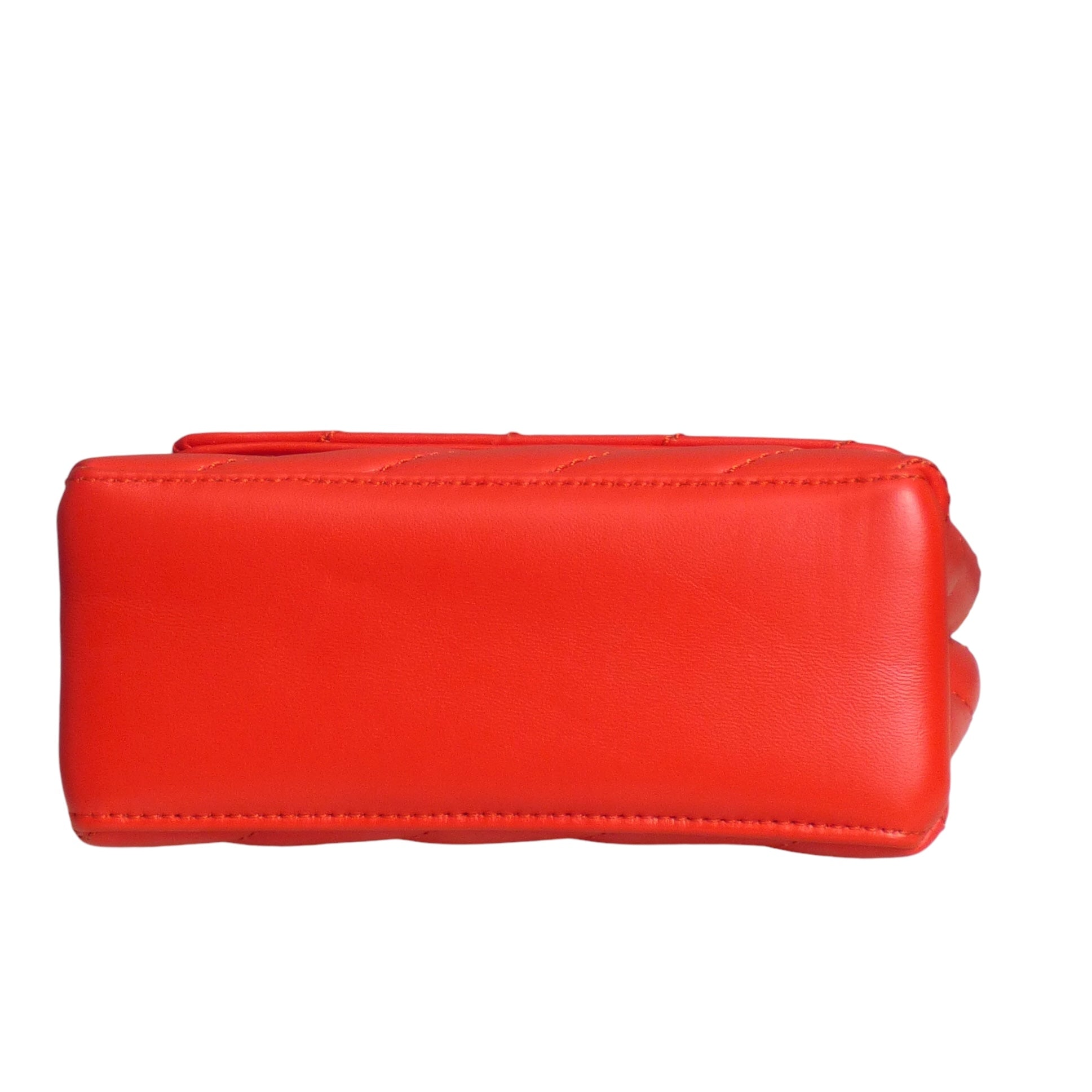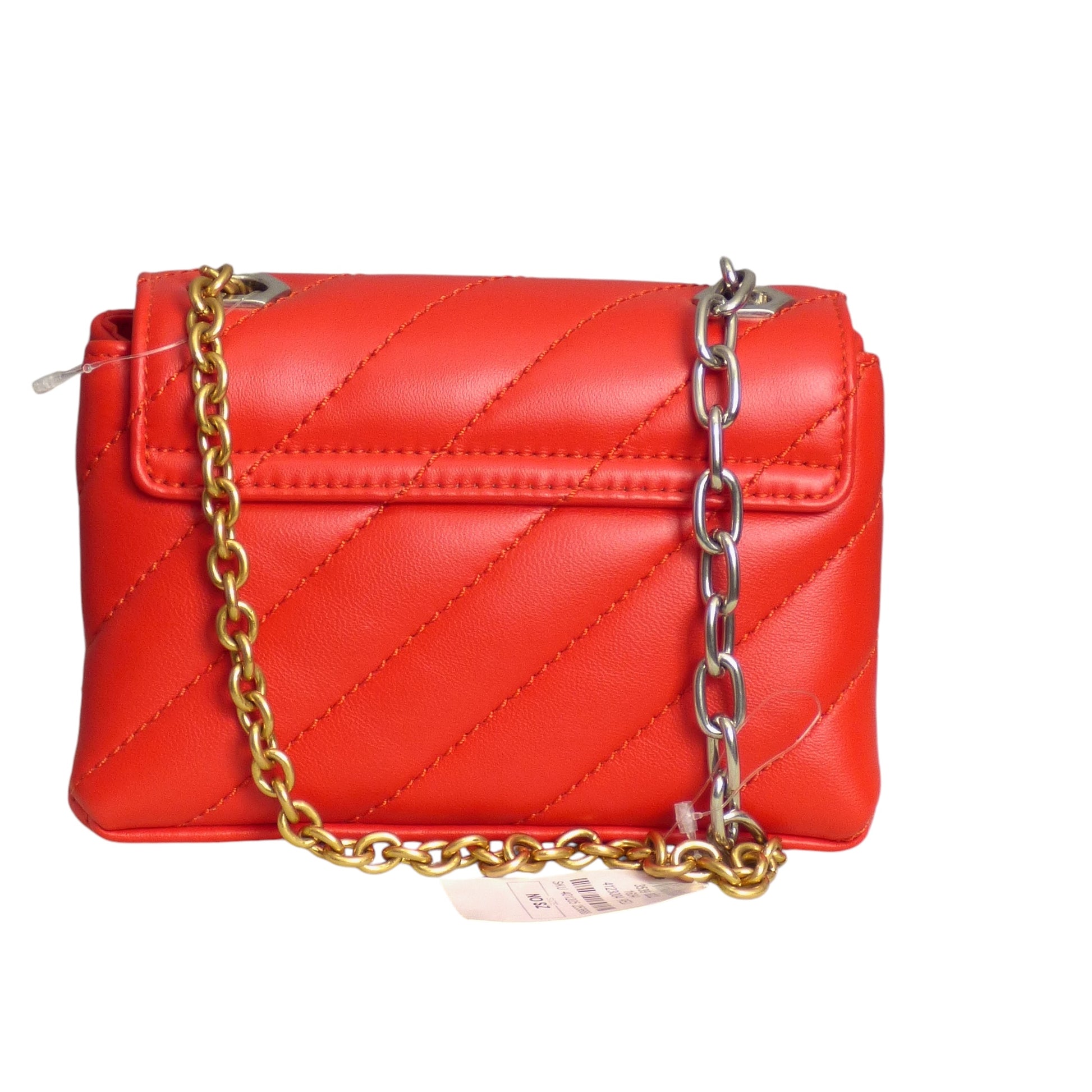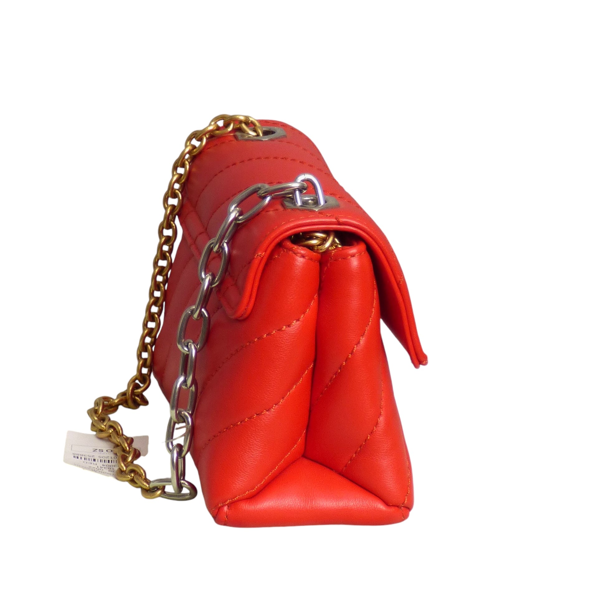 Description: Red leather shoulder bag with a quilted design. Magnetic press-stud flap closure and a metallic arrow plaque on the front. Includes stylish chain shoulder straps.
