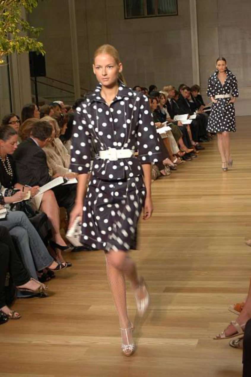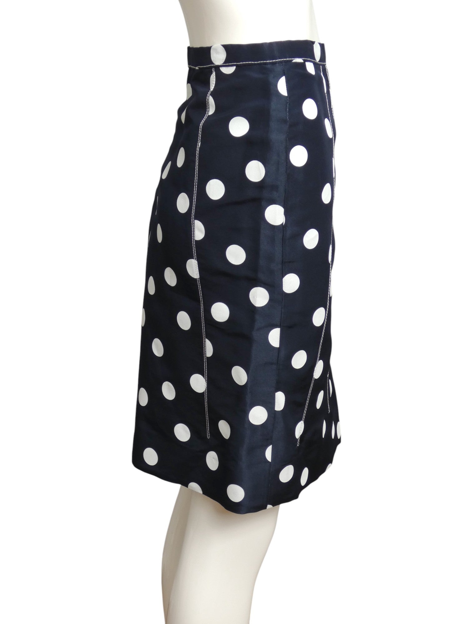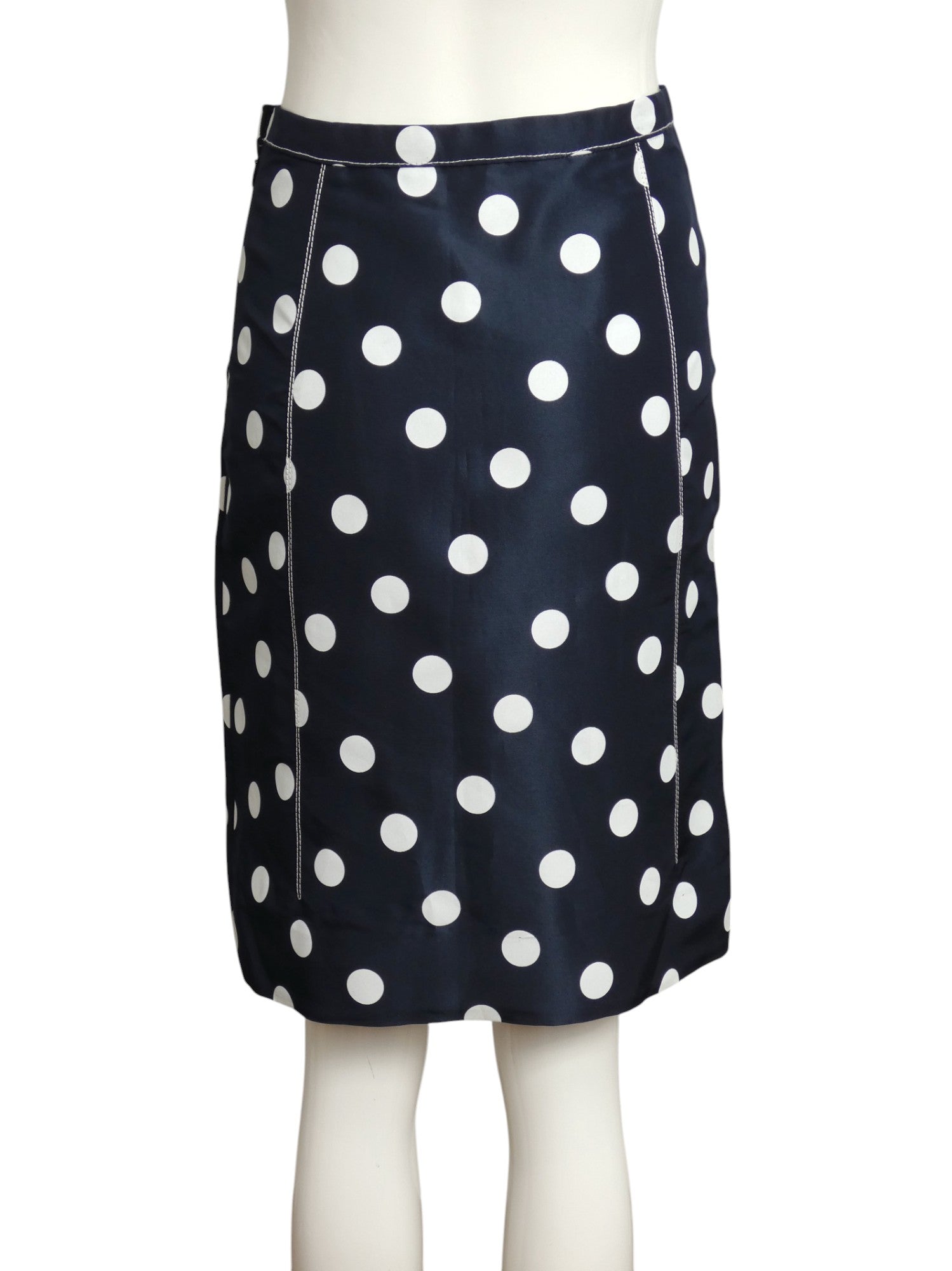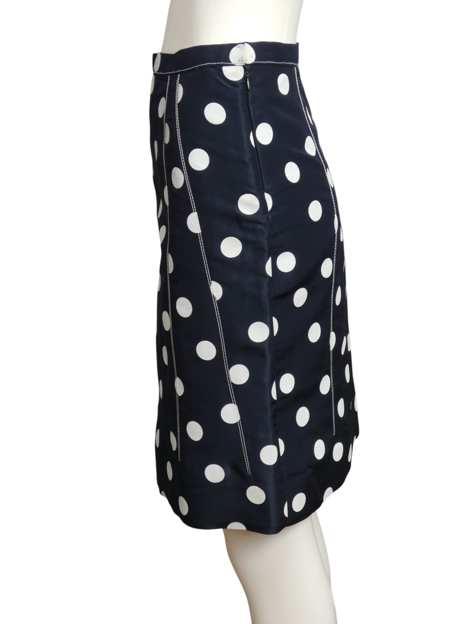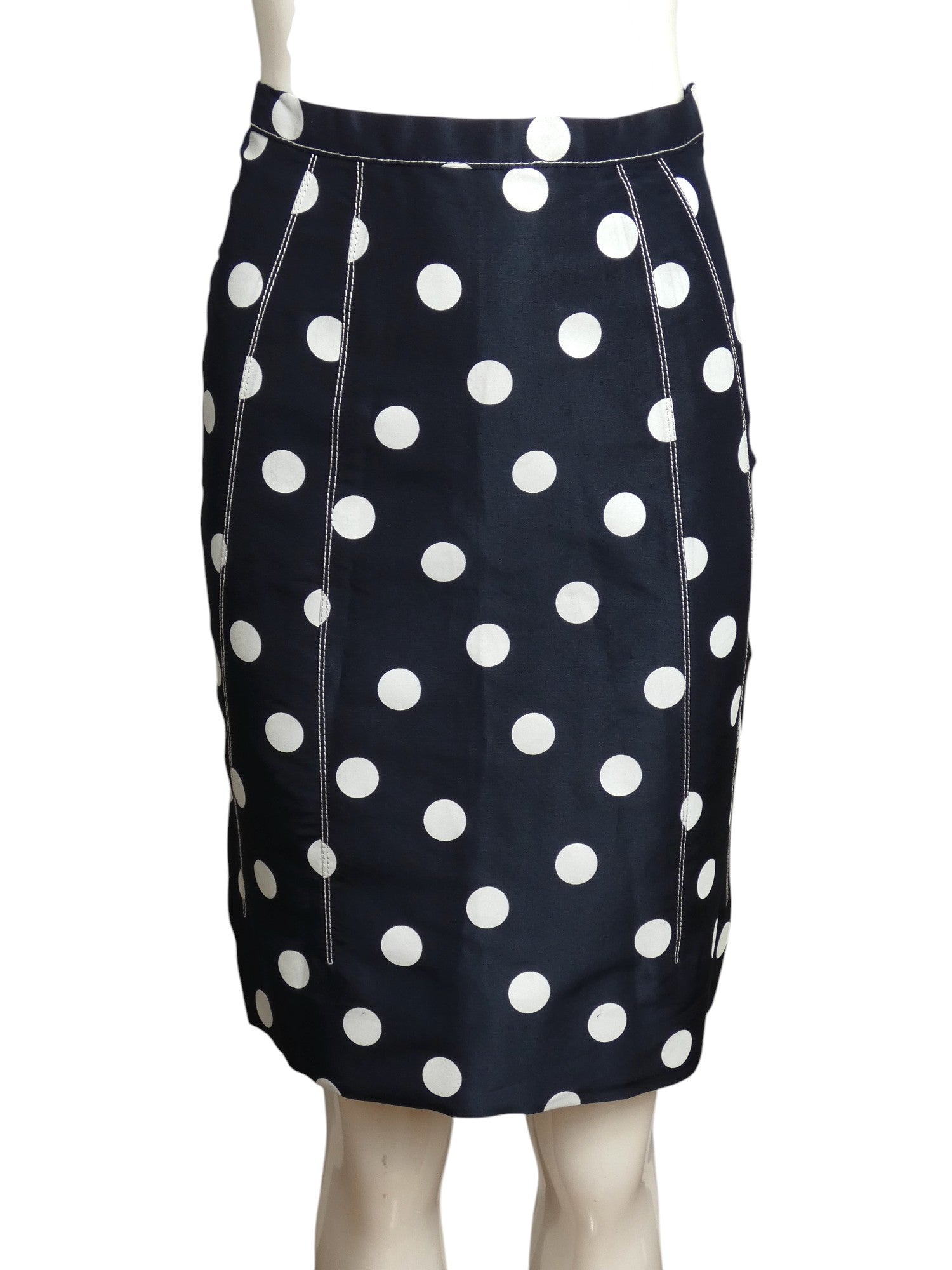 Description: Experience bold and daring fashion with this must-have skirt from OSCAR DE LA RENTA's Resort 2007 runway collection! Featuring a classic navy and white polka dot print, this bell-shaped skirt accentuates the narrow waistband and boasts decorative white stitching for a touch of flair. Elevate your style and take a risk with this statement piece!