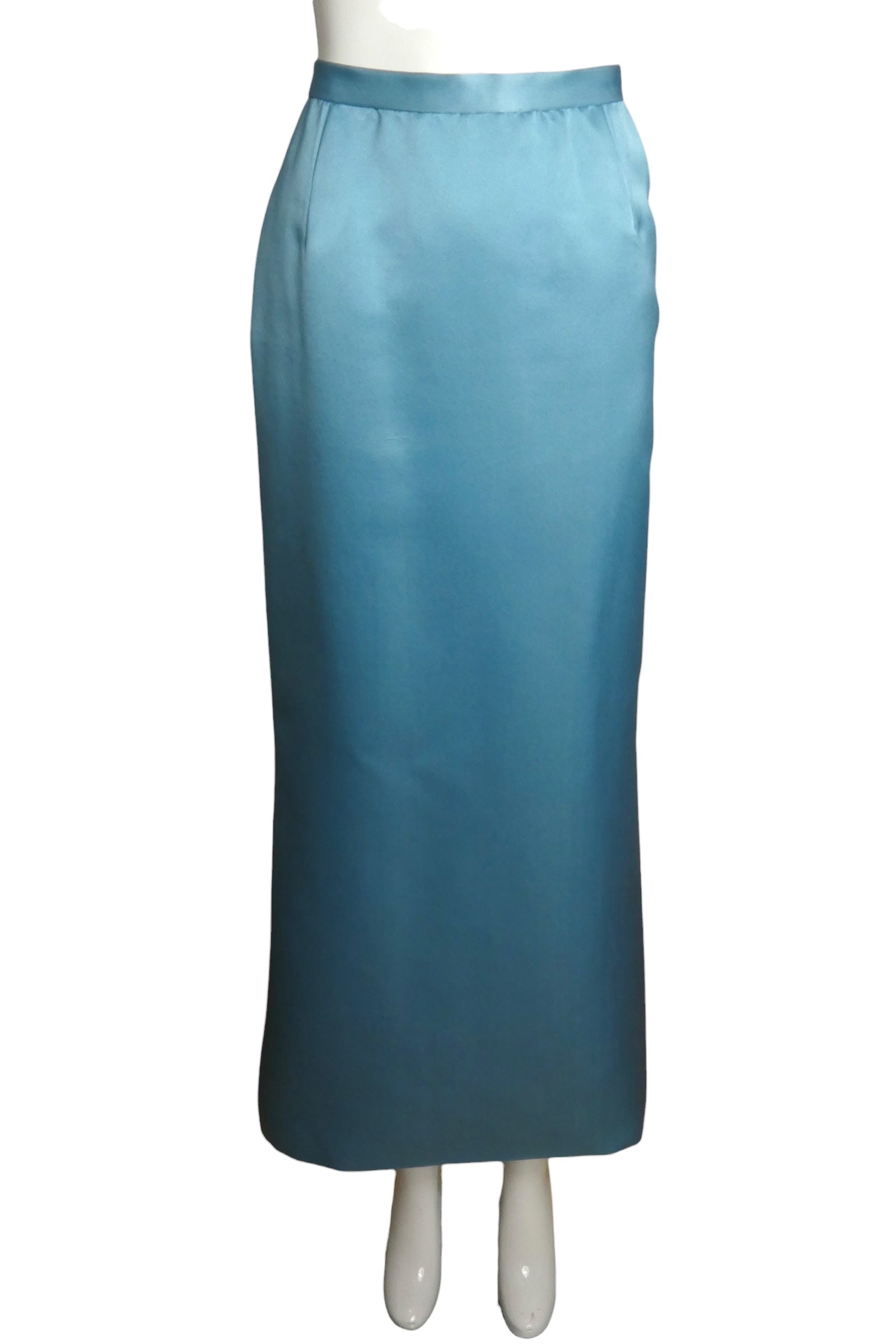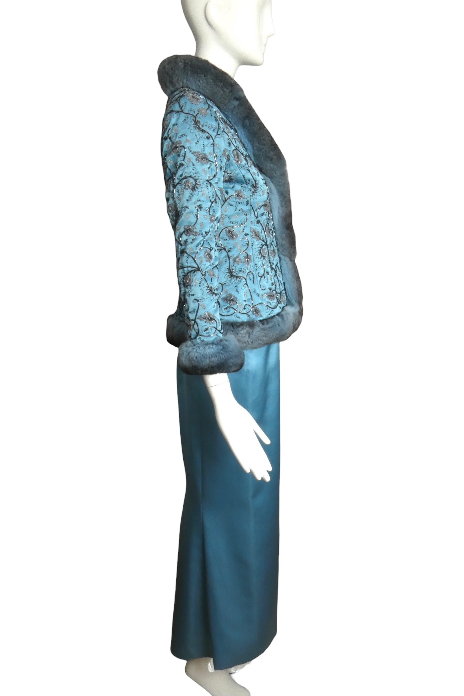 Description: An exquisite evening ensemble by Oscar de la Renta, this two-piece suit represents the pinnacle of luxury eveningwear craftsmanship. The richly hued blue silk foundation provides an elegant canvas for the blazer's sophisticated construction, which is meticulously adorned with sumptuous dyed blue chinchilla trim and elaborate beadwork with intricate embroidery throughout. The coordinating evening skirt completes the refined silhouette. This exceptional piece exemplifies the designer's mastery of haute couture techniques and demonstrates the meticulous attention to detail that defines de la Renta's celebrated aesthetic.