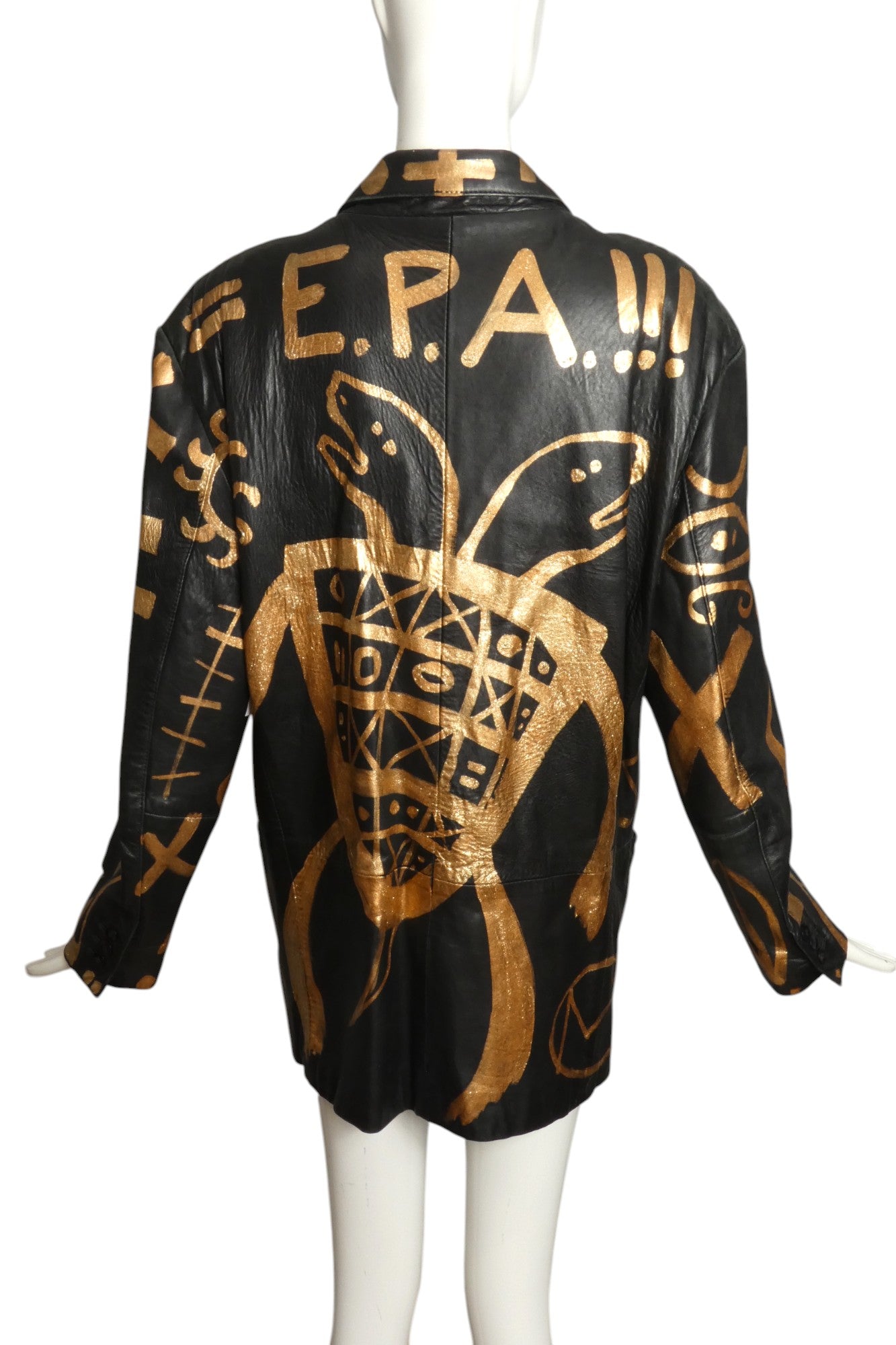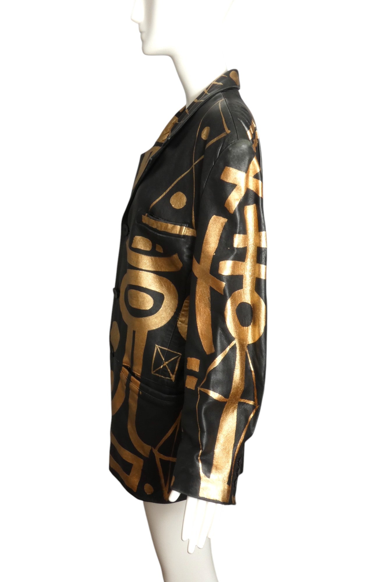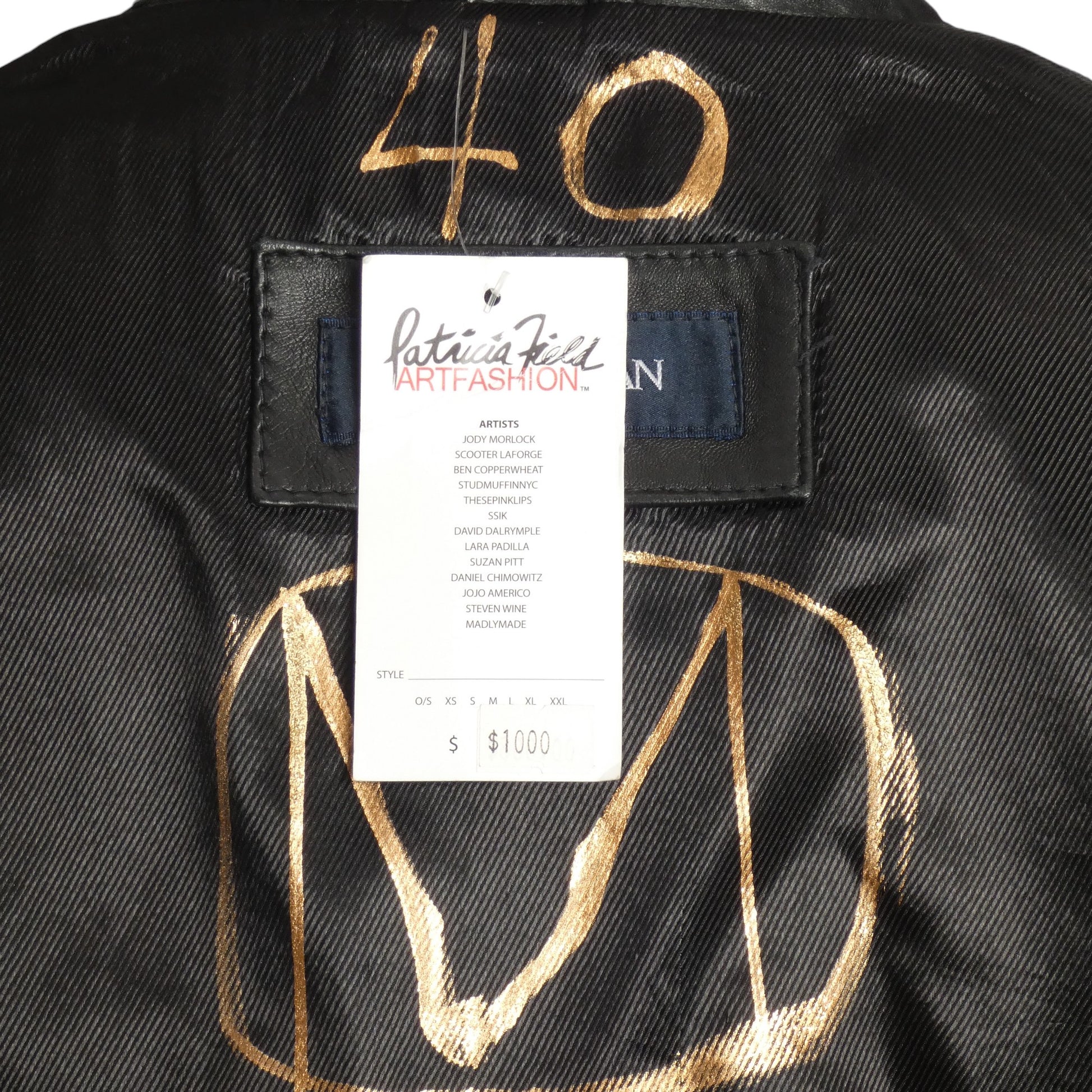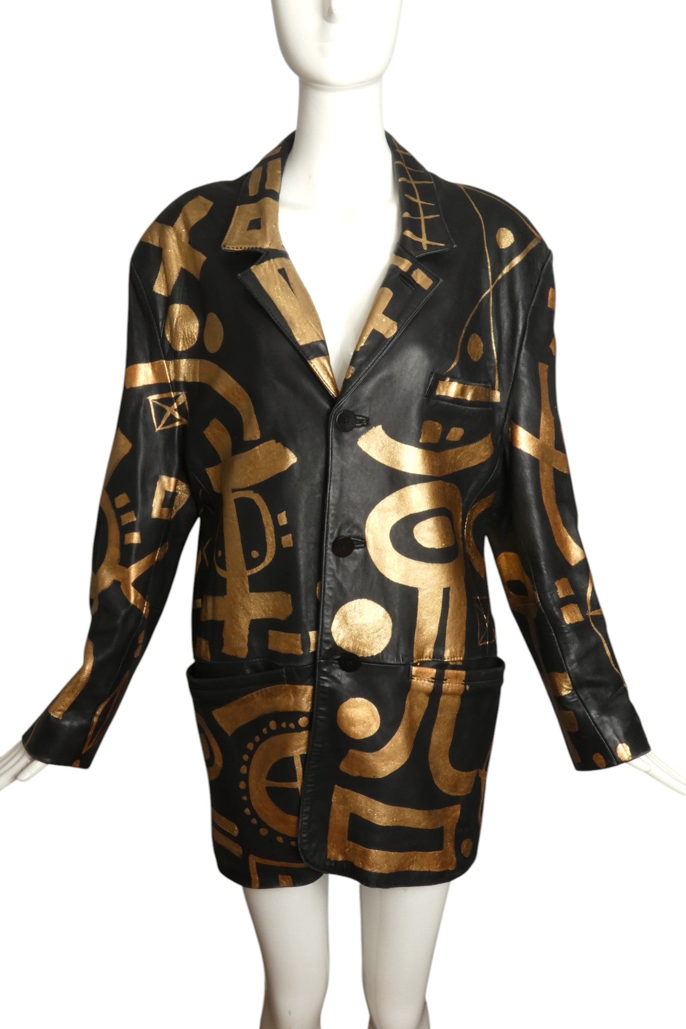 Description: This extraordinary leather blazer from Patricia Field Art Fashion Collection showcases stunning artistry with hand-applied gold paint and dazzling glitter embellishments. The vintage piece features classic notched lapels and front button closure, transforming a timeless silhouette into a wearable masterpiece that demands attention wherever you go.