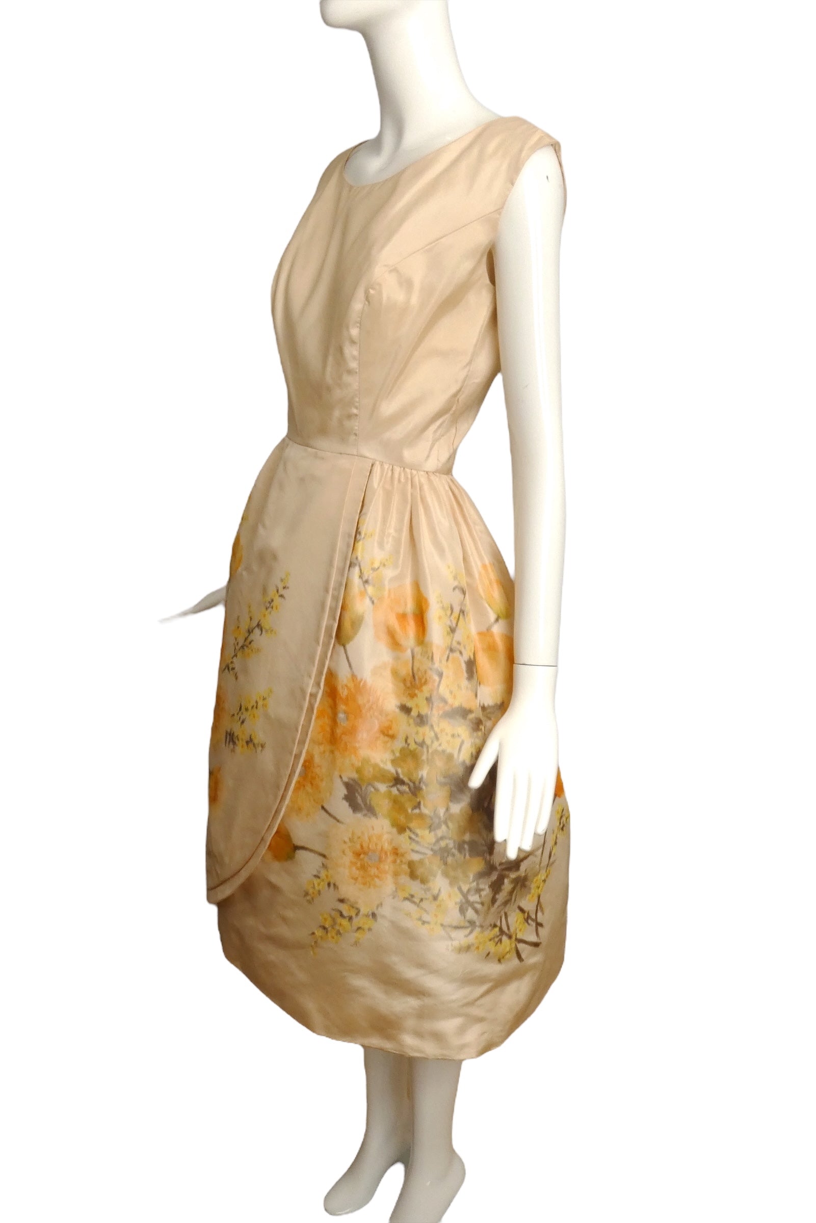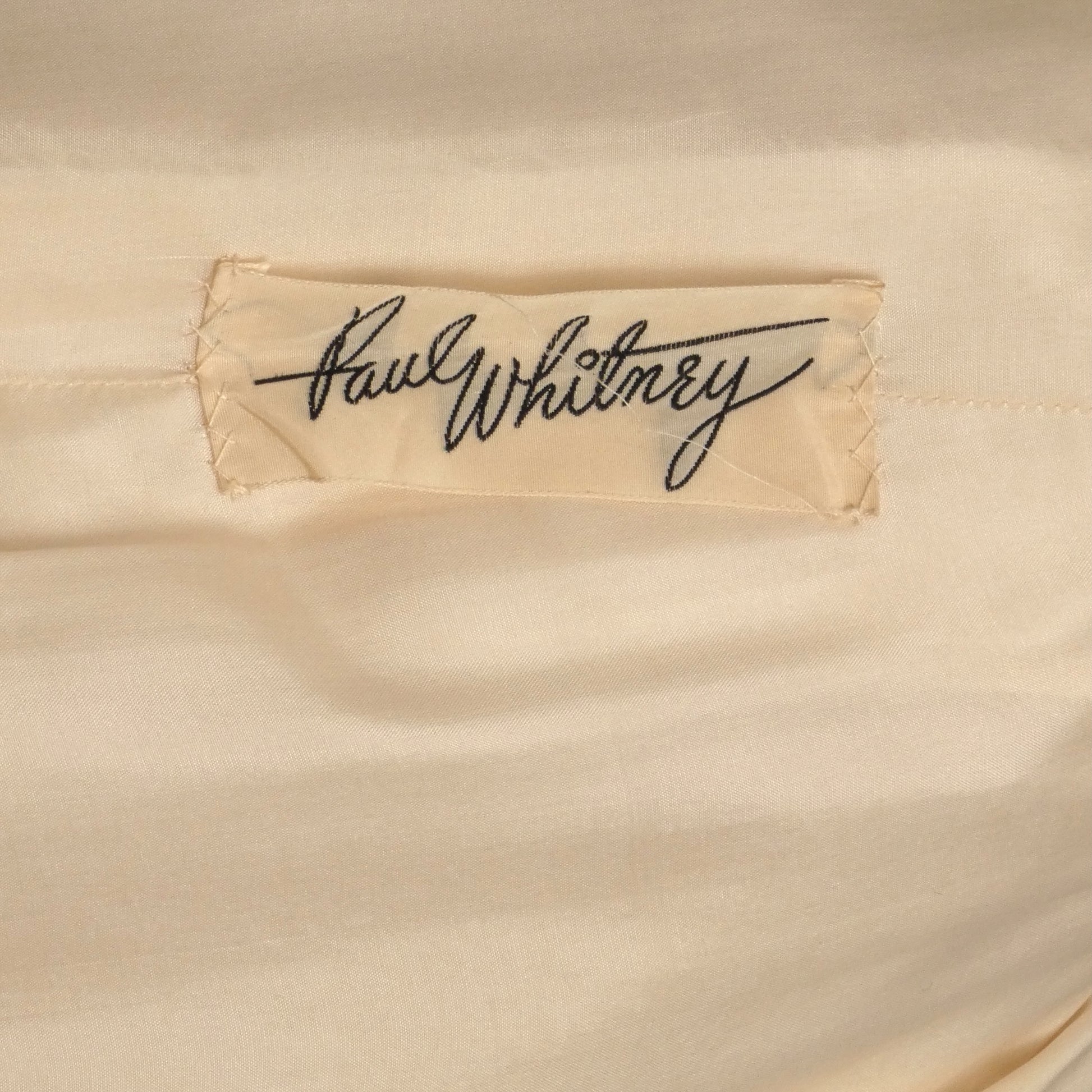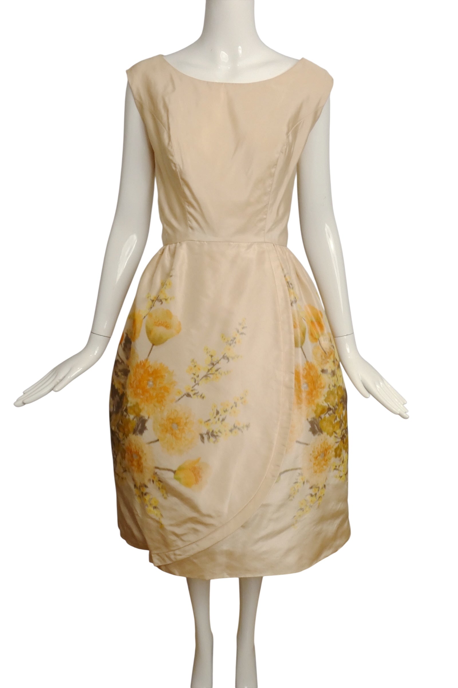 Description: Travel back to the fabulous 1950s with this charming Paul Whitney dress, a vintage treasure full of grace and style. Made from soft ivory silk, it’s adorned with cheerful yellow flowers that twirl across the flared skirt, blending whimsy with elegance. The fitted bodice highlights your shape, while the gathered sides and overlapping skirt add a fun, flirty twist. Ideal for garden soirees or special events, this dress will have you feeling like the star of the party!
