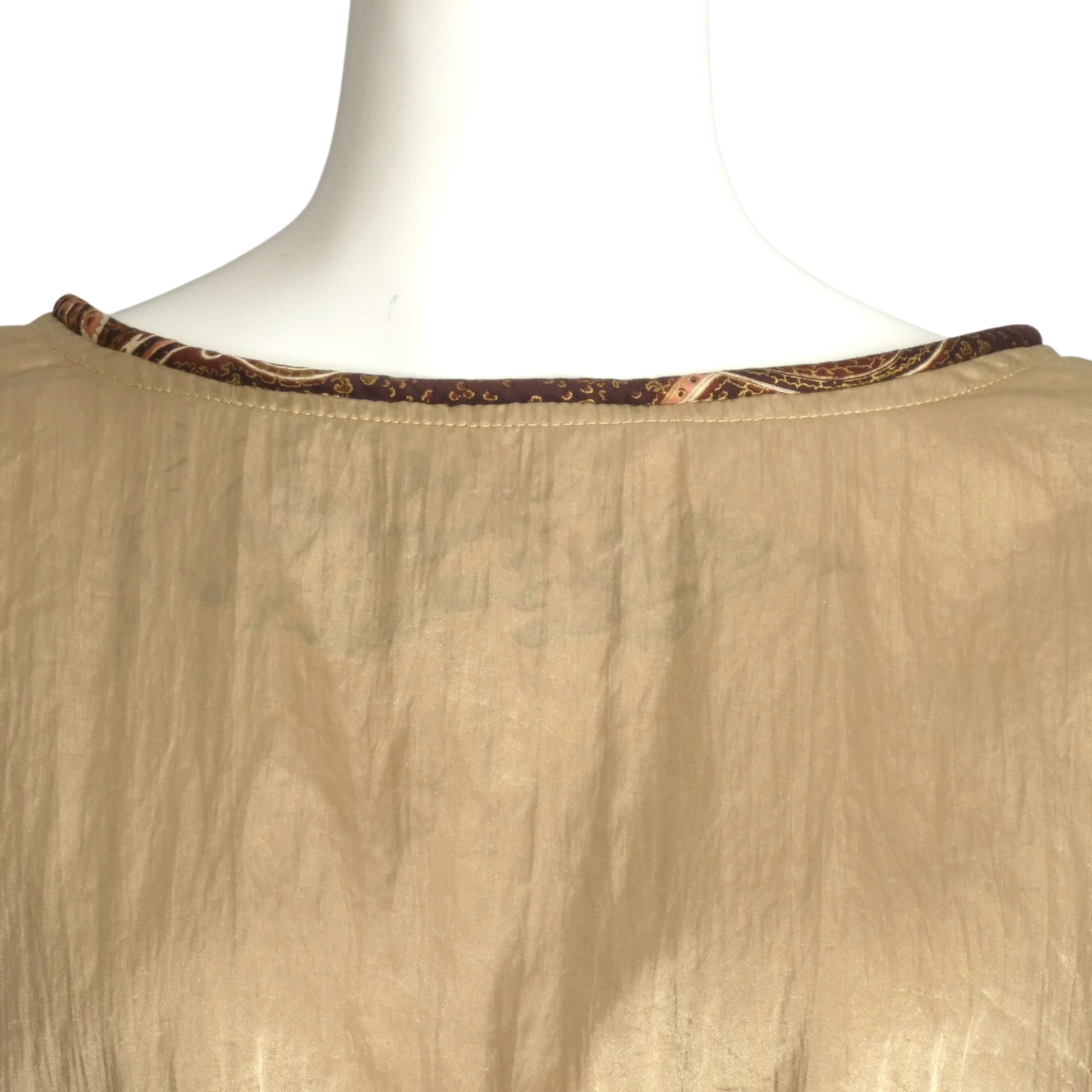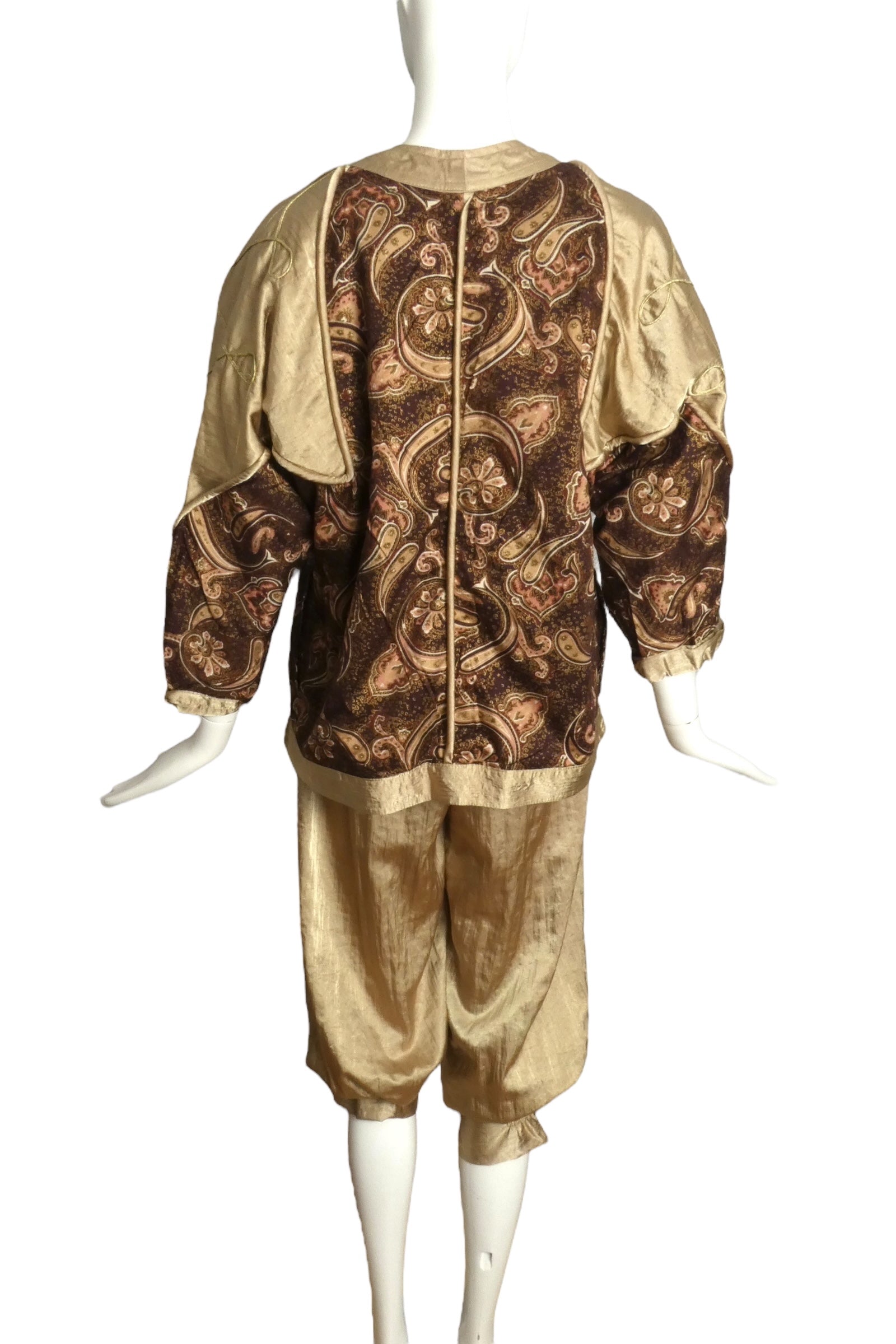 Description: Embrace the spirited charm of the 1970s with this eye-catching 3-piece Pierre Cardin-inspired set. The rich burnished gold satin contrasts delightfully with paisley sateen, creating a vibrant ethnic-inspired design. The jacket, lined with elegant Pierre Cardin fabric, closes with a single-button loop and showcases large rosettes topped with gleaming gold lamé centers. Pair it with the coordinating gold chemise that ties at the waist, and complete the outfit with genie pants featuring a wide waistband, hip yoke, and elasticized, ruffled cuffs.