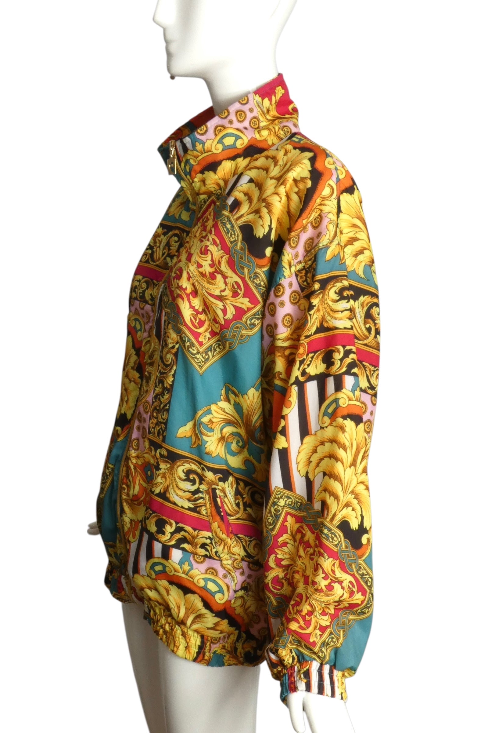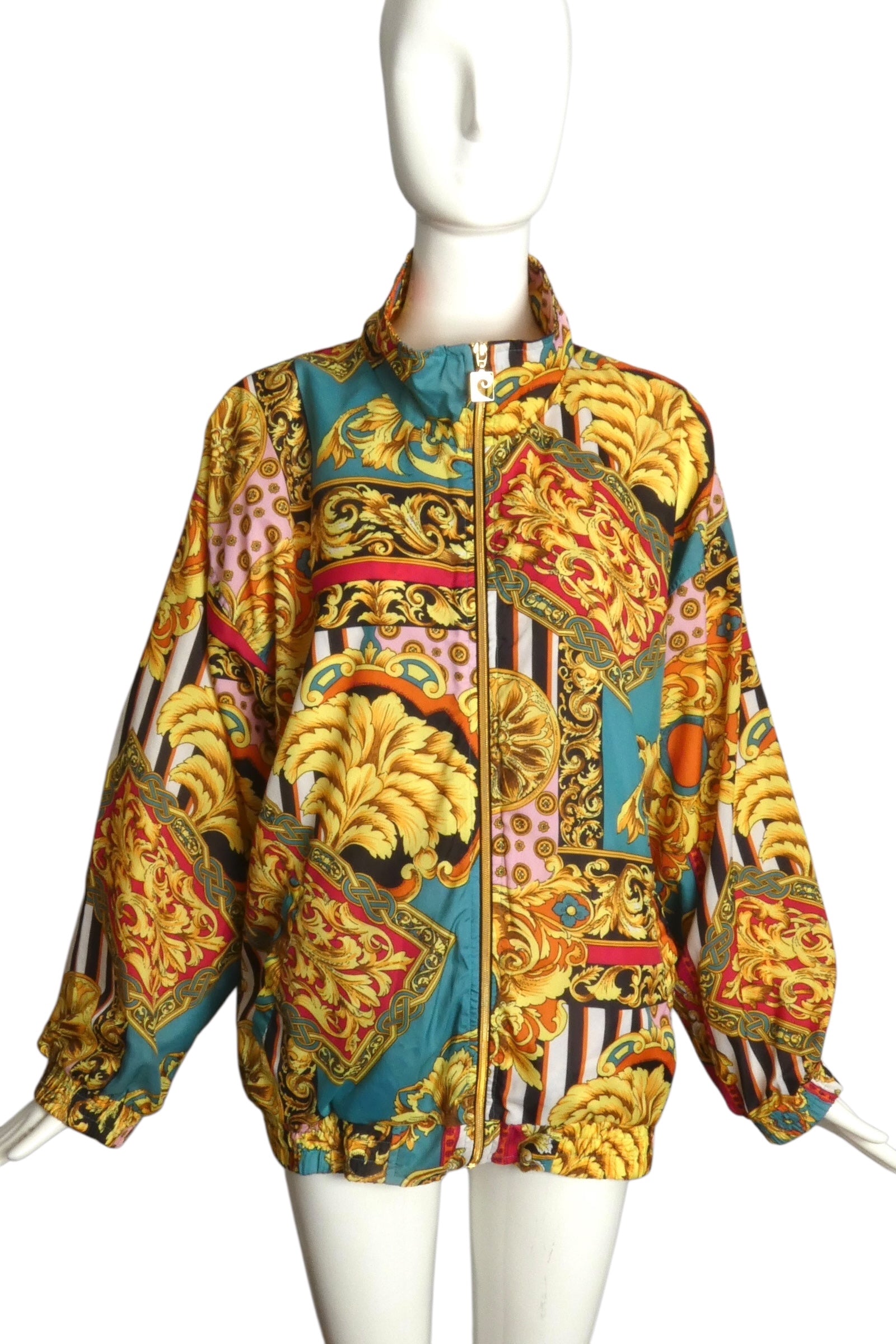 Description: Step back into the bold 1980s with this Pierre Cardin satin track jacket bursting with vibrant baroque prints. Featuring a fluted collar and slick zipper with a signature PC logo pull, it’s as stylish as it is fun. Inset pockets and elastic wrist gathers keep things practical and comfy while you flaunt those long sleeves. Perfect for adding a pop of vintage flair to any outfit!