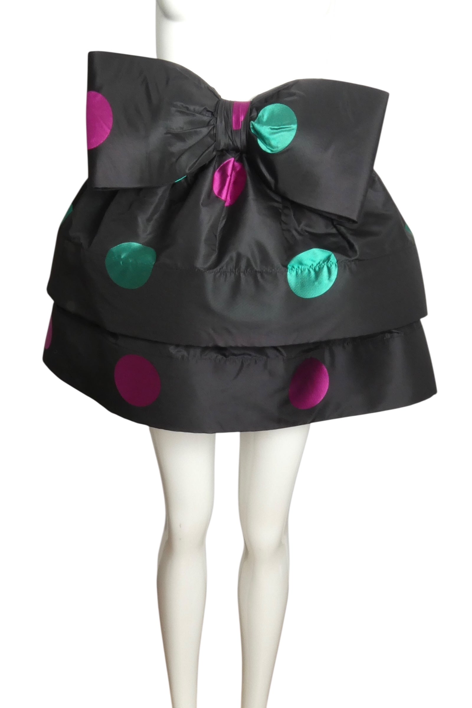 Description: Make a bold statement with this charming Pierre Cardin 1990s mini skirt in lustrous black taffeta adorned with shiny polka dots. The playful design features gathered tiers that cascade from a luxurious wide black velvet elastic waistband, crowned with an eye-catching oversized bow at the front. Strategic hemline stiffening creates dramatic volume and movement, while the gathered silhouette flatters with effortless flair. Perfect for those who embrace vintage glamour with a touch of whimsy.
