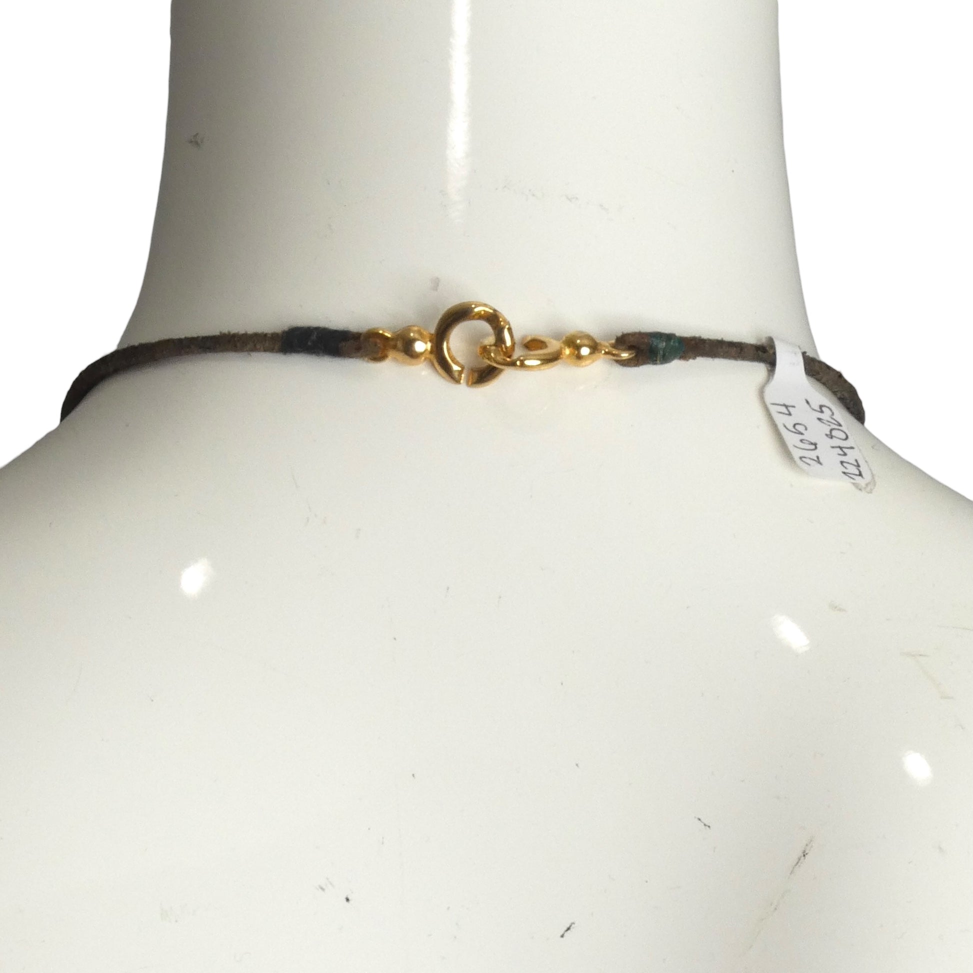 Description: A striking piece from Pierre Cardin's coveted 1993 runway collection, this medallion necklace exemplifies the designer's bold aesthetic vision. Crafted with a supple brown leather cord choker, it features an oversized gold metallic leather drop that commands attention. The hook closure at the back ensures secure wear. As a runway sample never produced for retail, this necklace represents a rare opportunity to own an exclusive, likely one-of-a-kind design that captures the essence of early '90s haute couture.