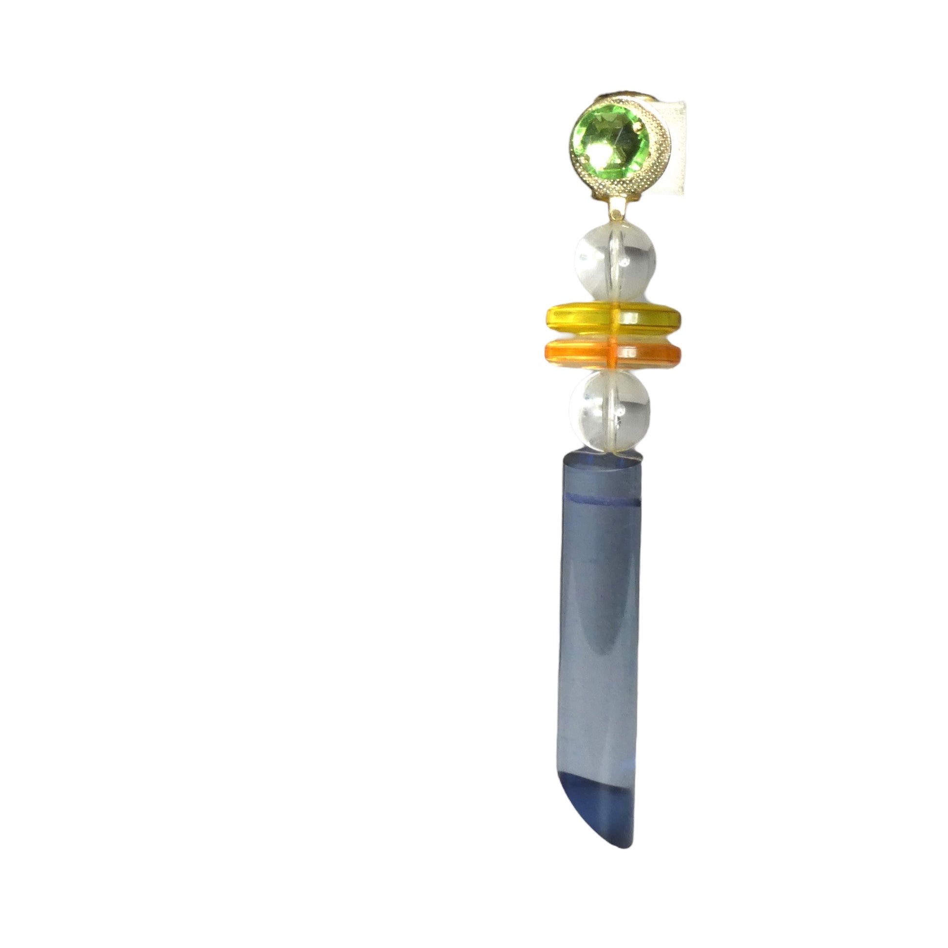 Description: Embrace playful sophistication with this captivating single earring from Pierre Cardin's exclusive 1994 runway collection. This one-of-a-kind piece features a secure clip back crowned with a sparkling green stone that catches light with prismatic brilliance. A delicate filament strand descends from the stone, suspending luminous clear acrylic beads, yellow flat beads followed by an elongated blue acrylic cylinder that creates graceful movement and visual intrigue. Engineered solely for the catwalk and never produced for retail, this architectural earring showcases Cardin's fearless approach to unconventional jewelry design. The official letter of authenticity from Pierre Cardin certifies its runway provenance and exclusivity. For collectors who appreciate bold creativity and documented fashion history, this singular statement piece is an exceptional treasure that celebrates visionary artistry.
