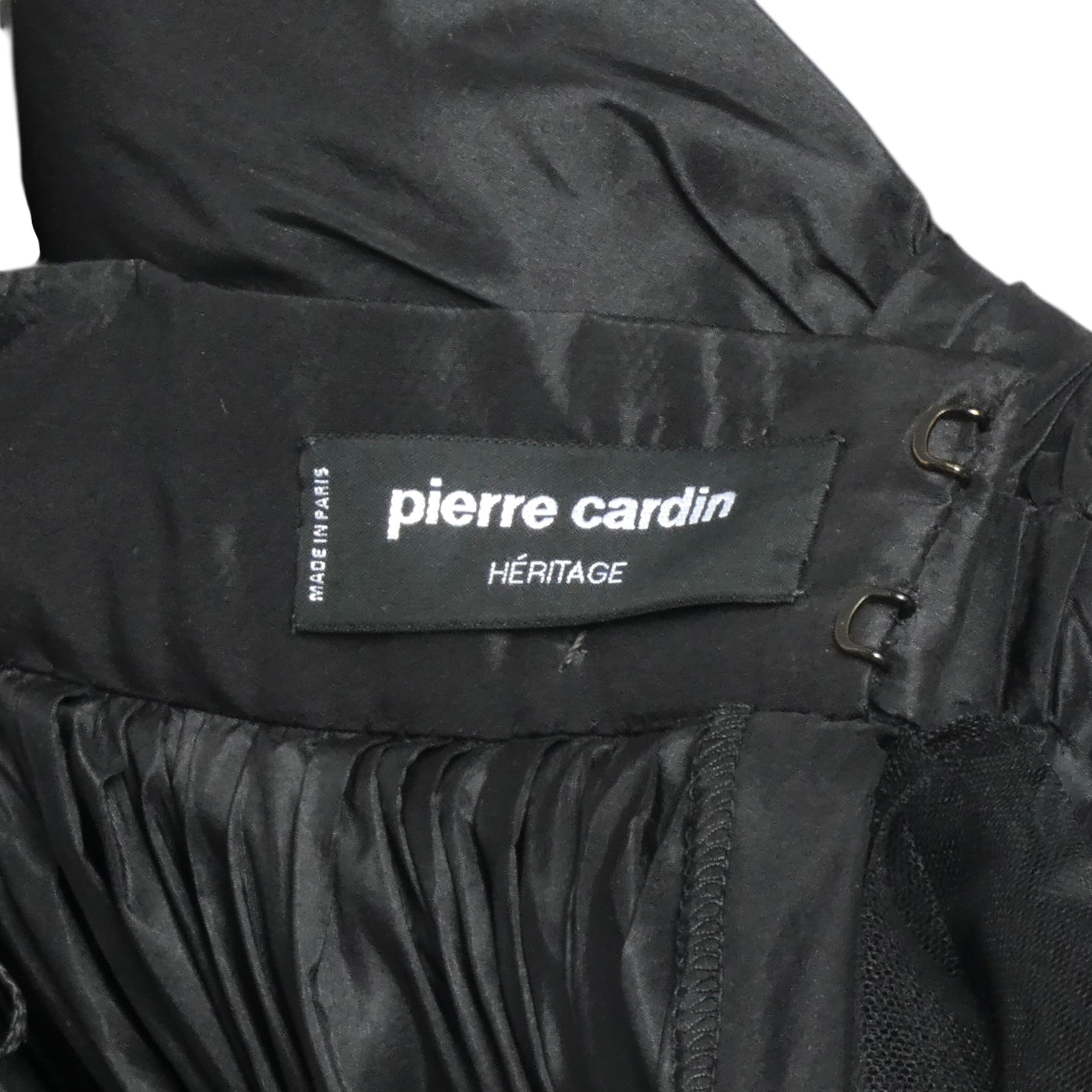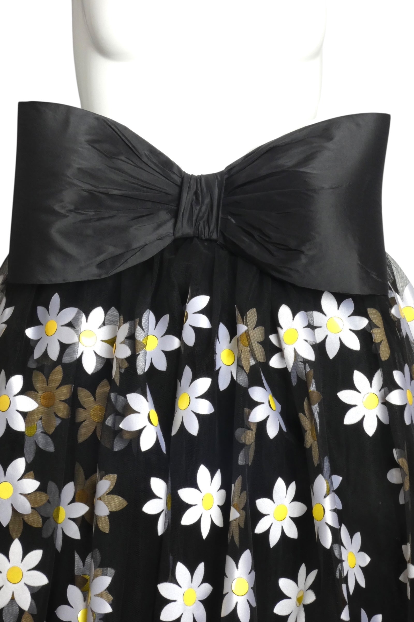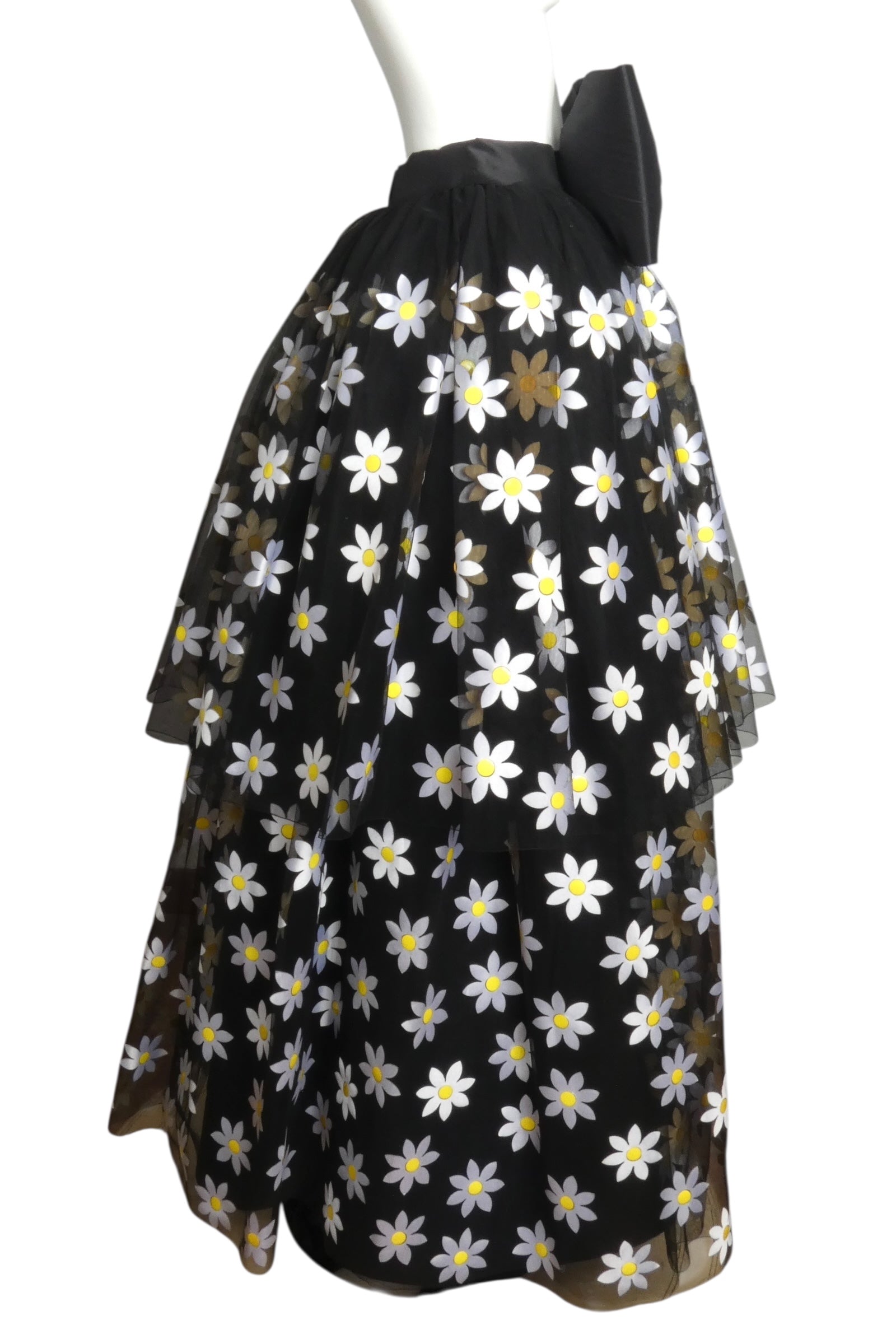 Description: Step into timeless elegance with this stunning 1997 Pierre Cardin ball gown skirt. Black tulle adorned with cheerful white and yellow daisies creates an enchanting floral canvas, while the full gored silhouette gathers gracefully from a sleek black taffeta waistband. The two-tiered construction and structured black taffeta underskirt provide dramatic volume and movement, perfect for making an unforgettable entrance. A luxurious taffeta bow at the front waist adds the final touch of sophistication. Ideal for formal occasions or anyone who appreciates haute couture craftsmanship and romantic, statement-making style.