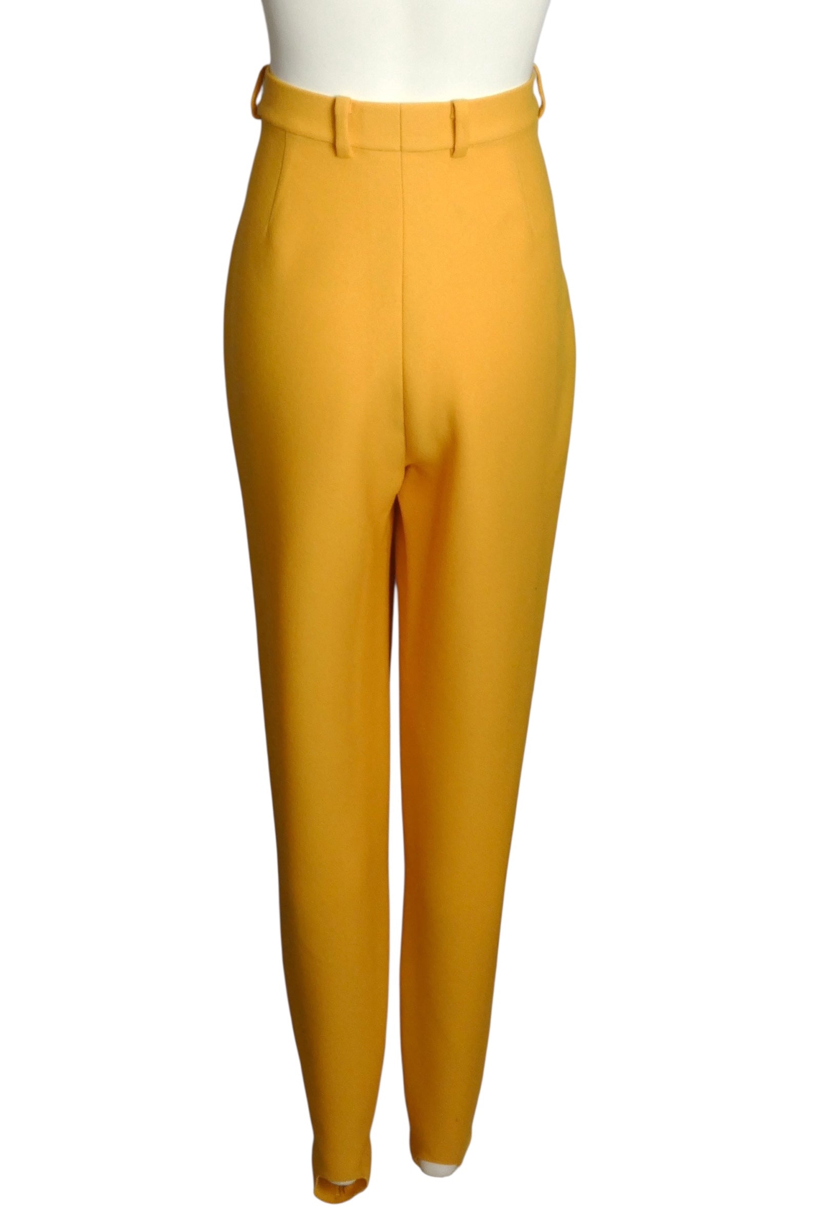 Description: Elevate your wardrobe with these vibrant Pierre Cardin pants from the 2002 collection, where bold color meets sophisticated tailoring. Crafted in luminous yellow crepe, these slacks feature expertly curved inset pockets and precision darts fitted to a refined narrow waistband for a flattering silhouette. The signature swirling seams descend the sides with dynamic flair, culminating in practical stirrups that anchor the leg. This is Cardin's approach to everyday luxury—a piece that proves statement-making style doesn't require evening wear.
