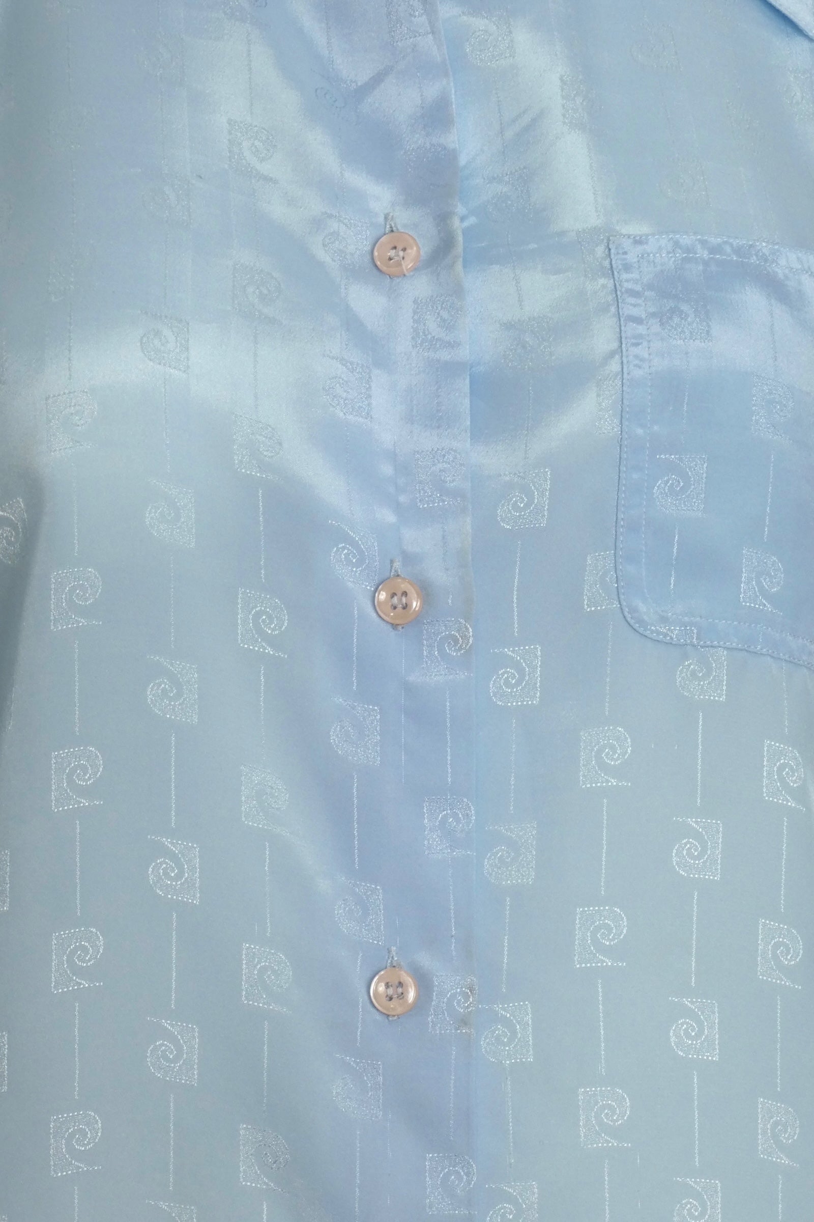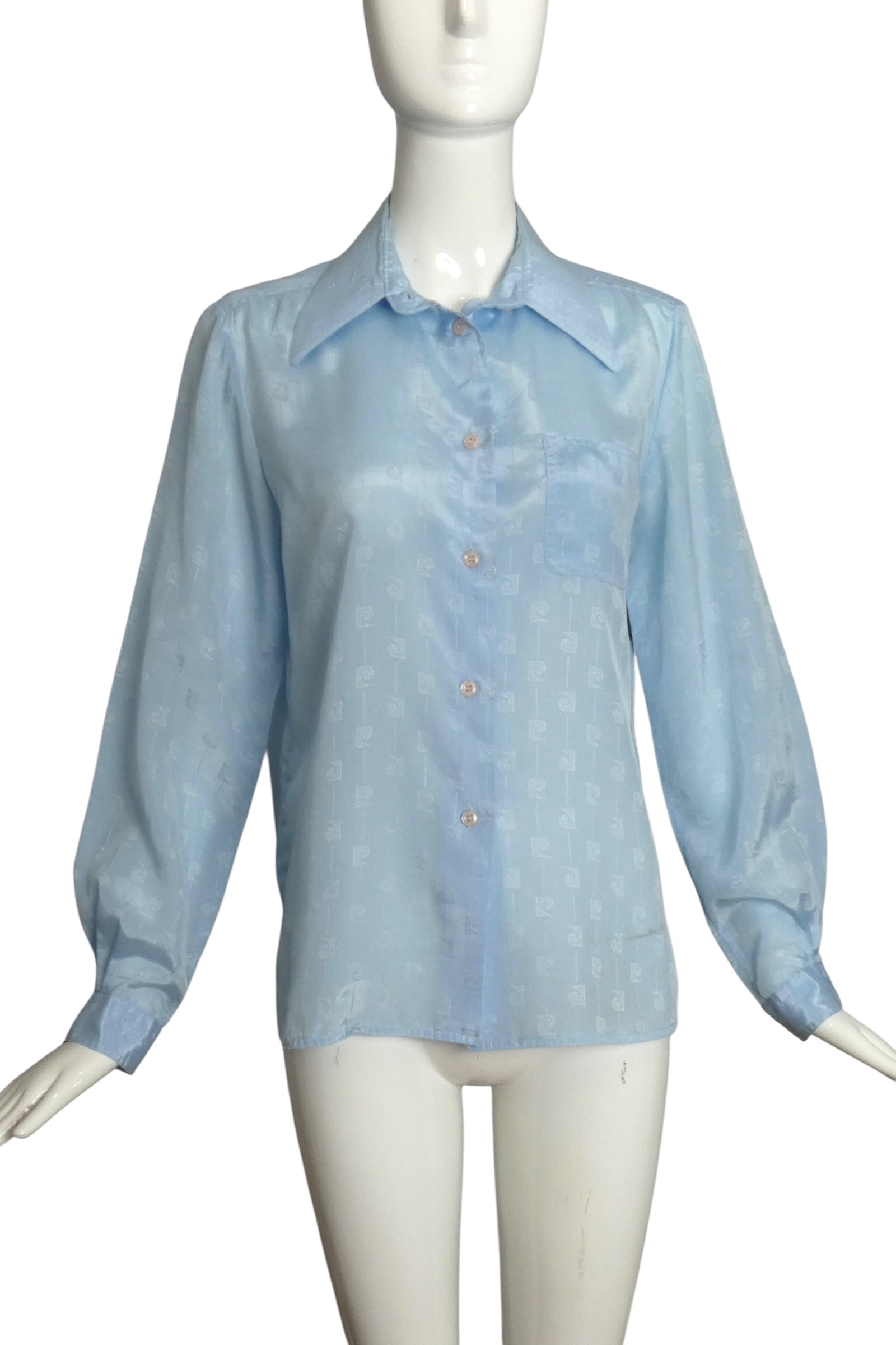 Description: Brighten your wardrobe with this playful 1980s Pierre Cardin blouse in a soft pale blue. Featuring a fun logo jacquard pattern, a classic spread collar, and button closures down the front, it blends vintage charm with everyday style. The chest patch pocket adds a quirky touch, making this blouse perfect for adding a splash of retro flair to any outfit.