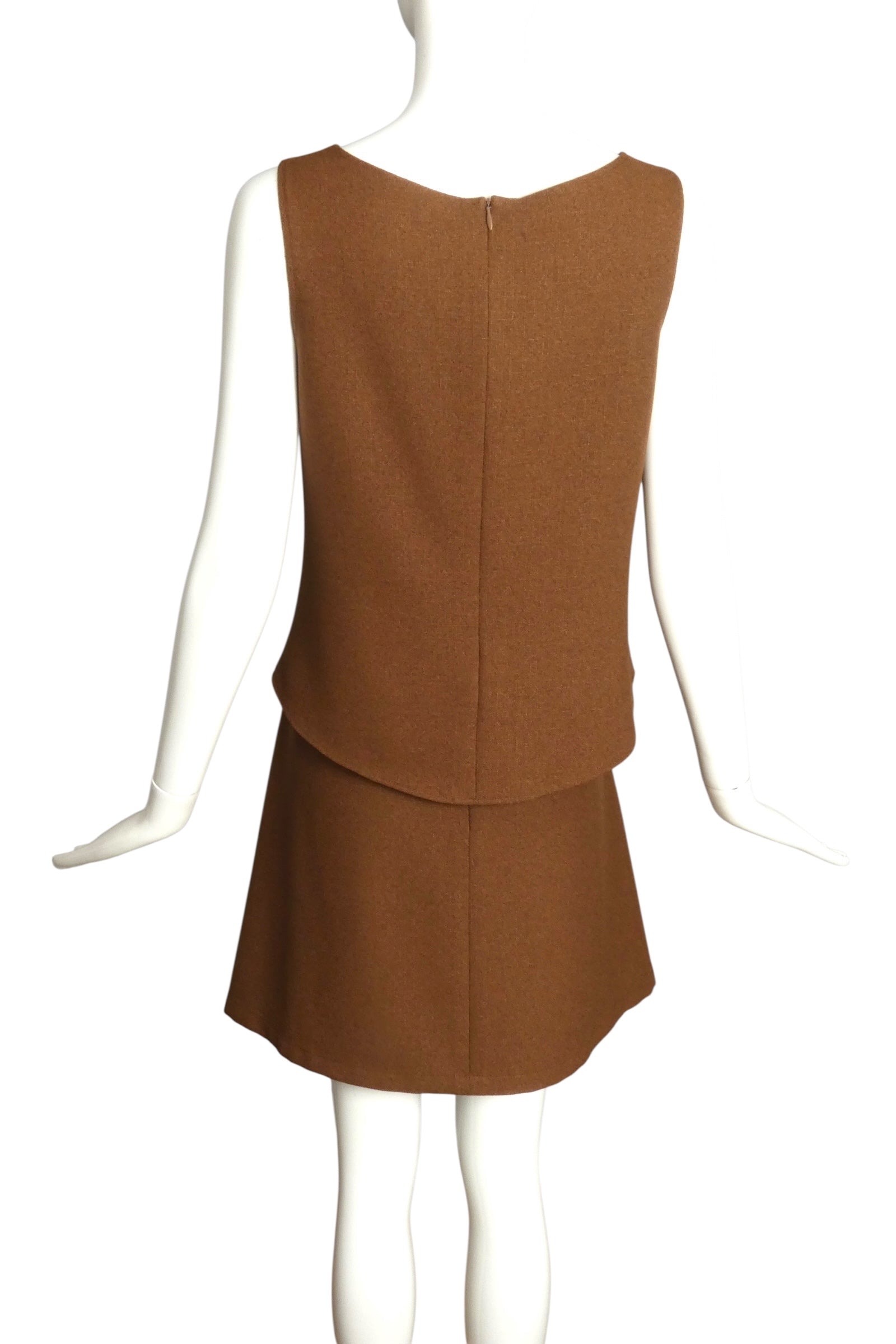 Description: This charming 1990s ensemble from Pierre Cardin Boutique features a playful brown sleeveless knit top with a scoop neckline and standout white grommet details down the front. The matching skirt hugs the waist and hips with darts for a flattering fit, all without a waistband for smooth comfort. Perfect for adding a quirky vintage vibe to your wardrobe!