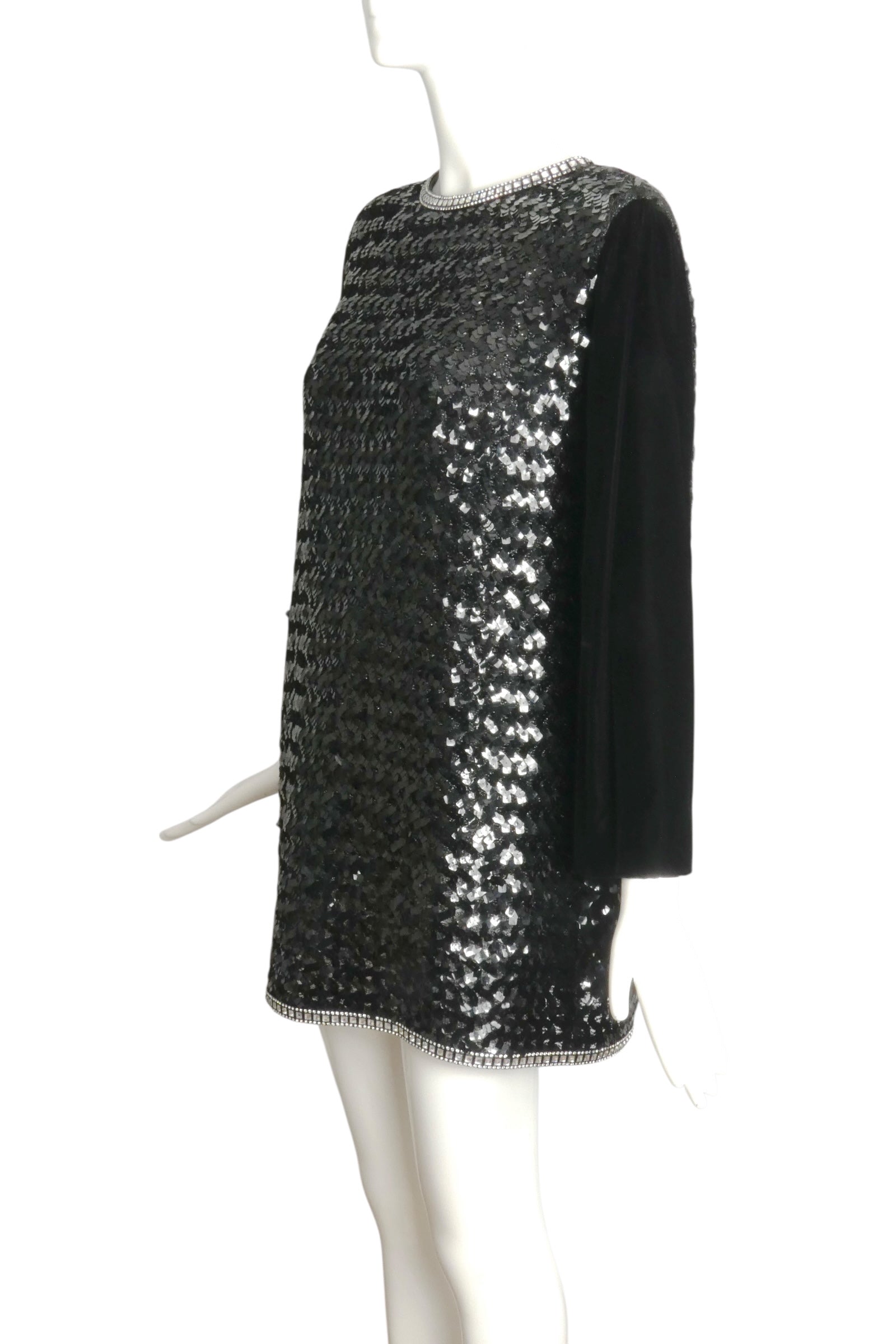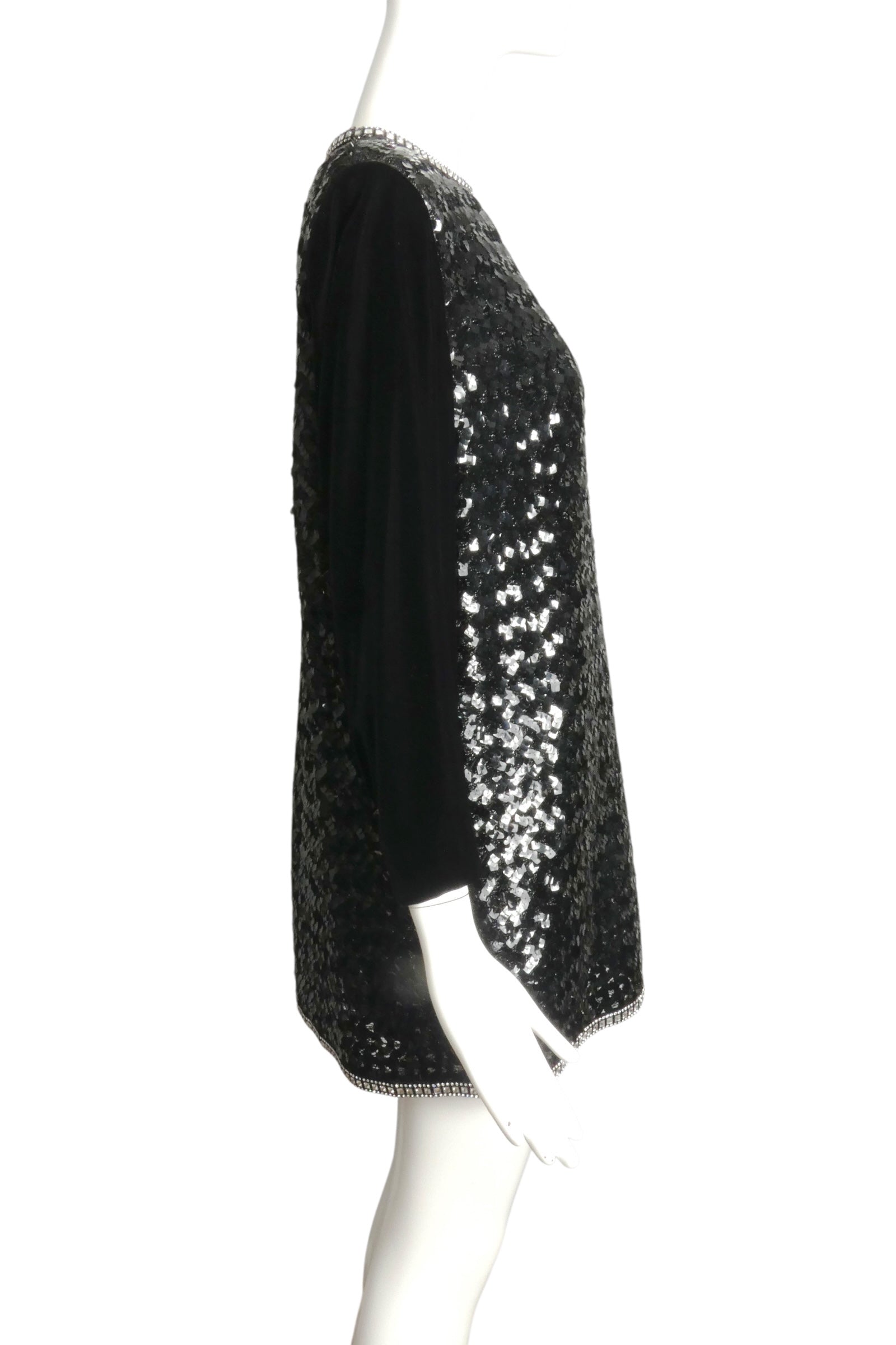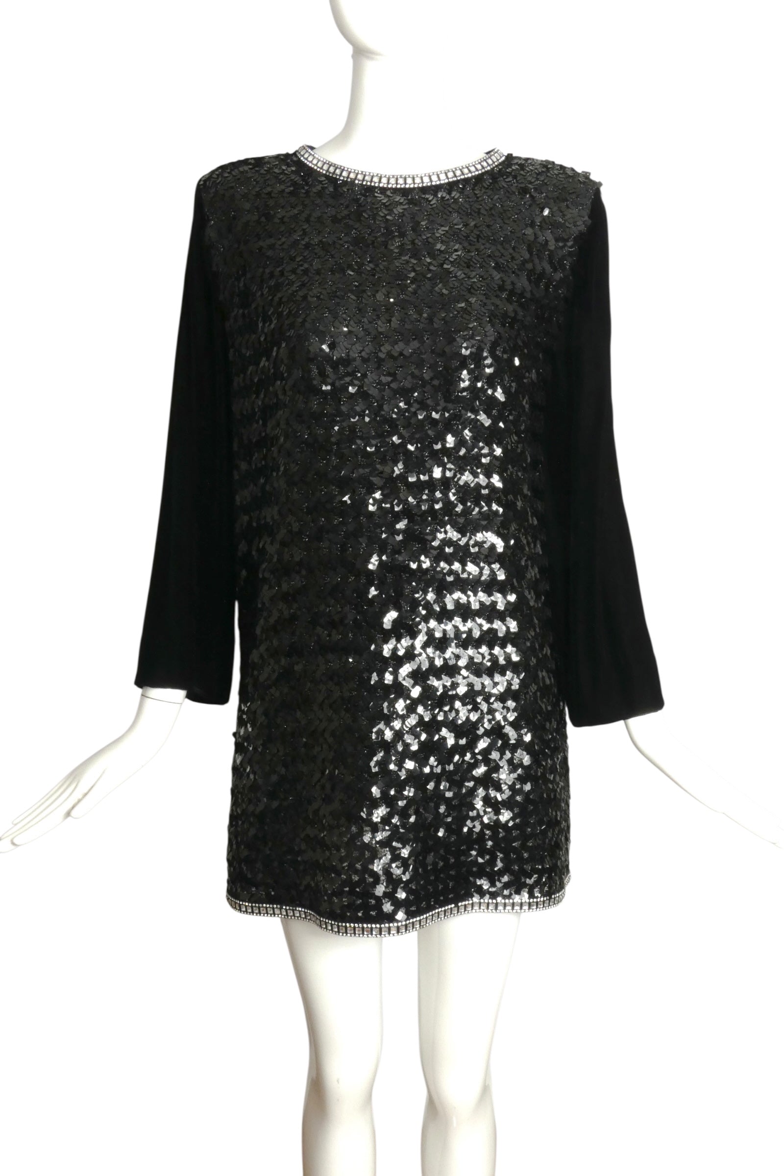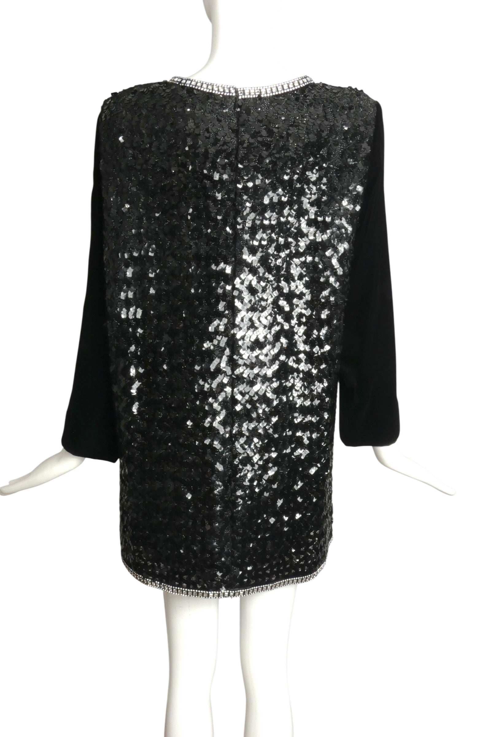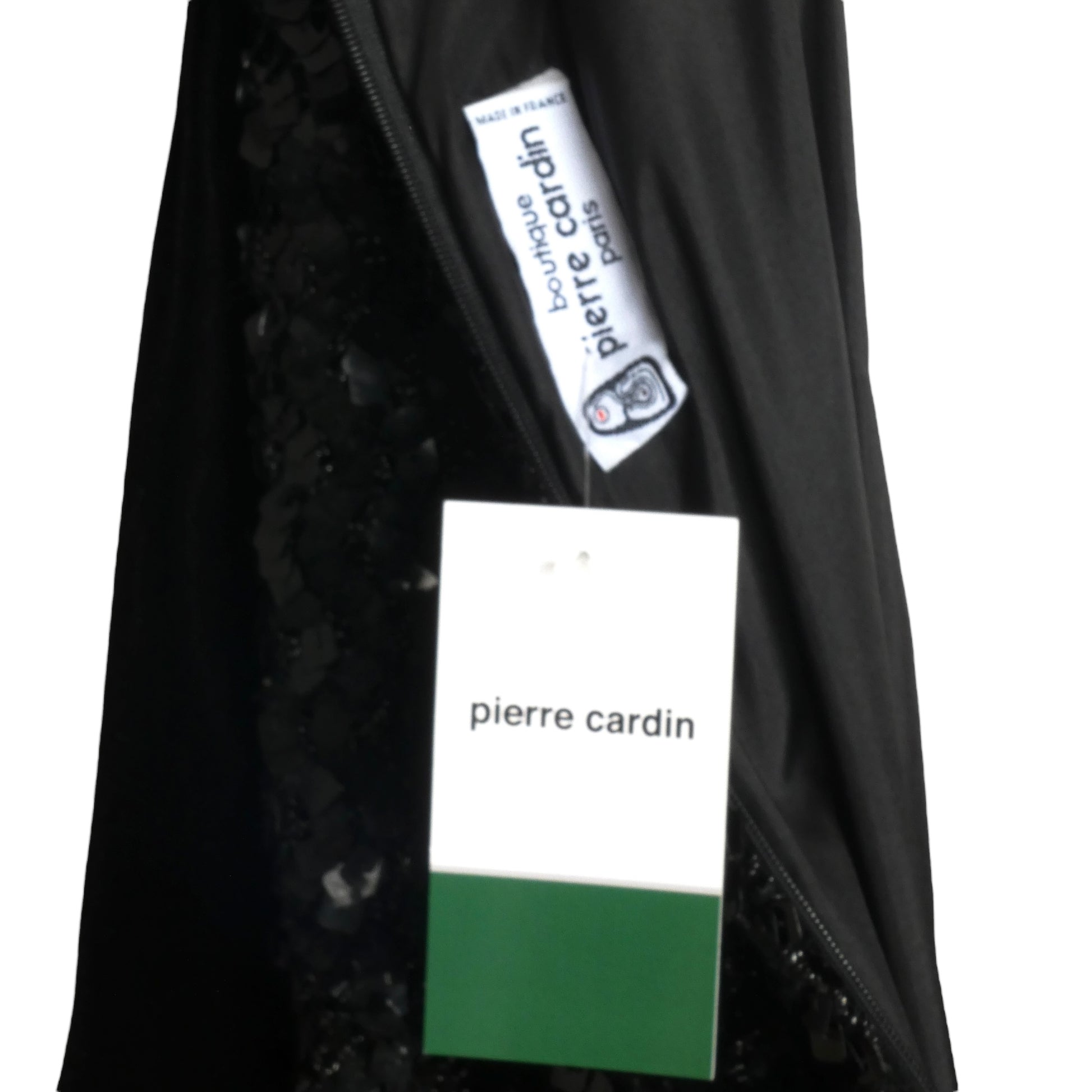Description: This exquisite 1990s cocktail dress from Pierre Cardin Boutique combines shimmering black sequins with elegant black velvet sleeves for a sophisticated look. Delicate rhinestones frame both the neckline and hemline, adding a refined sparkle that enhances its timeless appeal. Designed to flatter, this dress exemplifies expert craftsmanship and classic evening wear style.