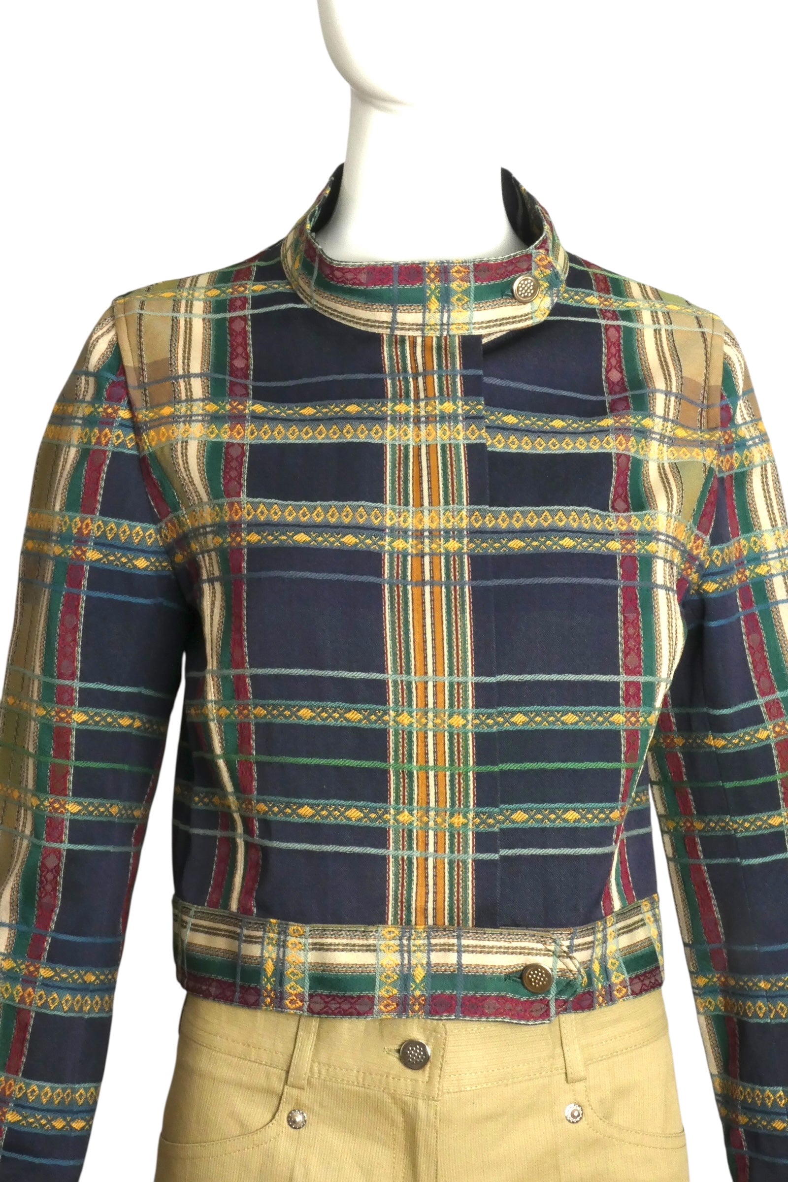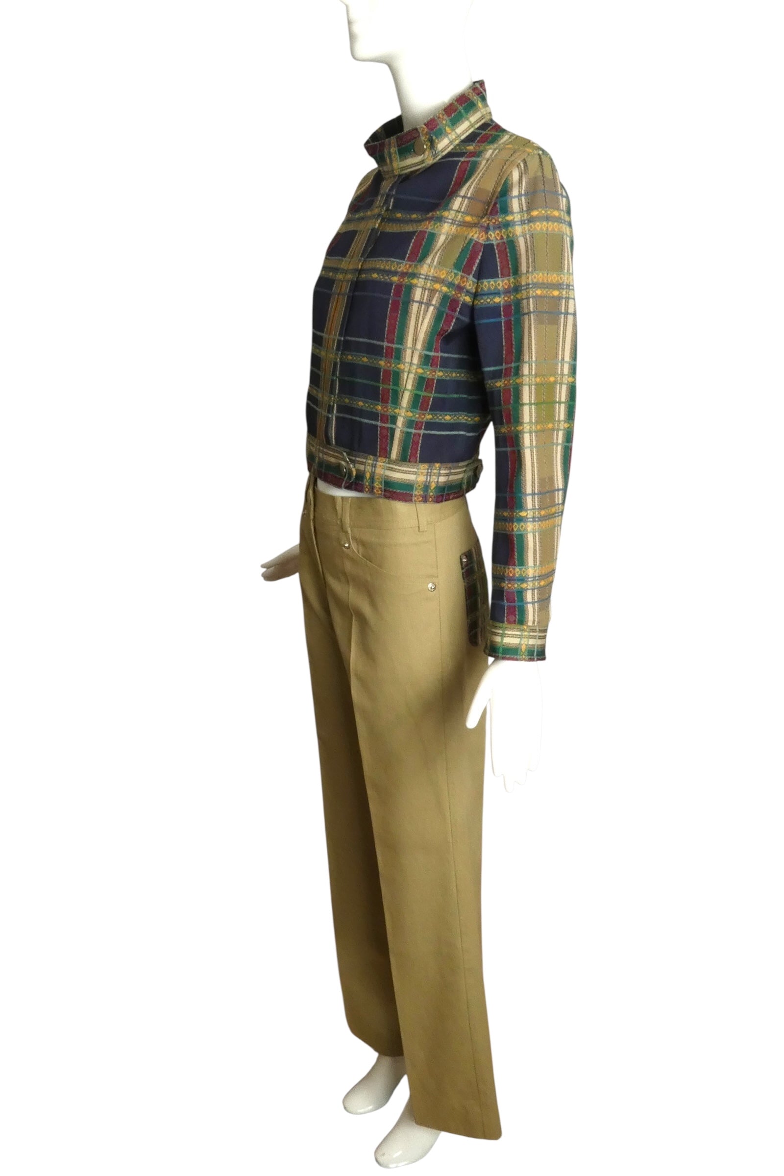 Description: This 1997 ensemble features a cotton brocade jacket with a plaid pattern paired with cotton twill pants. The jacket is tailored with a band collar secured by a side button, a hidden front zipper, and a wide waistband with a button closure, enhanced by princess seams for a flattering fit. Long sleeves finish with buttoned cuffs. The pants follow a jean cut, boasting a wide waistband with button closure, inset front pockets, and patch pockets at the back crafted from the same brocade fabric as the jacket, creating a cohesive and sophisticated look.