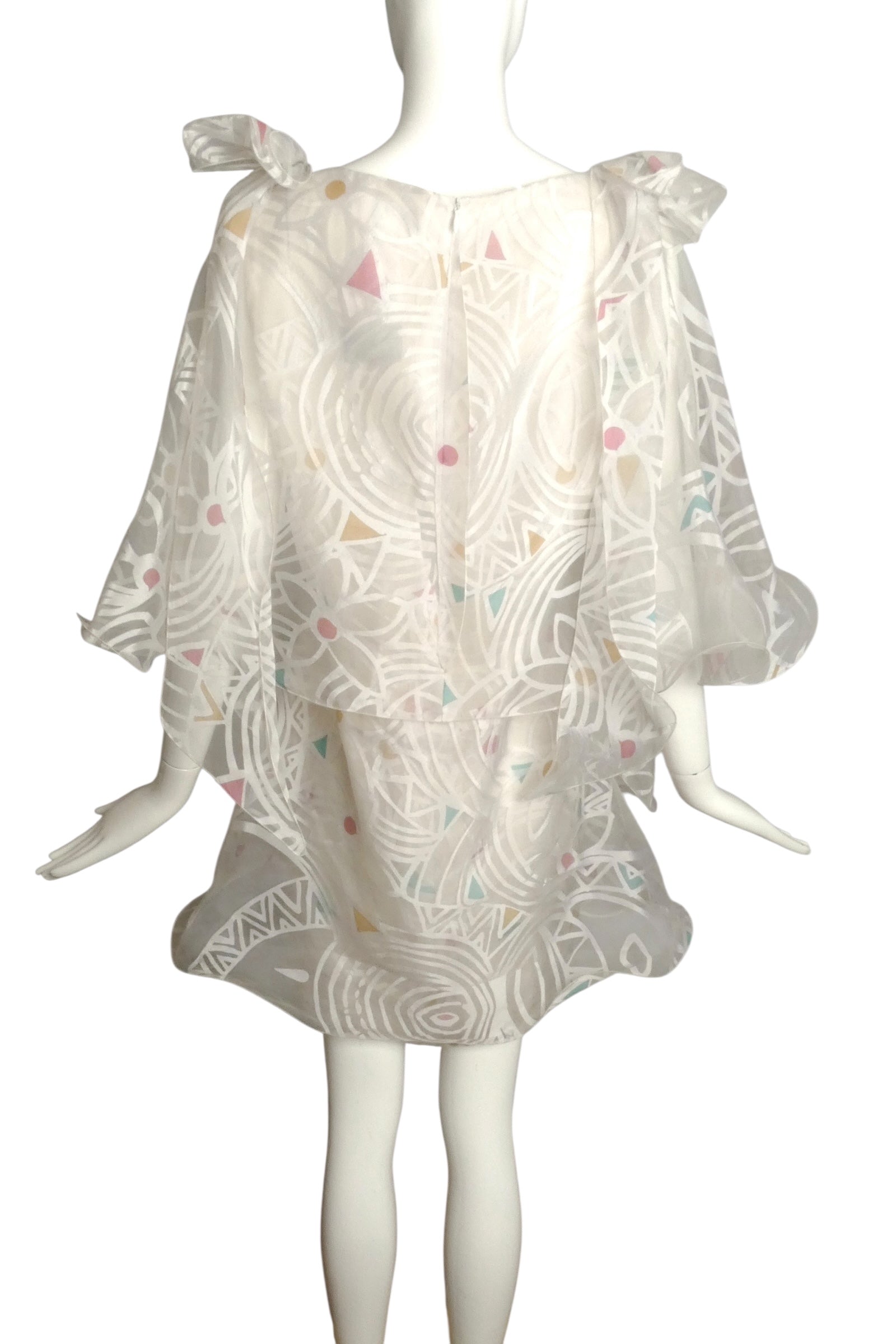 Description: This exquisite 1998 Pierre Cardin Boutique silk organza dress in size 8 features a white base embellished with a unique pattern combining flowers and colorful geometric shapes. The elegant bateau neckline complements its classic shift silhouette. Distinctive bias ruffles create a flowing cape effect over the shoulders, curving under the arms and circling around the lower back as one continuous ruffle. Delicate bows with long tails accentuate the front shoulders, adding a refined touch to this sophisticated party dress.